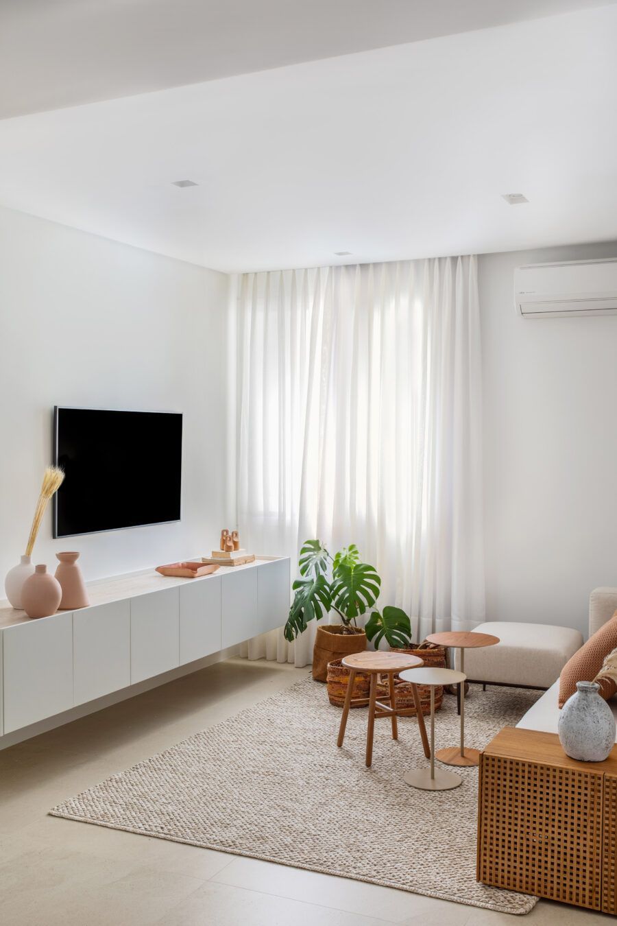 Um apartamento minimalista, integrado e com ambientes multifuncionais. Este foi o pedido da cliente para a arquiteta Janaina Sthel, que assina o projeto de 80m² em Copacabana, no Rio de Janeiro.