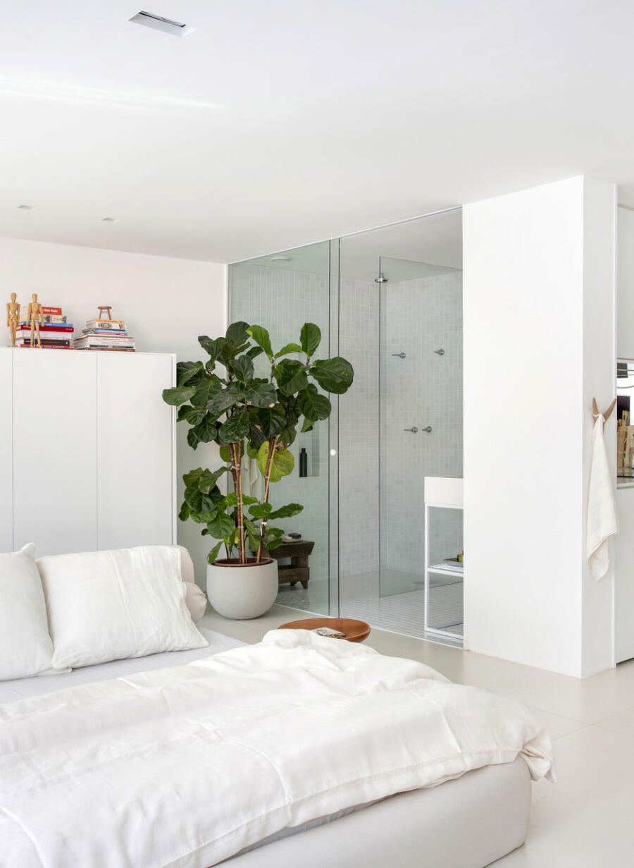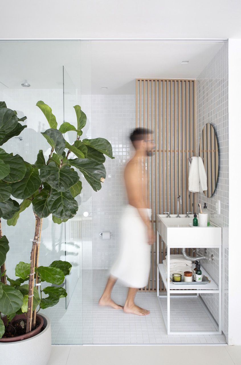 Para isso, todas as paredes foram derrubadas, ampliando a planta original visualmente. Como o banheiro não tinha grande entrada de iluminação natural, sua parede voltada para a sala também foi substituída por painéis de vidro do chão ao teto.
