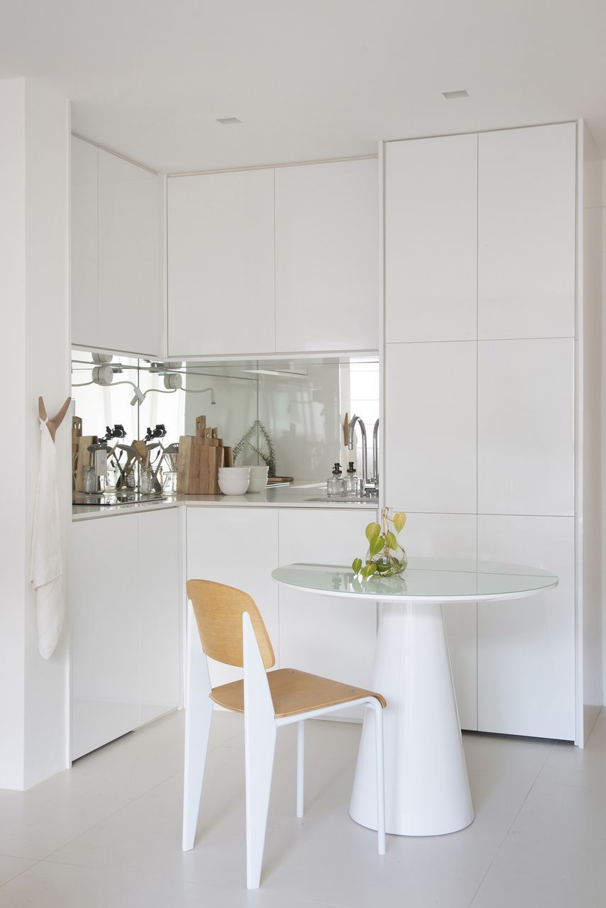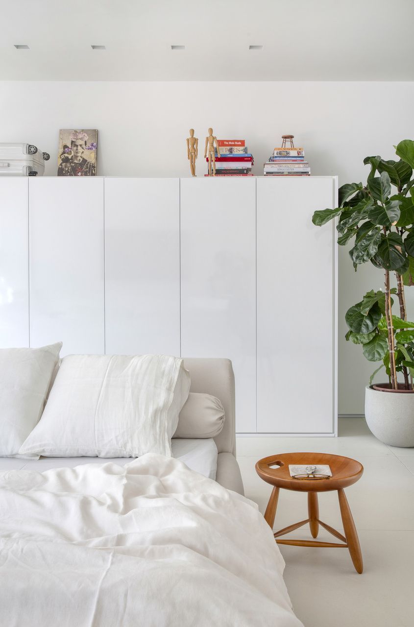 Como o apartamento tem pouca metragem, os arquitetos explicam que o ideal é reduzir a quantidade de móveis e investir em peças com design mais baixo, reforçando o tom minimalista da decoração.