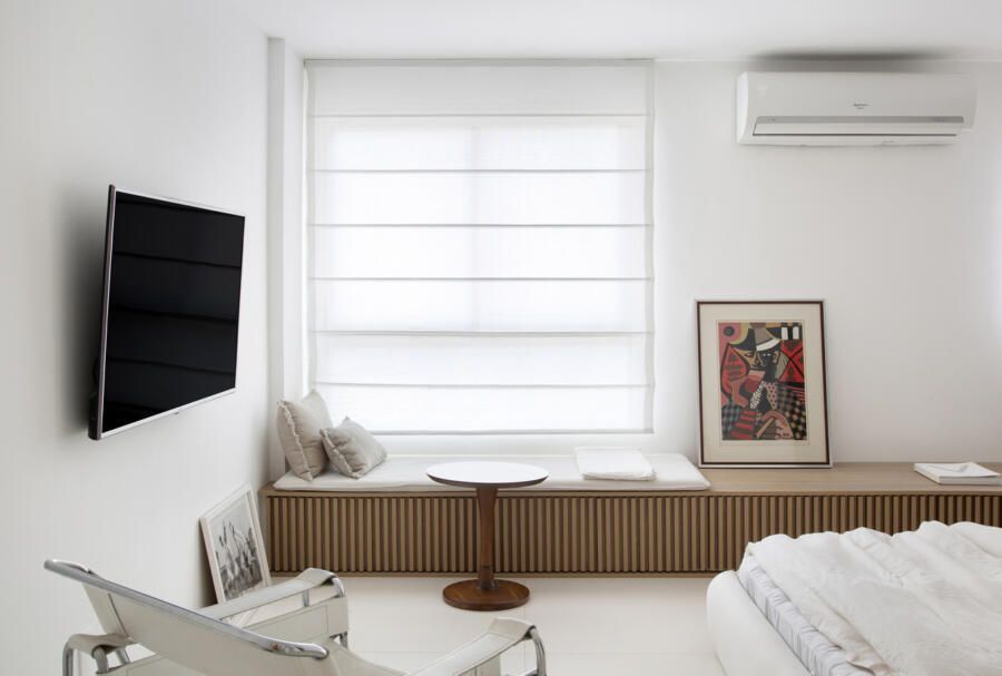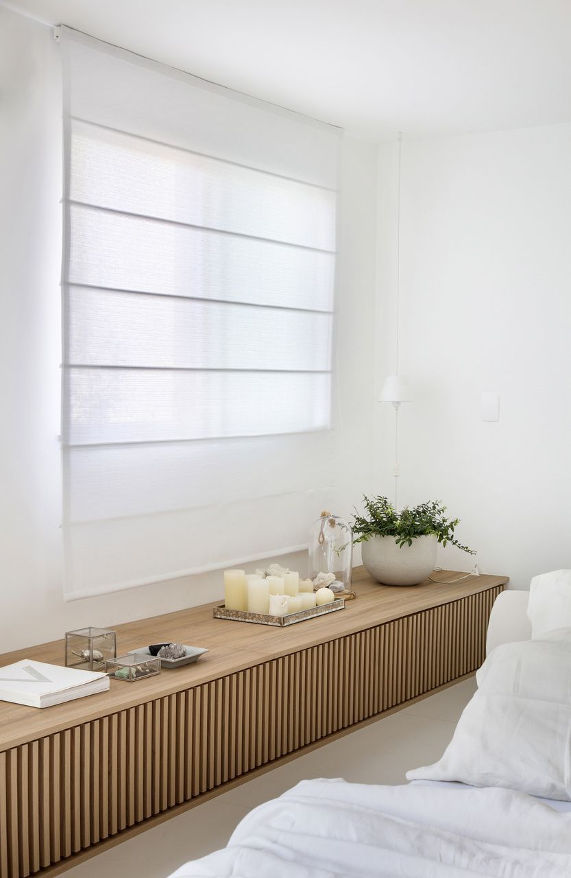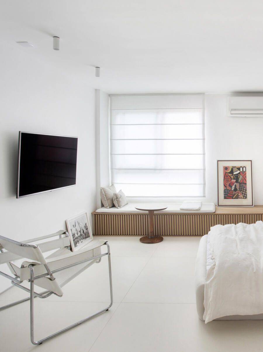 “O banco baixo ripado que se extende por toda a parede onde ficam as duas janelas também funciona como aparador para apoiar livros e objetos, e ainda conta com espaço de armazenamento embaixo para guardar roupa de cama ou calçados.”