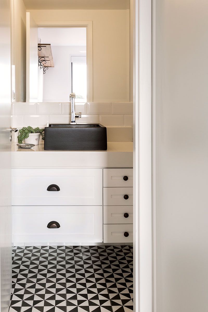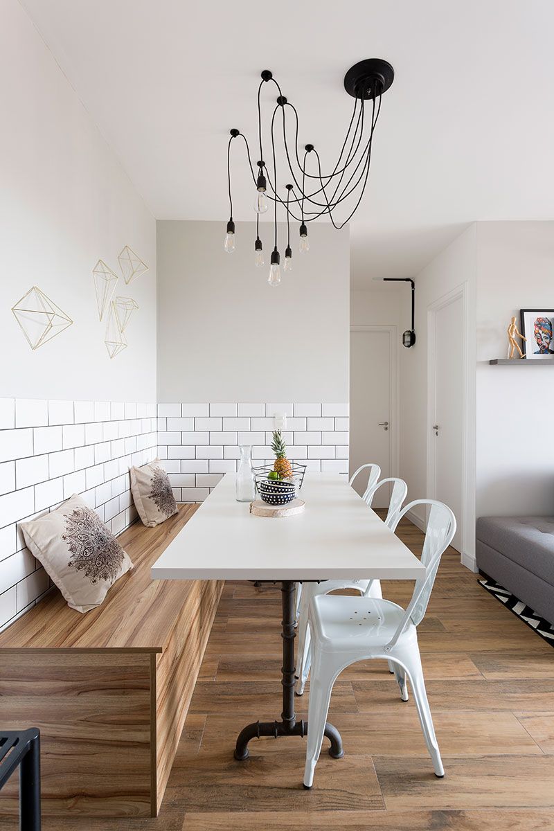 O estilo escandinavo tem como predominância uma base branca e leve. A Laje 54 trabalhou essa base nos armários, almofadas, puxadores e com a geometria. O revestimento já lembra mais o estilo industrial, mas a cor branca ajudou na composição da base escandinava.