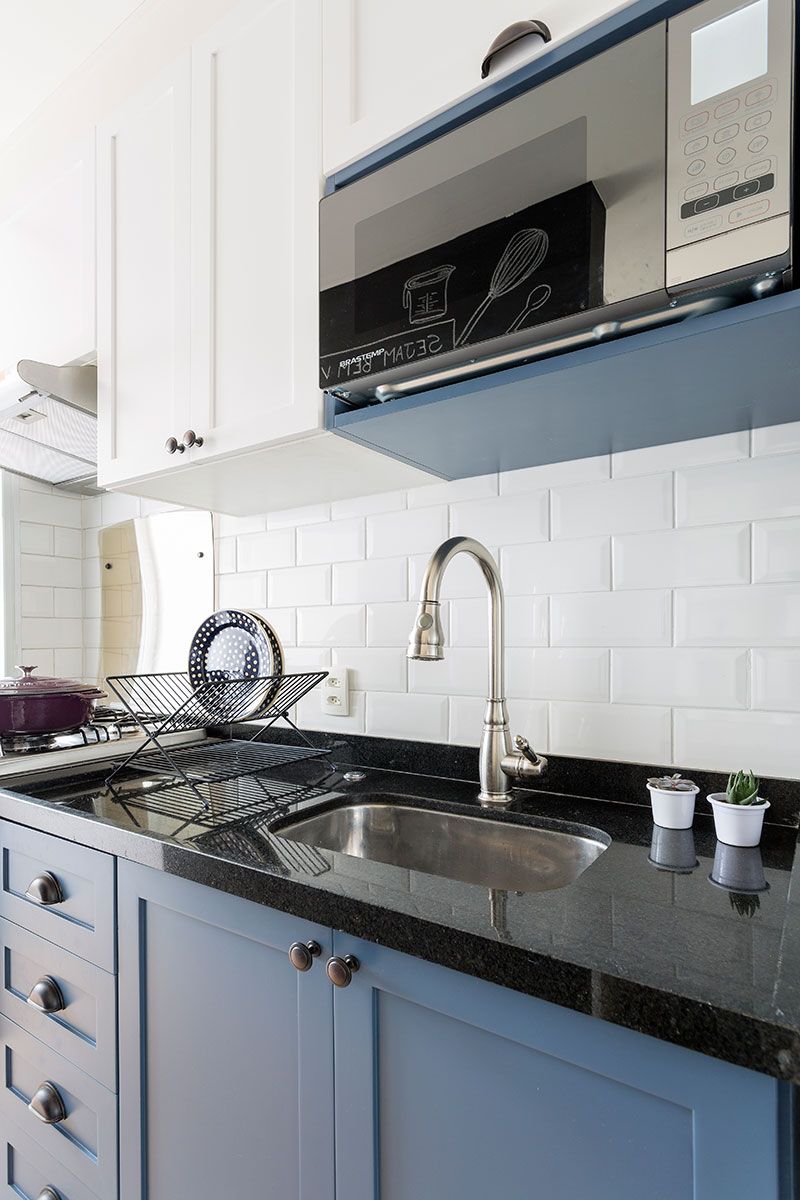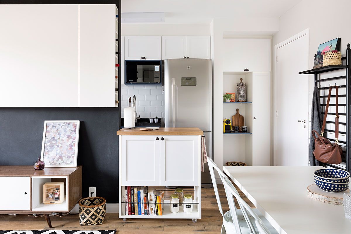 O estilo escandinavo tem como predominância uma base branca e leve. A Laje 54 trabalhou essa base nos armários, almofadas, puxadores e com a geometria. O revestimento já lembra mais o estilo industrial, mas a cor branca ajudou na composição da base escandinava.