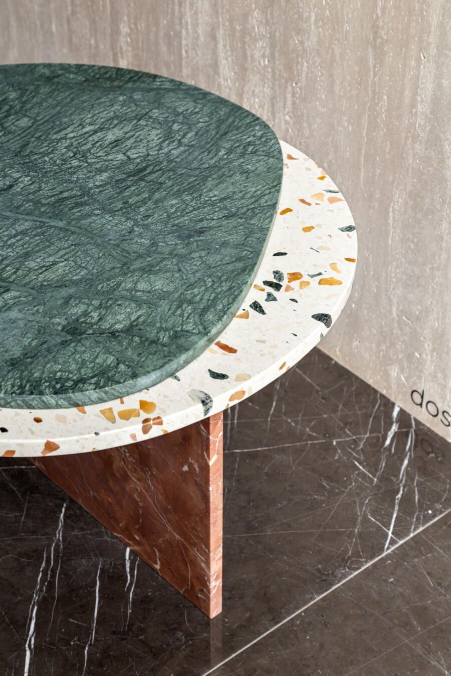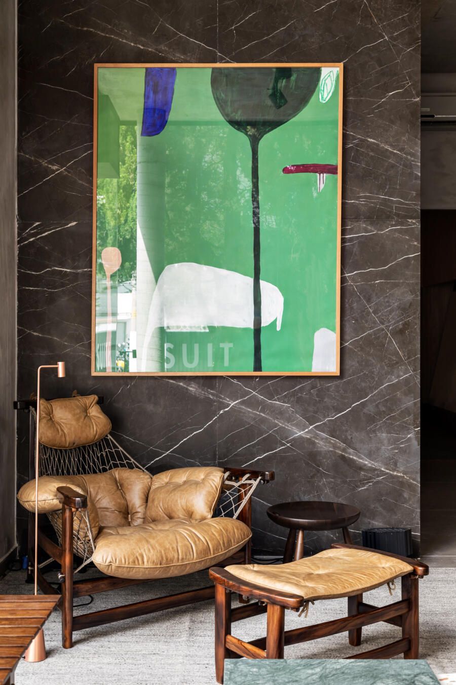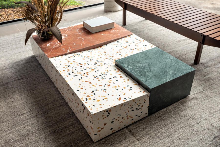 Para o mobiliário, móveis exclusivos e desenhados pelo escritório Suíte Arquitetos. A mesa central se chama Rampa, e une um mix de materiais da NPK: mármore Verde Guatemala, mármore Rosso Alicante e o Agglotech Murano, lançamento da marca. Já a mesa lateral, nomeada Mesa Envelope, foi feita pela união do mármore Verde Guatemala com o Agglotech Lido, também lançamento. Peças que entregam conforto, aconchego e formas geométricas marcantes.