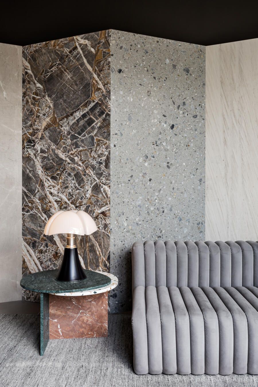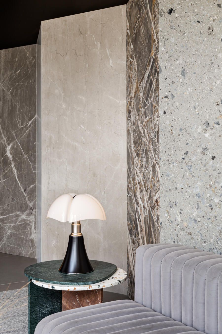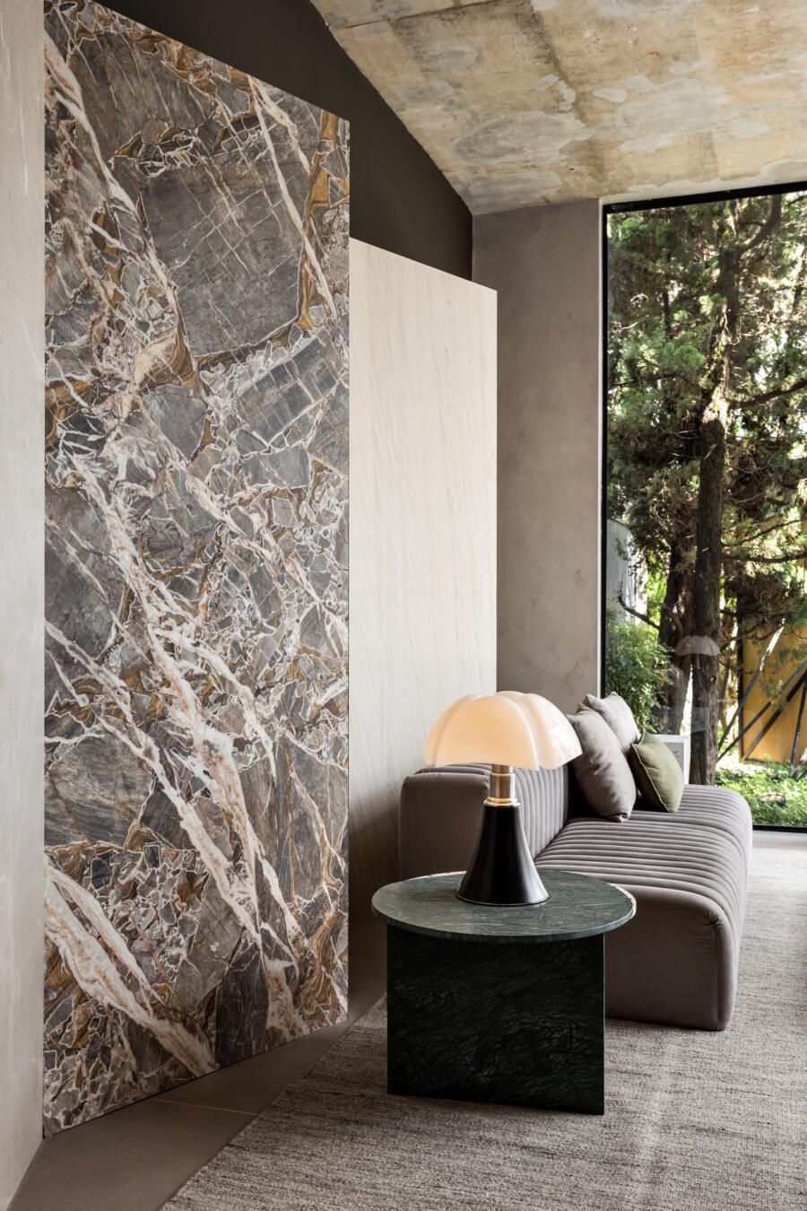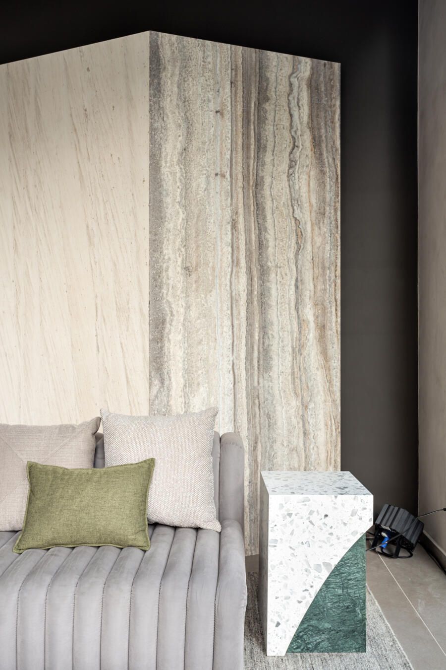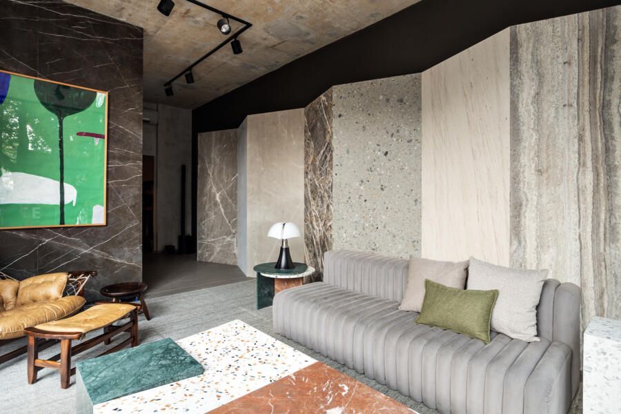 As pedras naturais vão desde os clássicos Travertino e Limestone até cores mais ousadas, como o Mármore Verde Guatemala e Rosso. A linha NPK Tech, que conta com soluções tecnológicas, também foi incluída no projeto, com destaque para o lançamento Terrazo, parceria exclusiva da NPK com a indústria italiana Agglotech.