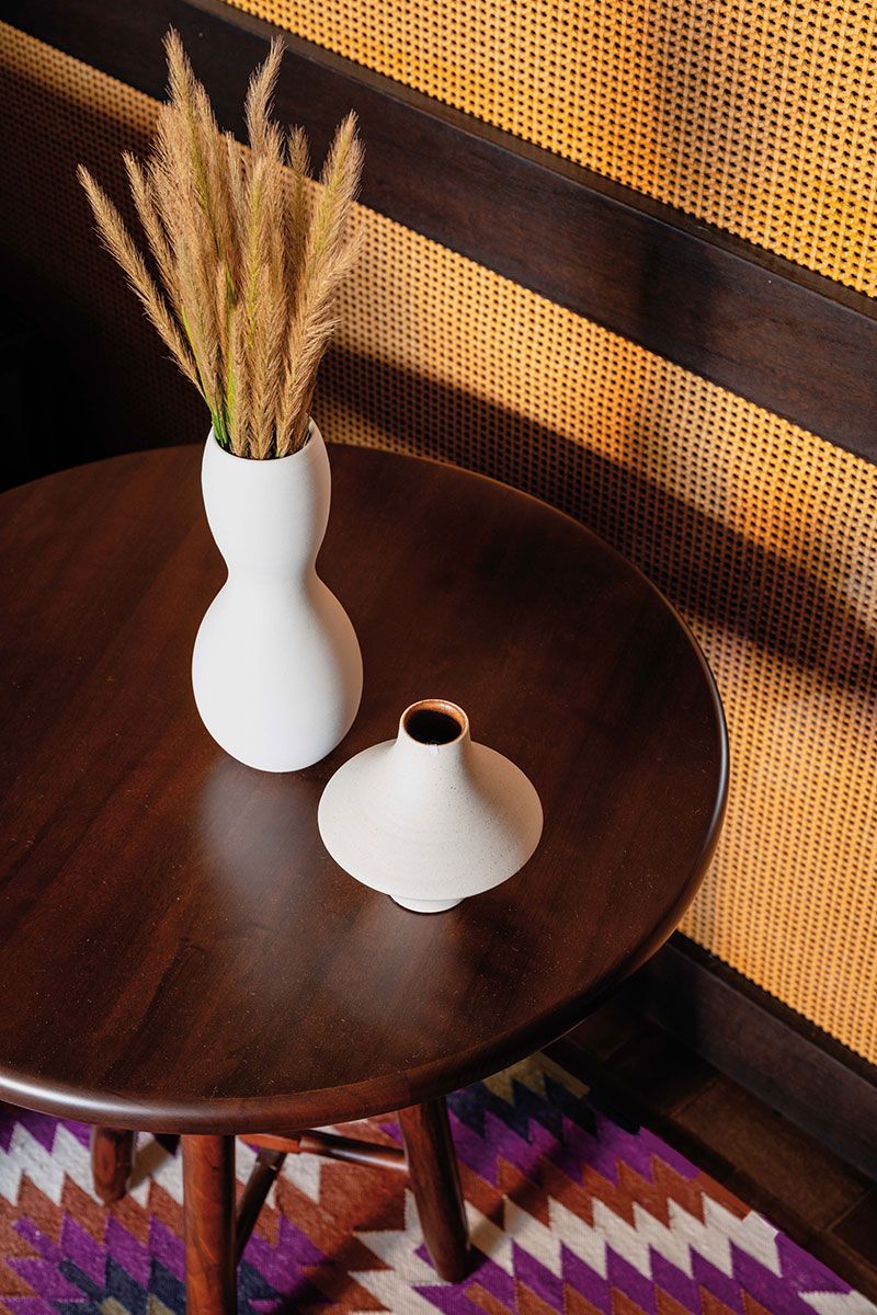Um dos destaques do apartamento é a ampla sala, que ganhou alguns m² graças as paredes que foram derrubadas. A área pode ser isolada por meio de portas de correr com acabamento em palhinha e vidro.