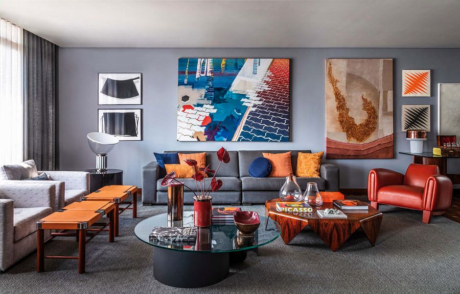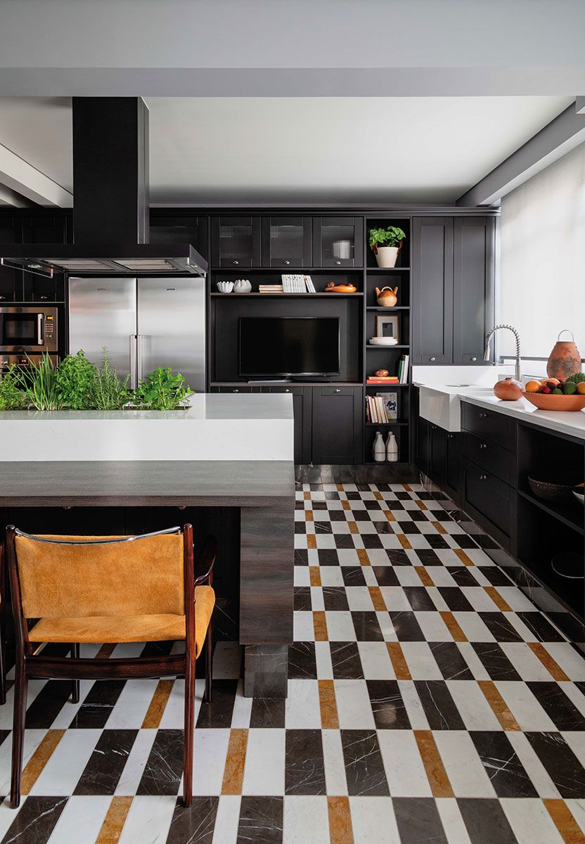 Escolhi peças clássicas e contemporâneas que se misturam criando um mix elegante e convidativo. Materiais como mármores também pontuam o projeto.