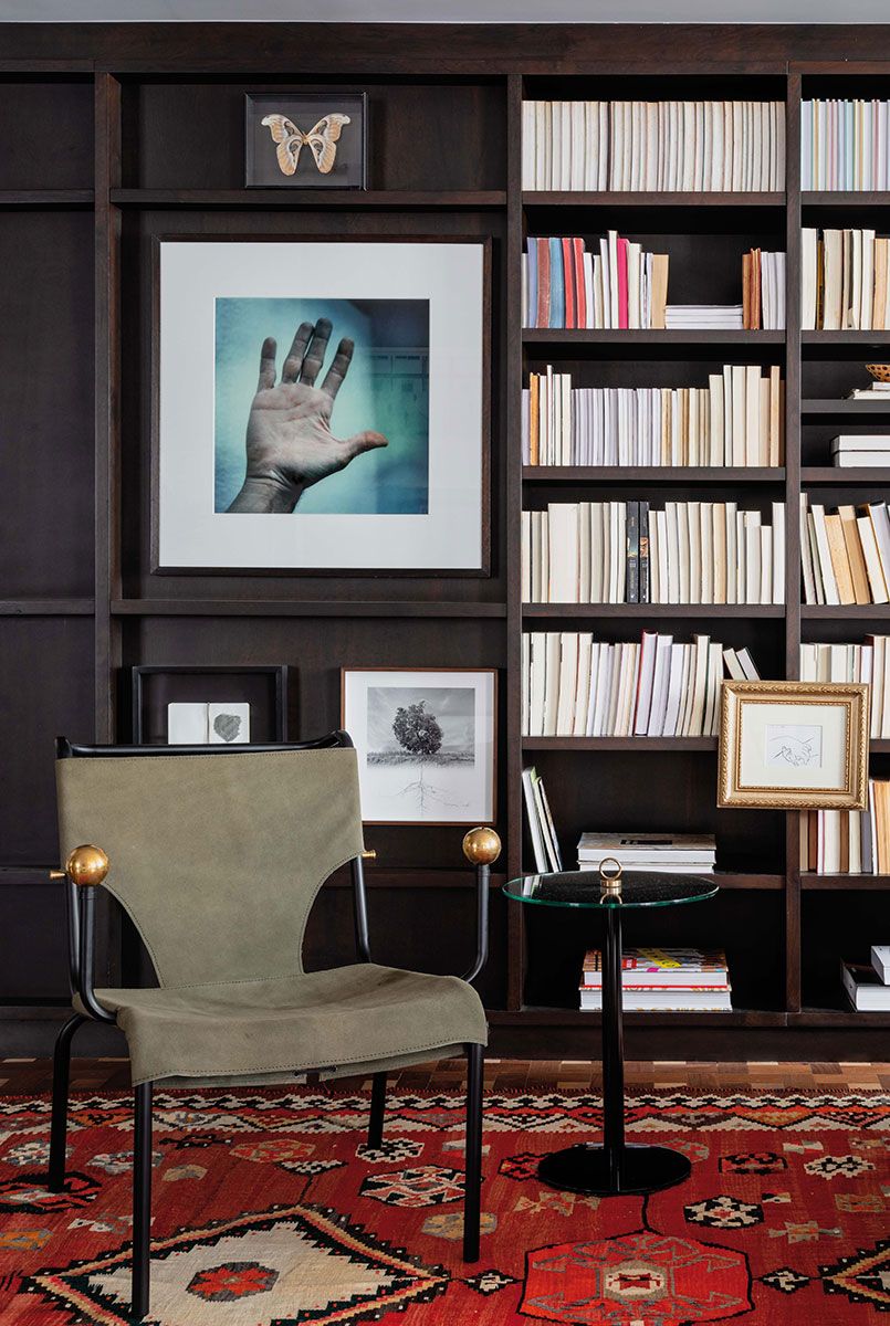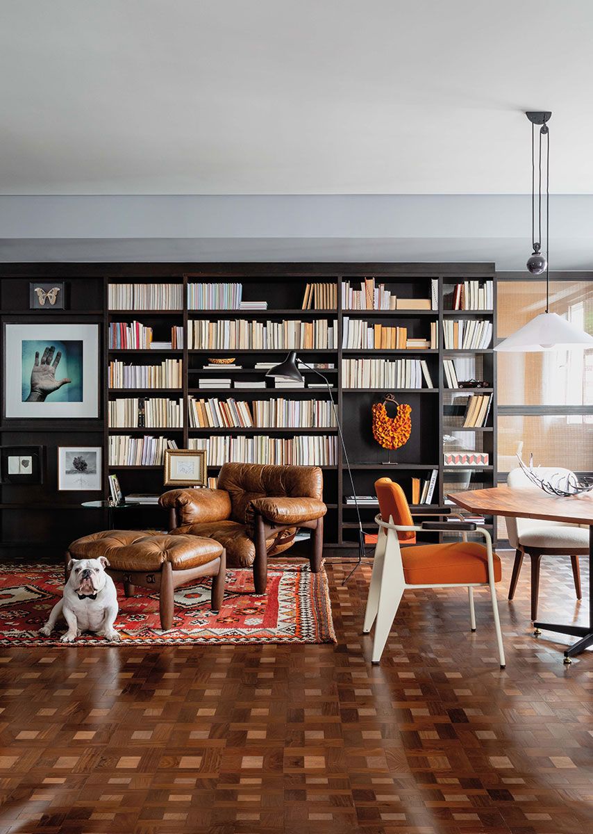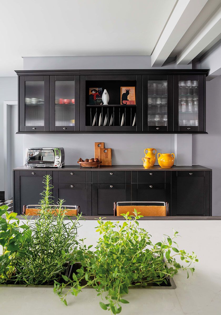 Revestimentos e peças de mobiliário escuras ditam o tom sóbrio e aconchegante do projeto. As peças garimpadas em antiquários e mobiliário com design assinado dão charme aos espaços.