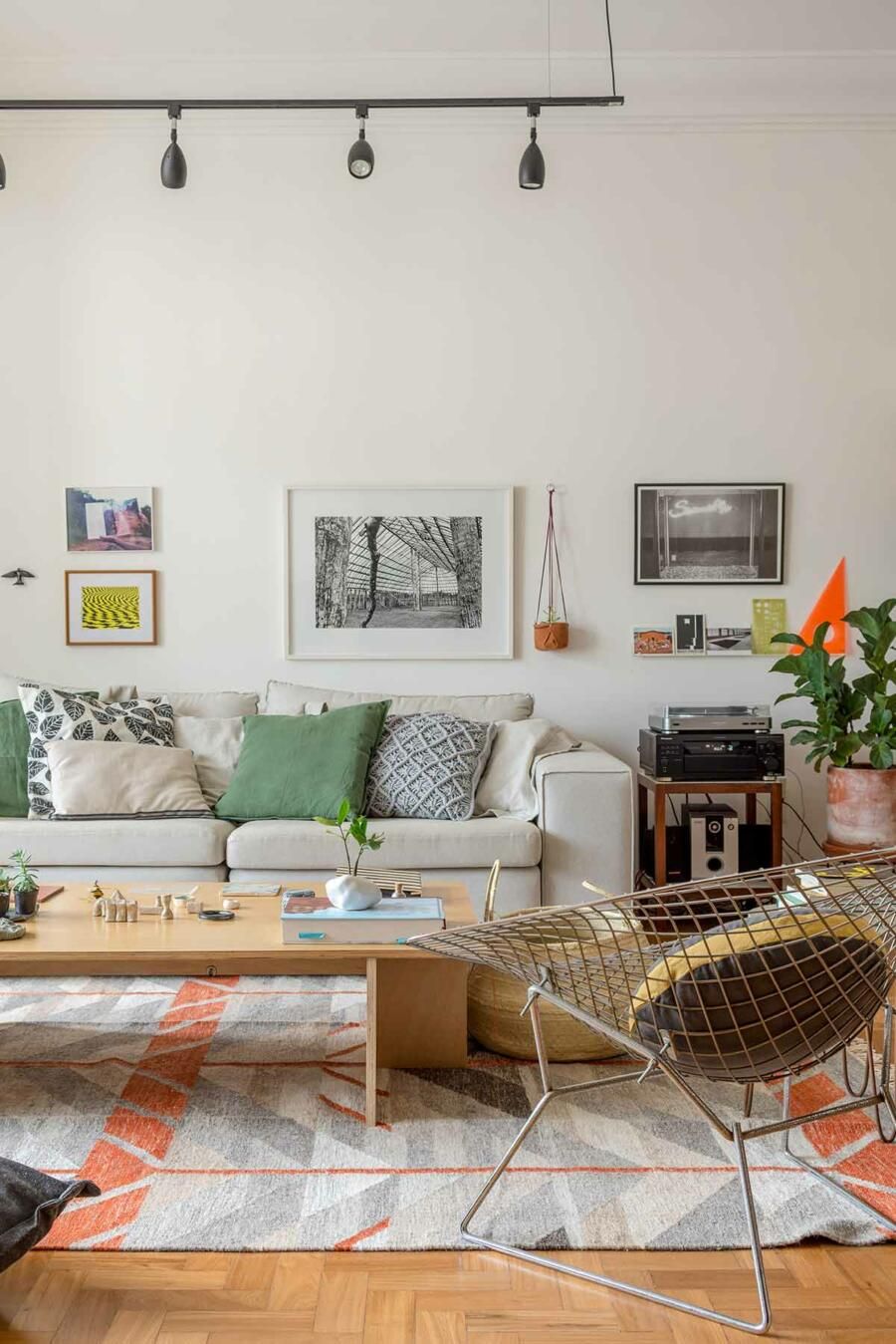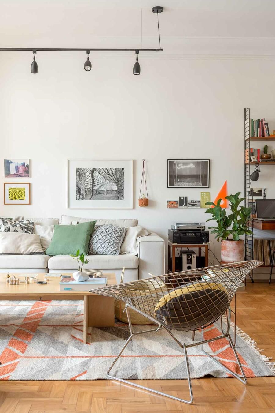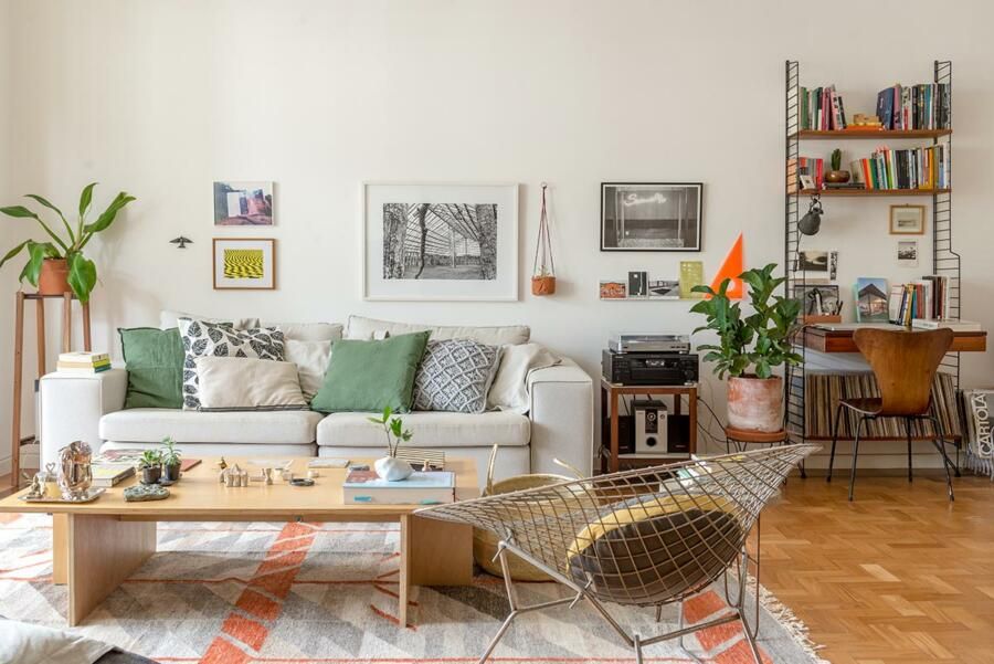 Algumas sacadas ficam por conta da seleção do mobiliário que contou com alguns achados, como a estante de design escandinavo comprada de 2º mão e completamente reformada.