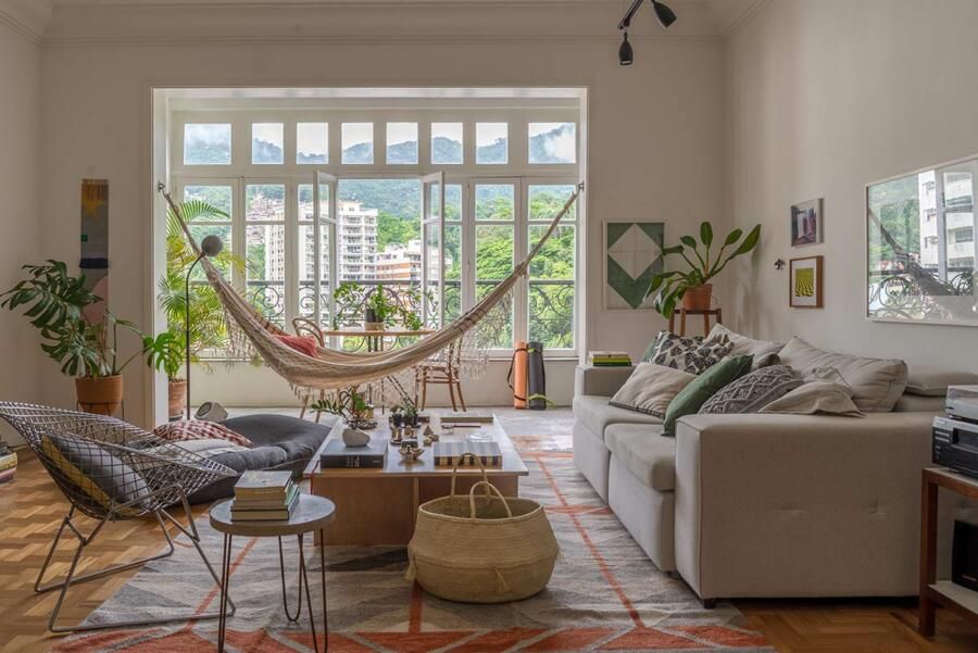 Localizado em um prédio clássico e tradicional em Laranjeiras no Rio de Janeiro, o apê teve suas estruturas e alguns revestimentos preservados.