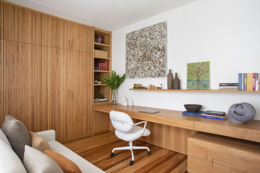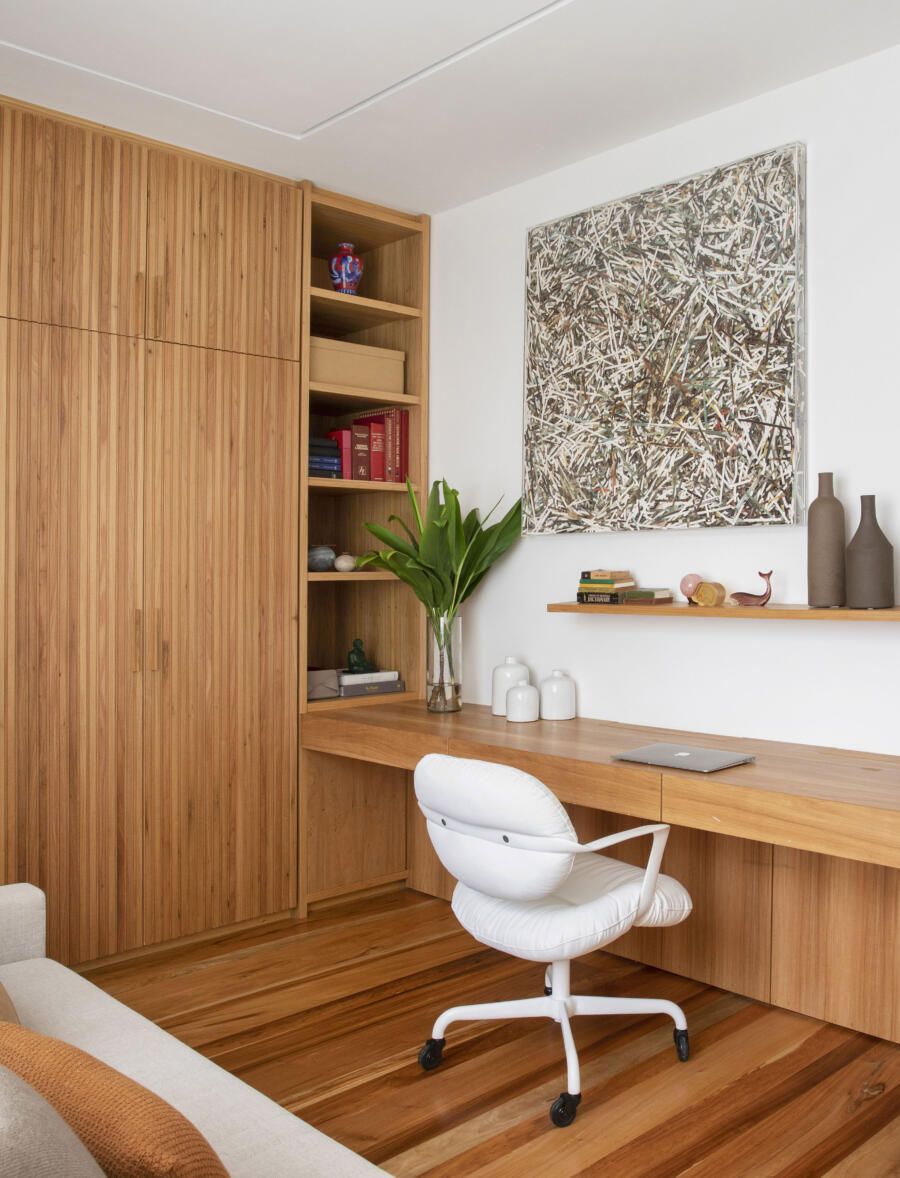 Para isso, toda a área íntima teve que ser reformada, incluindo a alvenaria. A sala de estar aumentou com a junção de um antigo quarto e outro quarto foi transformado em escritório. Já na suíte do casal, parte do banheiro foi transformado em closet, um dos desejos dos clientes.