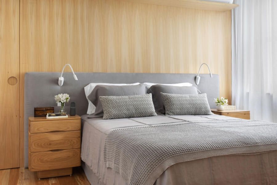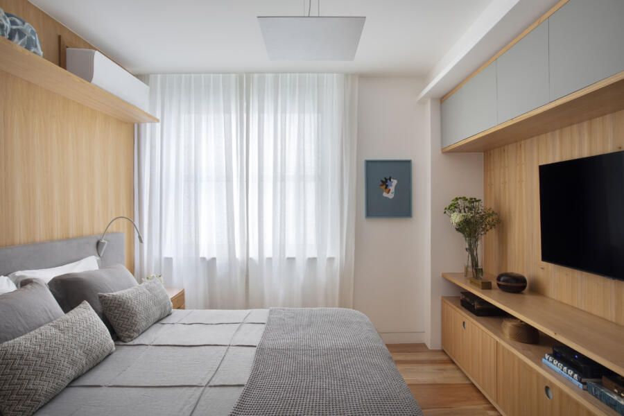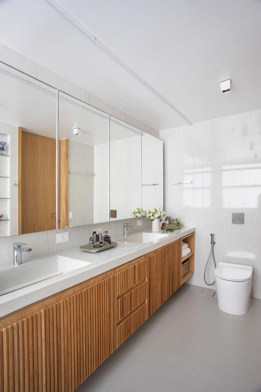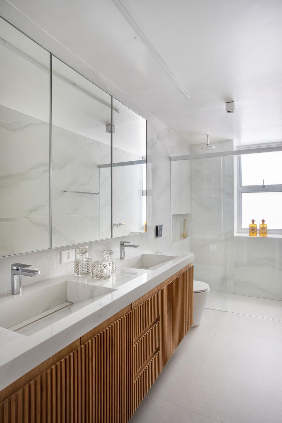 “Os clientes queriam ter muito espaço de armários, conforto para ver TV sozinhos ou com os netos, além de banheiros claros e clean, pois os antigos tinham materiais escuros. Eles também pediram ao escritório para encaixar no projeto duas adegas grandes que já possuíam.”
