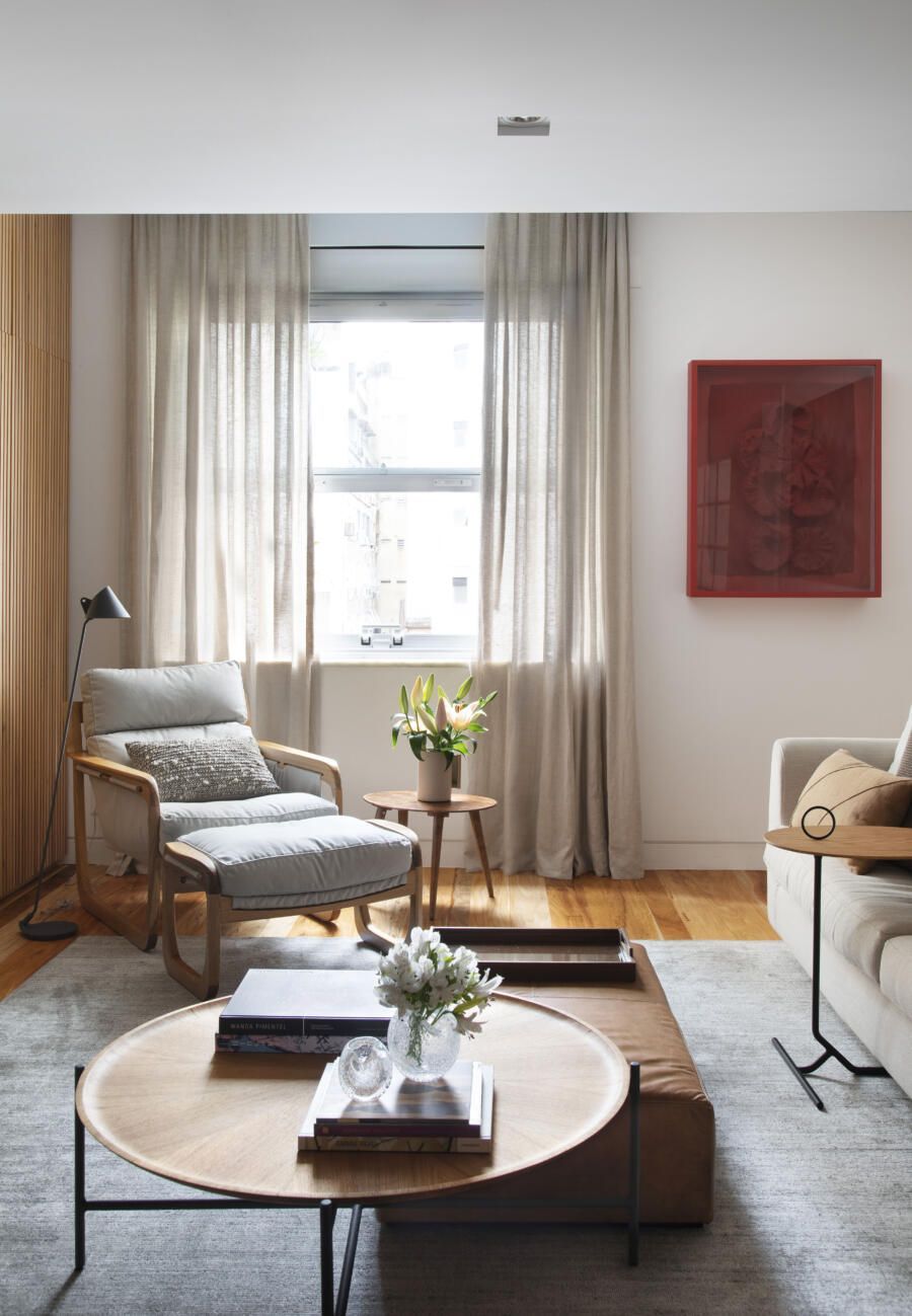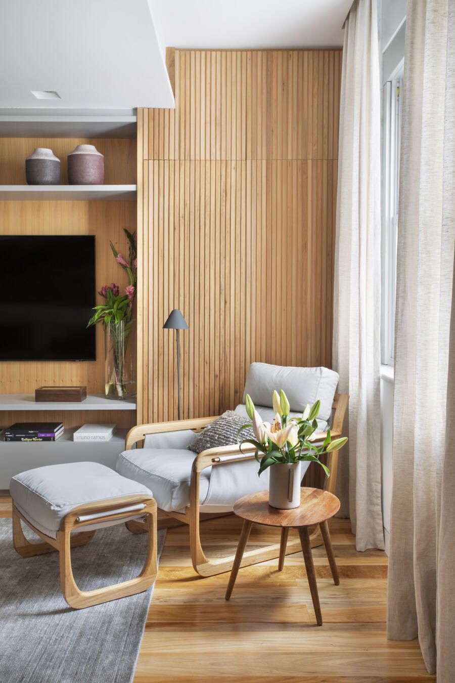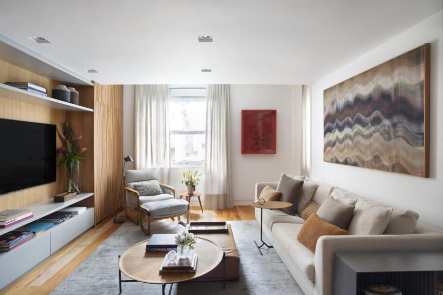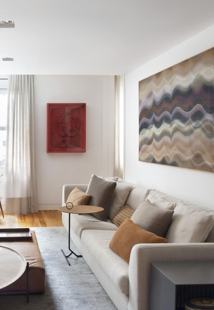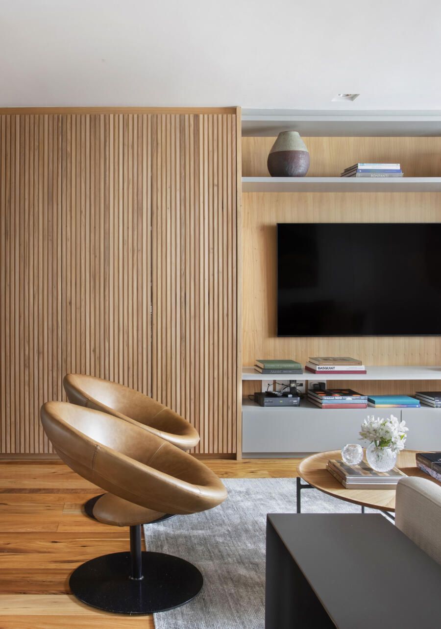 “Privilegiamos o mobiliário brasileiro contemporâneo, que é uma de nossas paixões. Destaque para a chaise Pitu, de Aristeu Pires, que é uma aula de ergonomia e conforto, e também para as poltronas Anel 80’s, de Ricardo Fasanello, icônicas do design brasileiro dos anos 80. Este apartamento foi comprado na planta nos anos 70 e, na época, o projeto de interiores foi feito pela grande arquiteta Janete Costa, que era muito amiga do casal. Ficamos muito honrados com a oportunidade de dar continuidade à essa história.”
