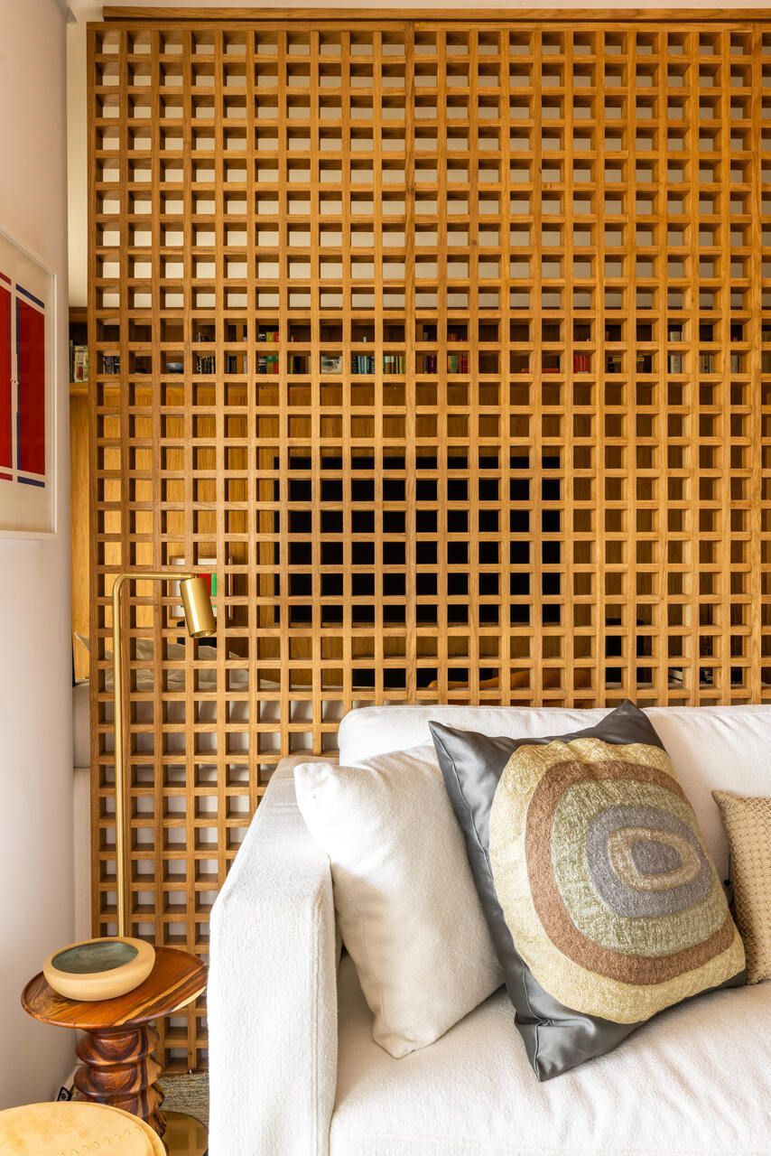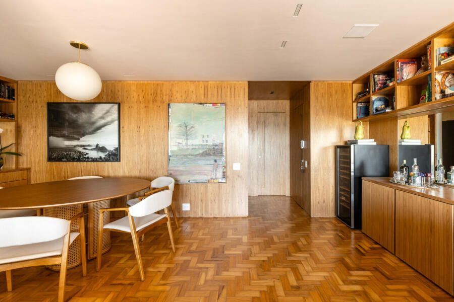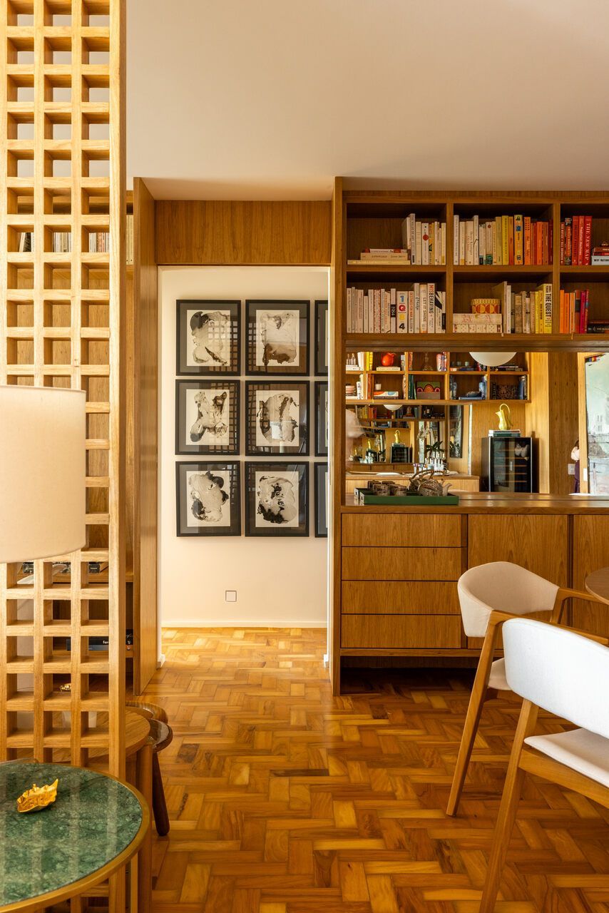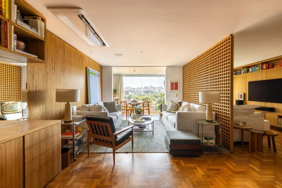 Na busca por manter a identidade do imóvel, o piso de taco de madeira original foi restaurado, agregando charme e autenticidade ao projeto. Para complementar, painéis de madeira freijó revestem a sala, criando uma atmosfera elegante e acolhedora. Outro destaque é a divisória em muxarabi, uma solução funcional e esteticamente marcante que trouxe leveza e fluidez entre os espaços.
