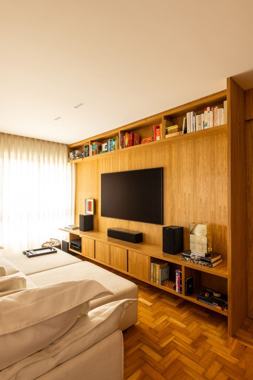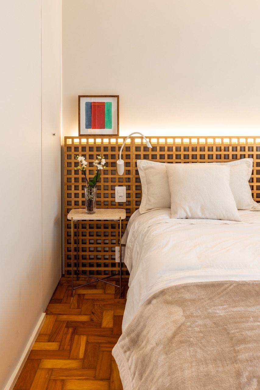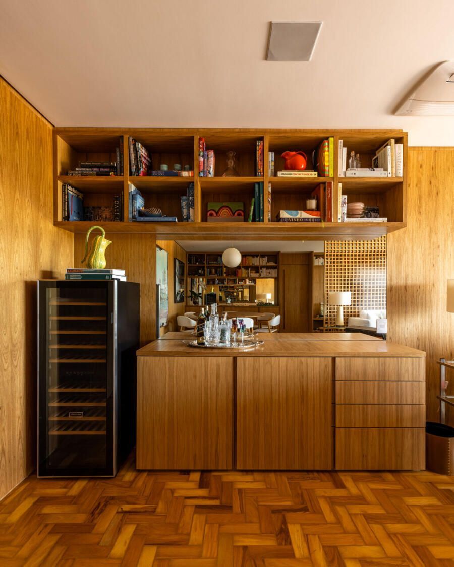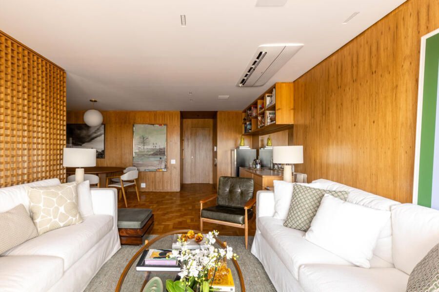 Na busca por manter a identidade do imóvel, o piso de taco de madeira original foi restaurado, agregando charme e autenticidade ao projeto. Para complementar, painéis de madeira freijó revestem a sala, criando uma atmosfera elegante e acolhedora. Outro destaque é a divisória em muxarabi, uma solução funcional e esteticamente marcante que trouxe leveza e fluidez entre os espaços.