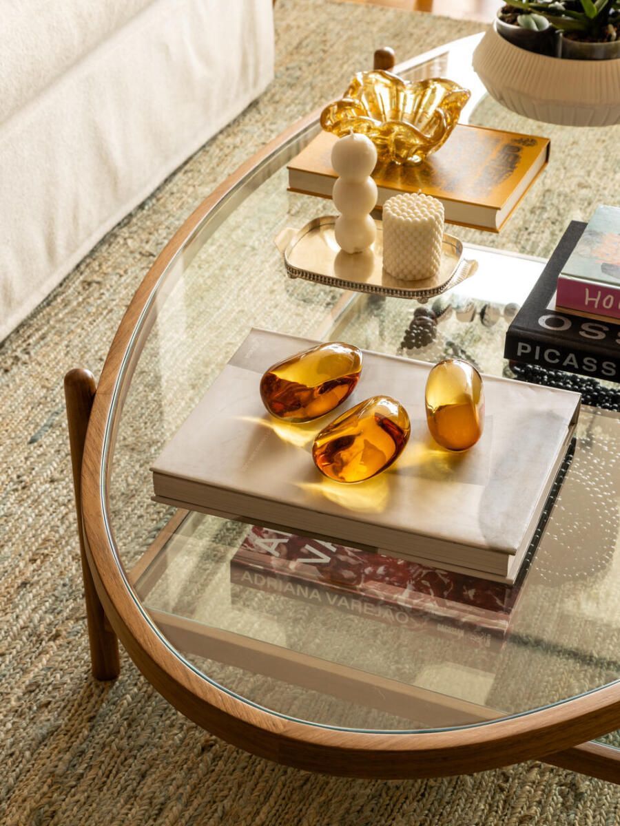 A escolha do mobiliário equilibrou peças neutras com elementos de destaque, permitindo que a decoração e as obras de arte se sobressaíssem. Os sofás foram reestofados para um toque renovado, enquanto os móveis novos foram selecionados cuidadosamente, misturando peças garimpadas em antiquários, móveis autorais do escritório – como a mesa de centro – e itens contemporâneos.