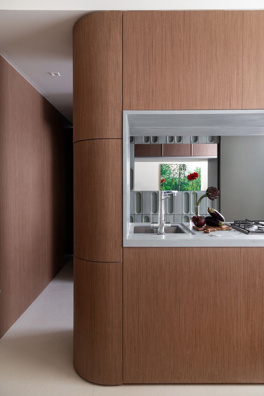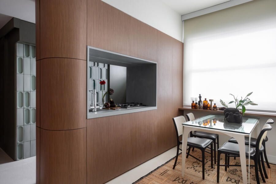 A reforma partiu de uma reorganização radical da planta. A antiga cozinha foi demolida para dar lugar a um espaço integrado, no qual sala de estar, jantar e preparo de alimentos coexistem de forma fluida. A ilha central concentra os pontos de gás, hidráulica e elétrica, tornando-se o eixo funcional do apartamento e atendendo a um pedido claro do casal: uma mesa de jantar para quatro pessoas, capaz de receber com conforto e informalidade.
