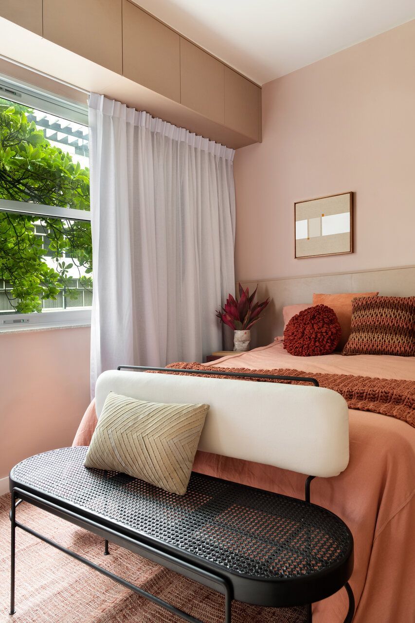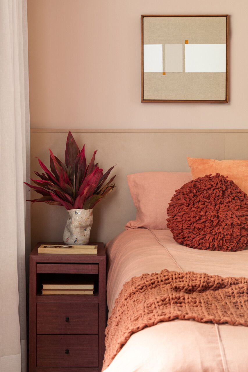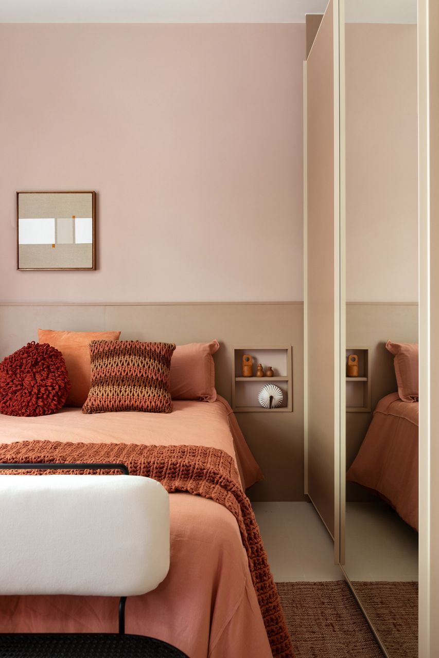 O quarto segue uma atmosfera mais introspectiva e acolhedora. Richard optou por um tom rosado de baixa saturação aplicado em todo o ambiente, assumindo um neutro menos óbvio e mais sensorial. A marcenaria em tom canela dialoga com as paredes na cor Licor Doce, da Coral, criando um espaço silencioso, elegante e confortável, pensado para o descanso e a rotina do casal.