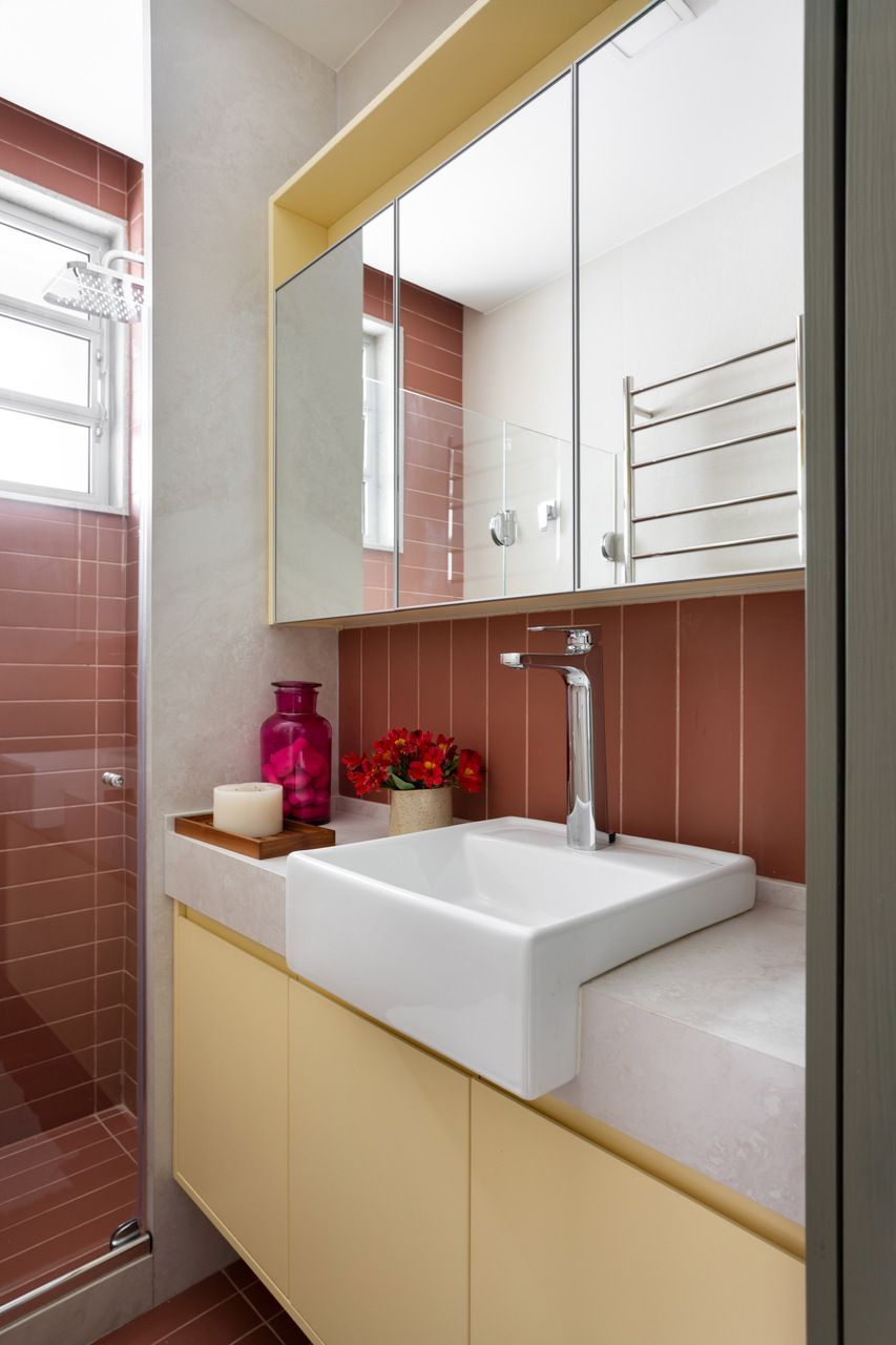 Já no banheiro, o projeto assume um gesto mais ousado e bem-humorado. O porcelanato Terralma Riviera, em tom avermelhado, reveste piso e paredes principais, enquanto a marcenaria em baunilha equilibra a composição.