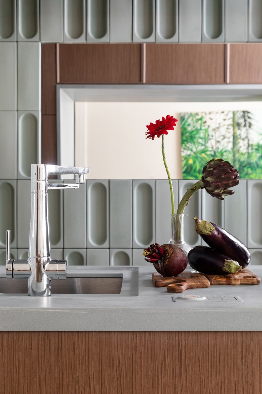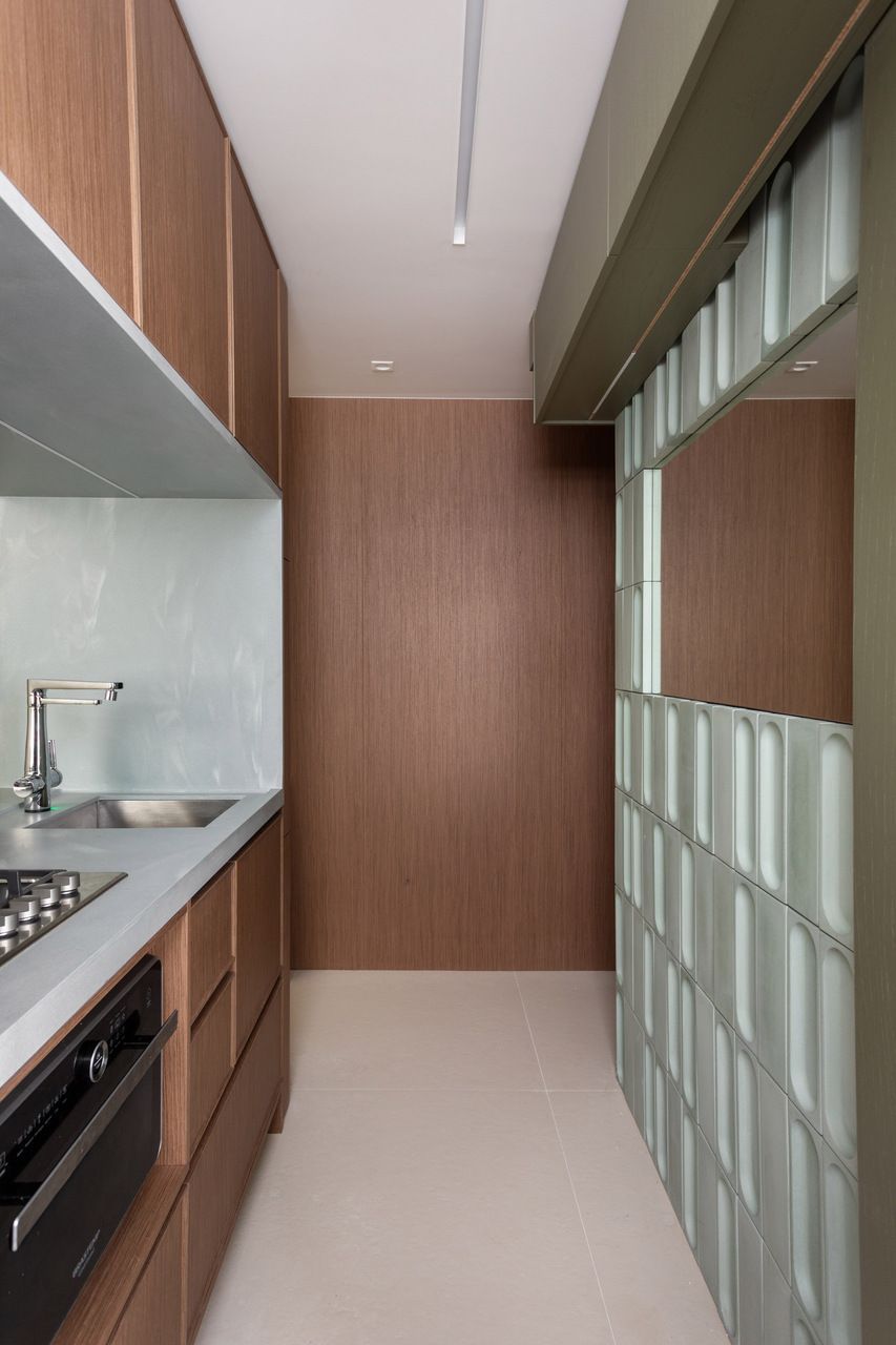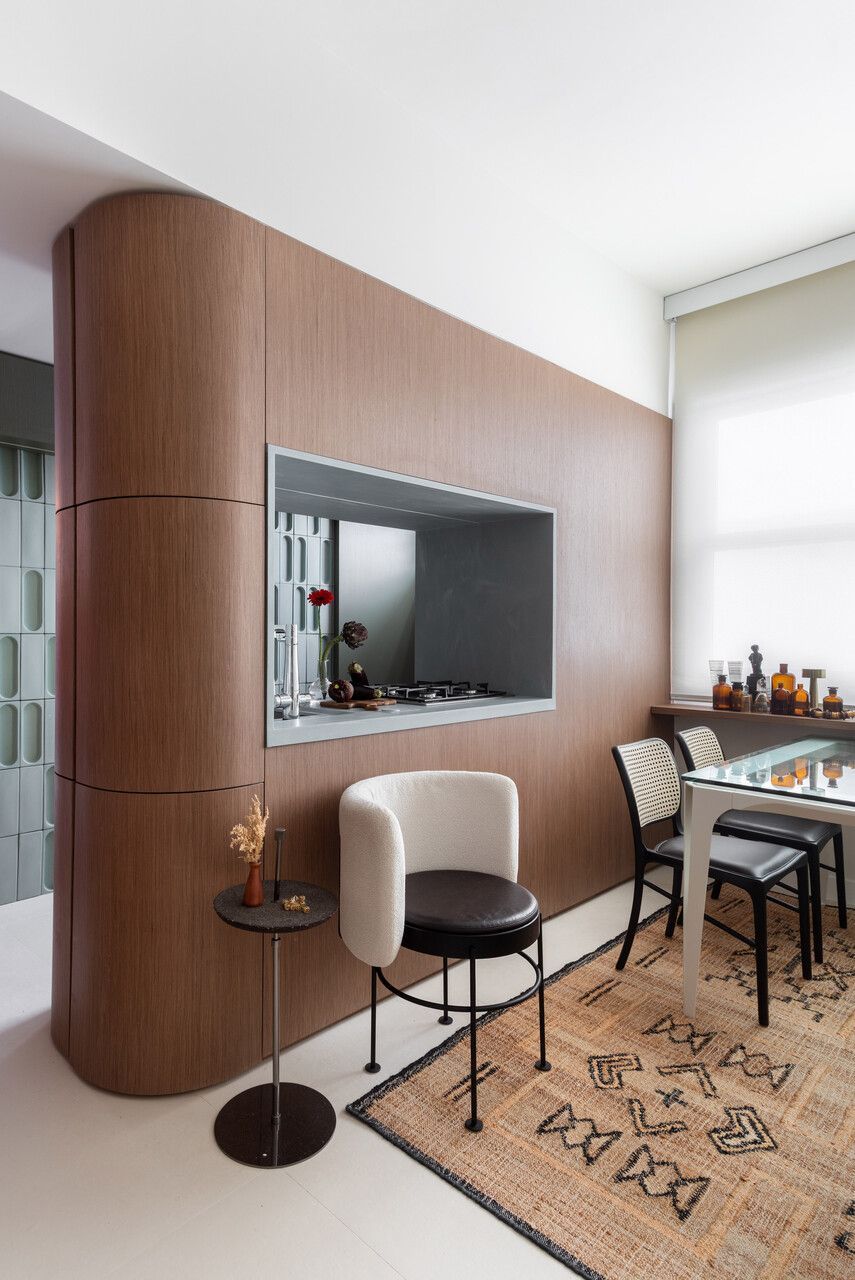 O conceito do projeto se ancora no modernismo brasileiro, reinterpretado em escala reduzida. Formas orgânicas convivem com texturas geométricas e uma paleta de tons terrosos que atravessa todo o apartamento. A marcenaria em nogueira natural, presente em diferentes ambientes, remete ao jacarandá e adiciona sofisticação, enquanto o revestimento cerâmico de baixo-relevo geométrico evoca a estética dos anos 1960 com sutileza e precisão.