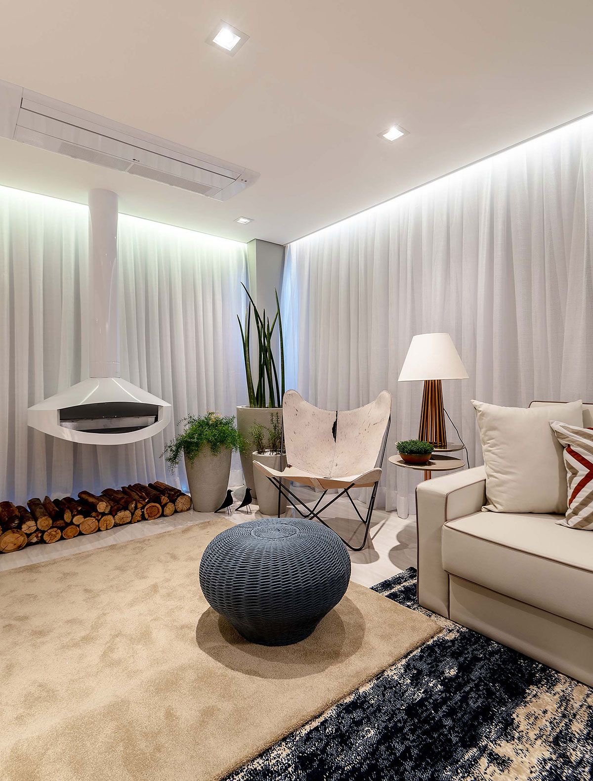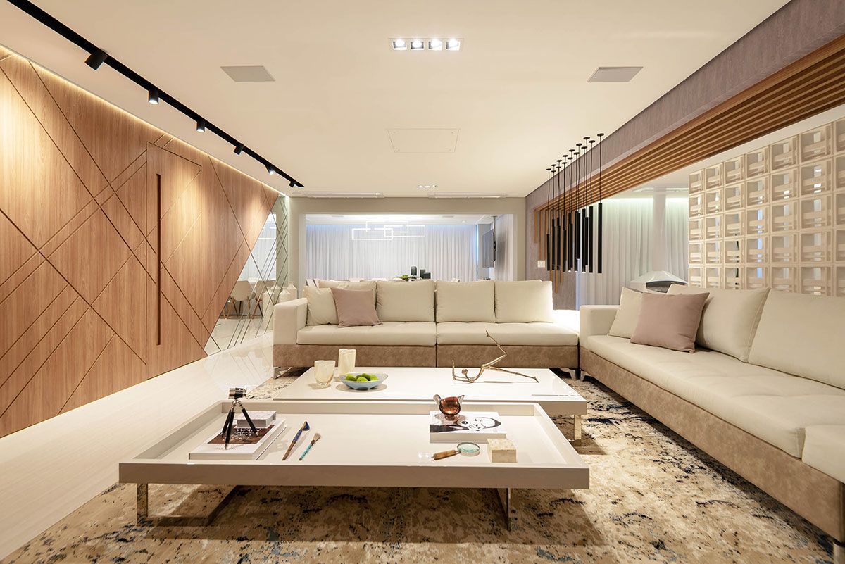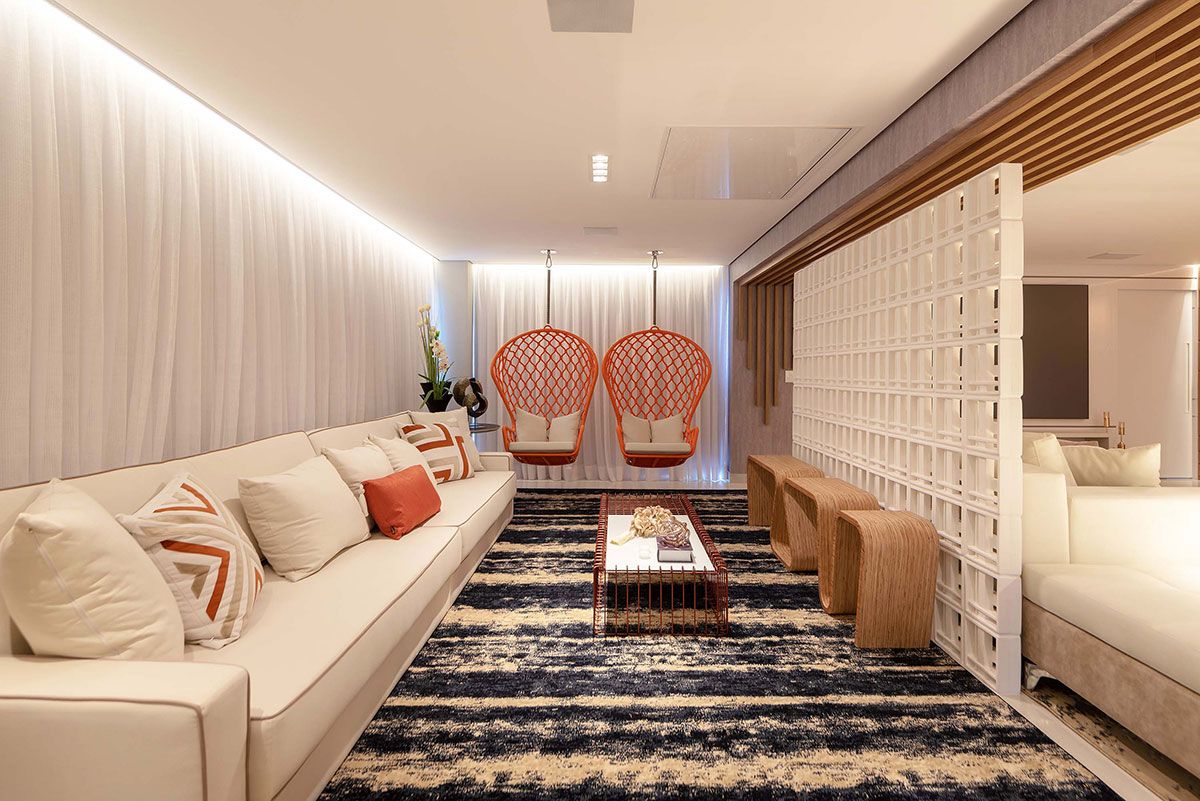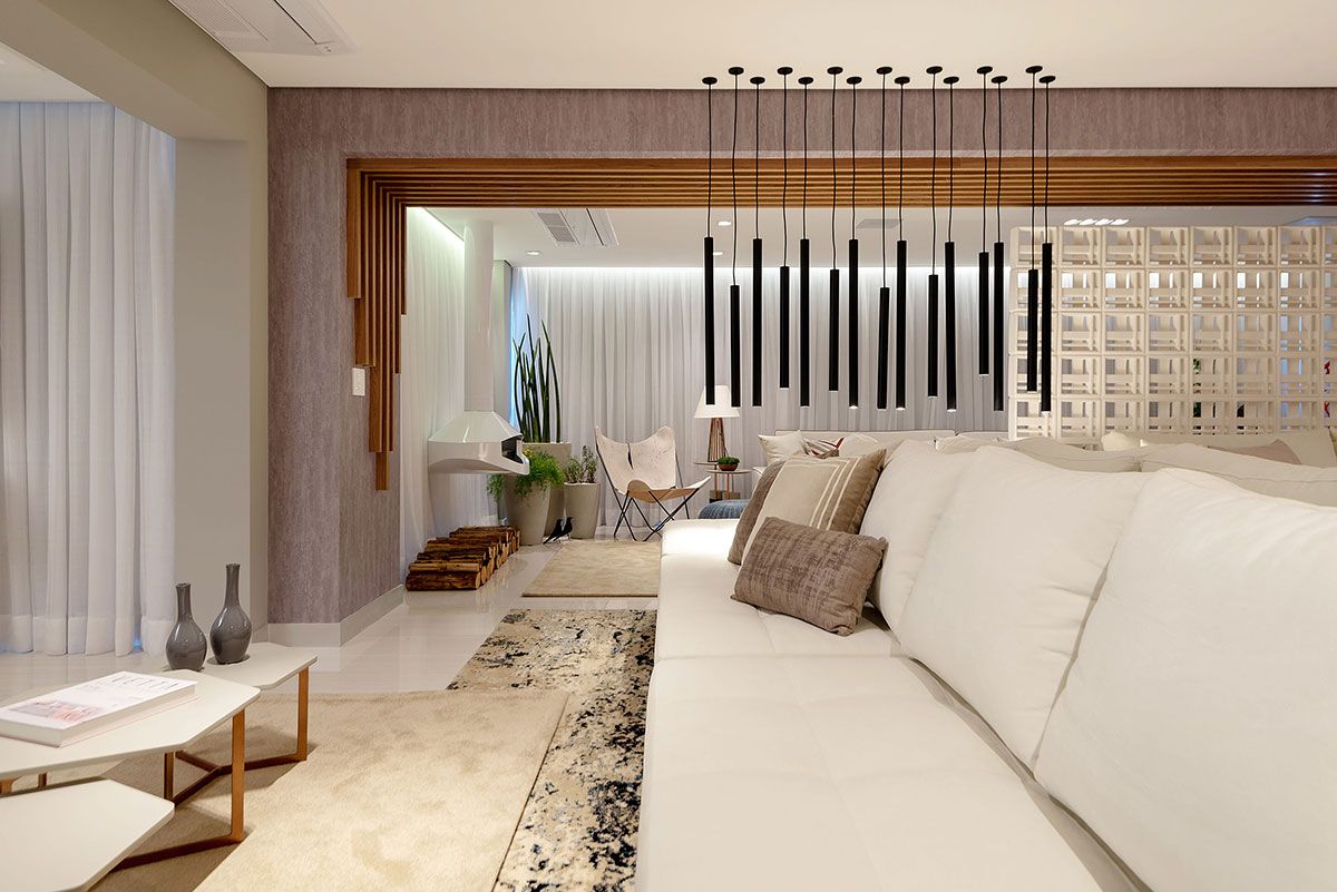Foram removidas todas as portas de vidro da sala que davam acesso para as varandas, com isso a viga ficou aparente. E ali foi criado um elemento plástico de impacto visual, valorizando todo contexto do projeto.