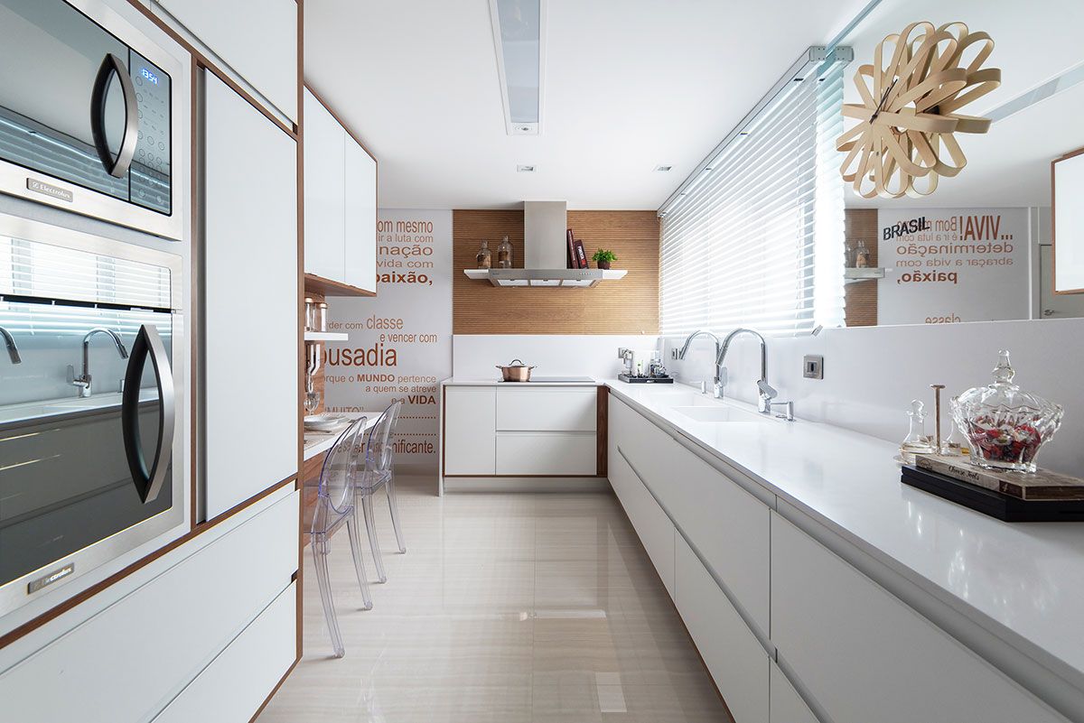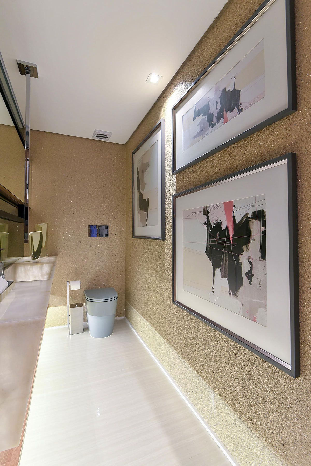Uma das alterações realizadas está no cozinha, onde o seu acesso era tanto pela sala de jantar quanto pela sala de estar. Como as entradas eram próximas, foi fechado um dos acessos e o ambiente ganhou mais armários. Além disso, o lavabo, que era pequeno, foi prolongado e para não ficar exposto diretamente na sala estar foi criado uma painel de madeira, que camufla a porta.
