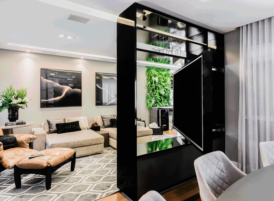 Projetamos uma estante vazada com a TV giratória. Assim o cliente pode assistir tanto da sala, como da varanda, sala de jantar e escritório.