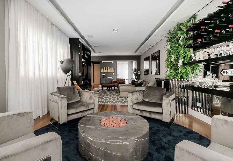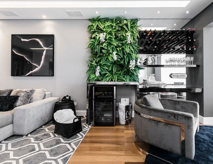 As arquitetas fizeram o reaproveitamento do layout existente, pois o imóvel é alugado. Para dar um toque de cor na sala a escolha foi o jardim vertical.