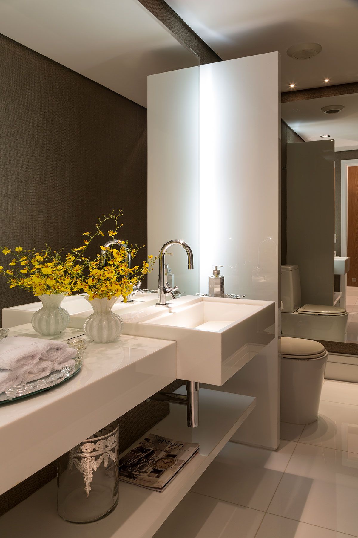 A parede do aparador era pequena, por isso usamos um espelho de piso ao teto. O espelho é um excelente recurso para dar amplitude, refletir luz e neste caso aumentar a sensação do pé direito.