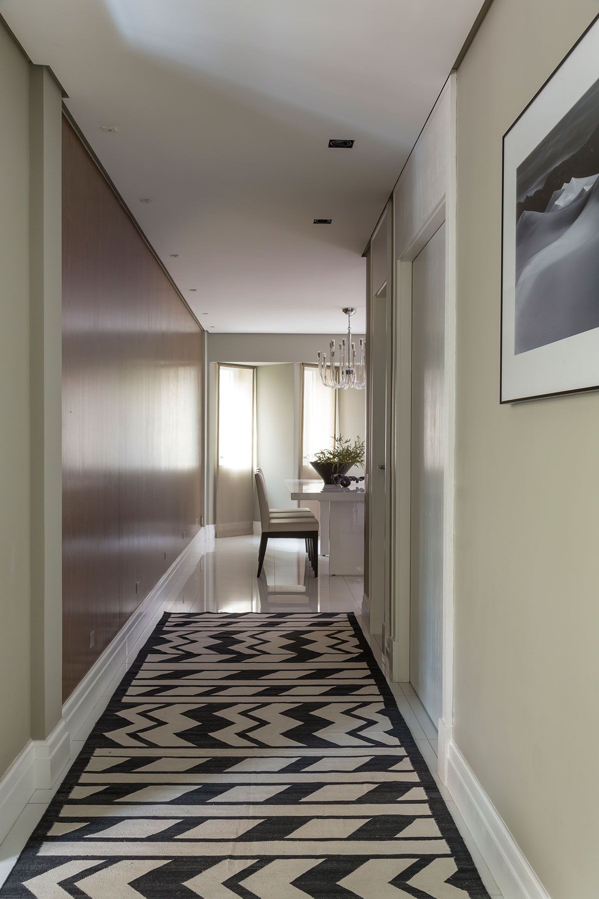 Na sala de jantar o escritório Karina Cukier arquitetura, que assina o projeto, revestiu a maior parede com madeira Nogueira, para criar um destaque para a circulação e aquecer o ambiente.