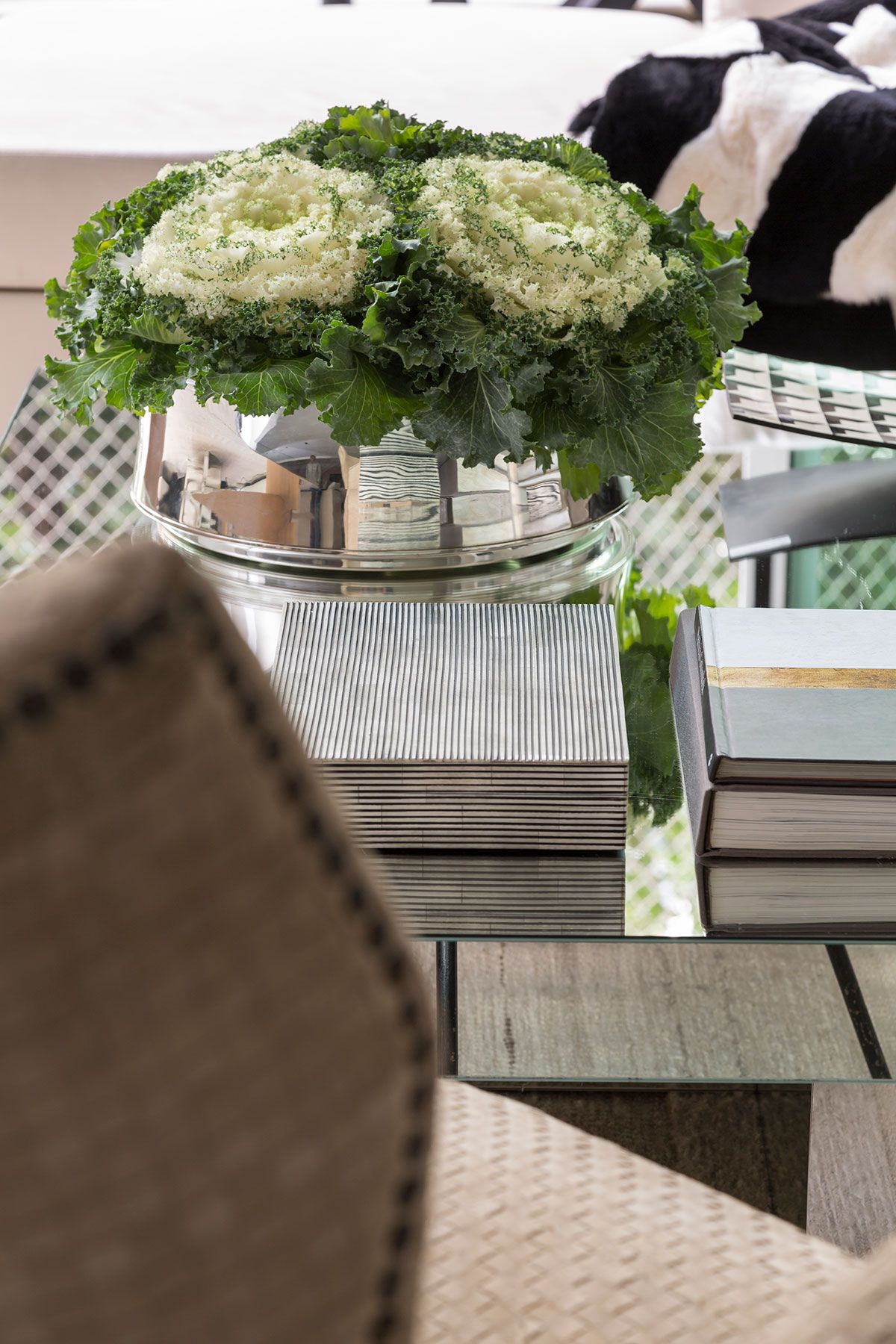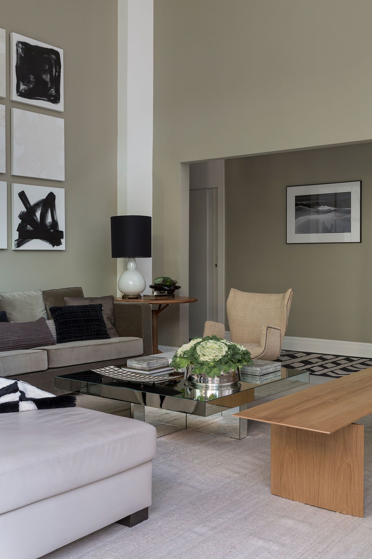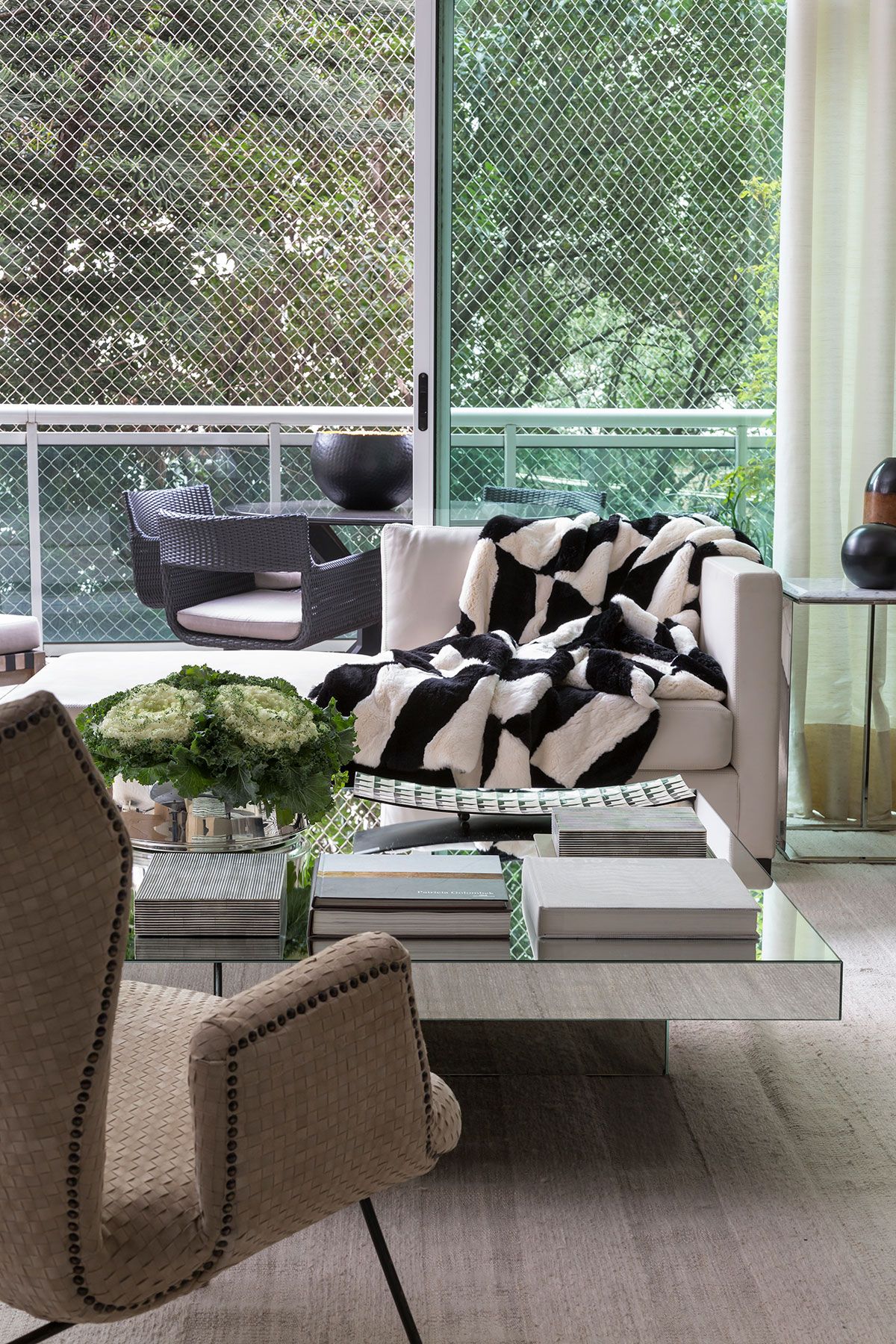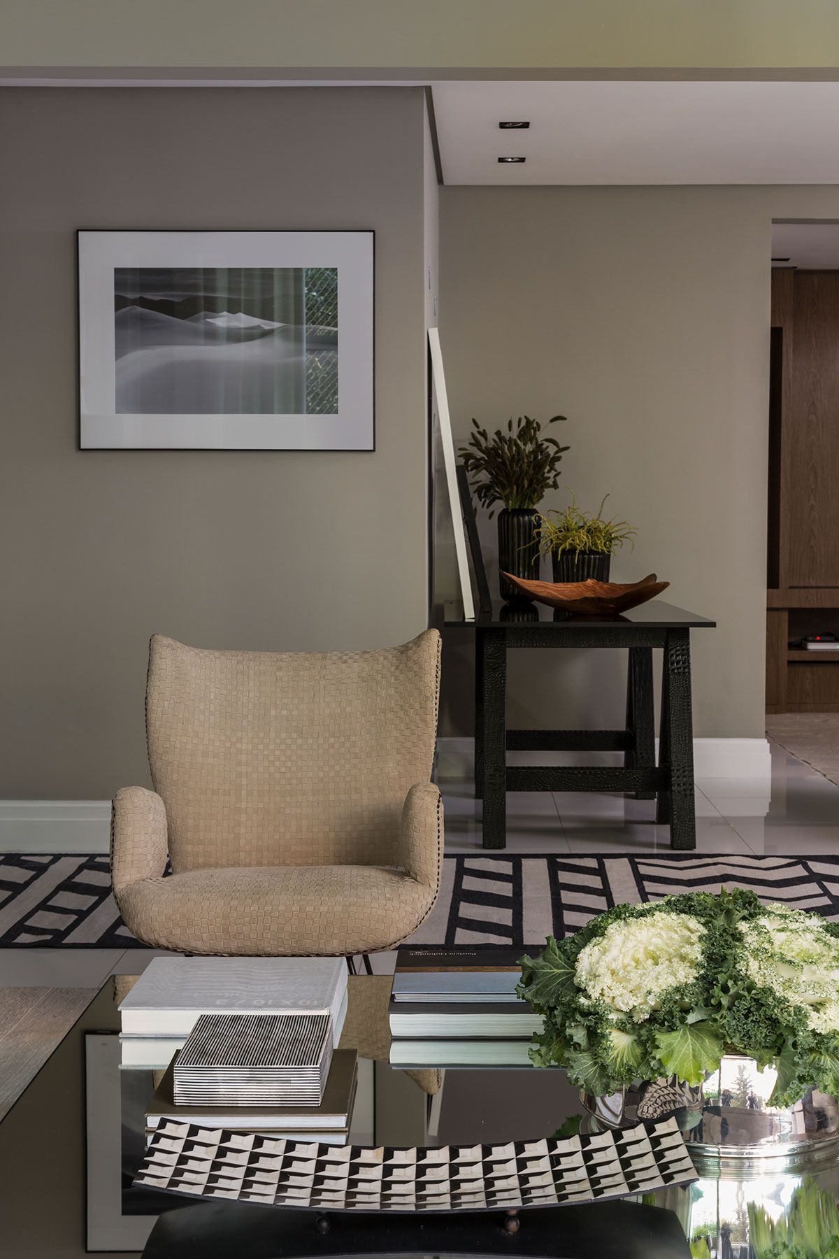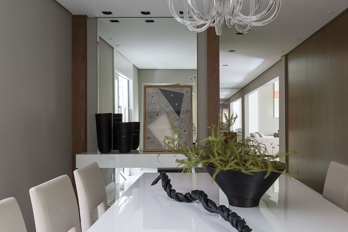 A parede do aparador era pequena, por isso usamos um espelho de piso ao teto. O espelho é um excelente recurso para dar amplitude, refletir luz e neste caso aumentar a sensação do pé direito.