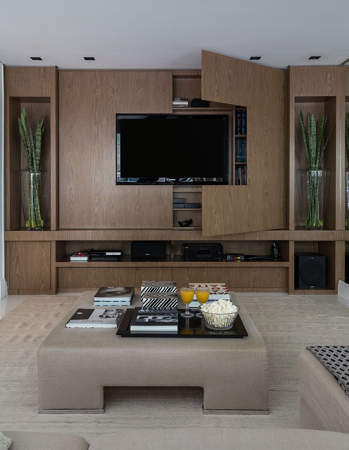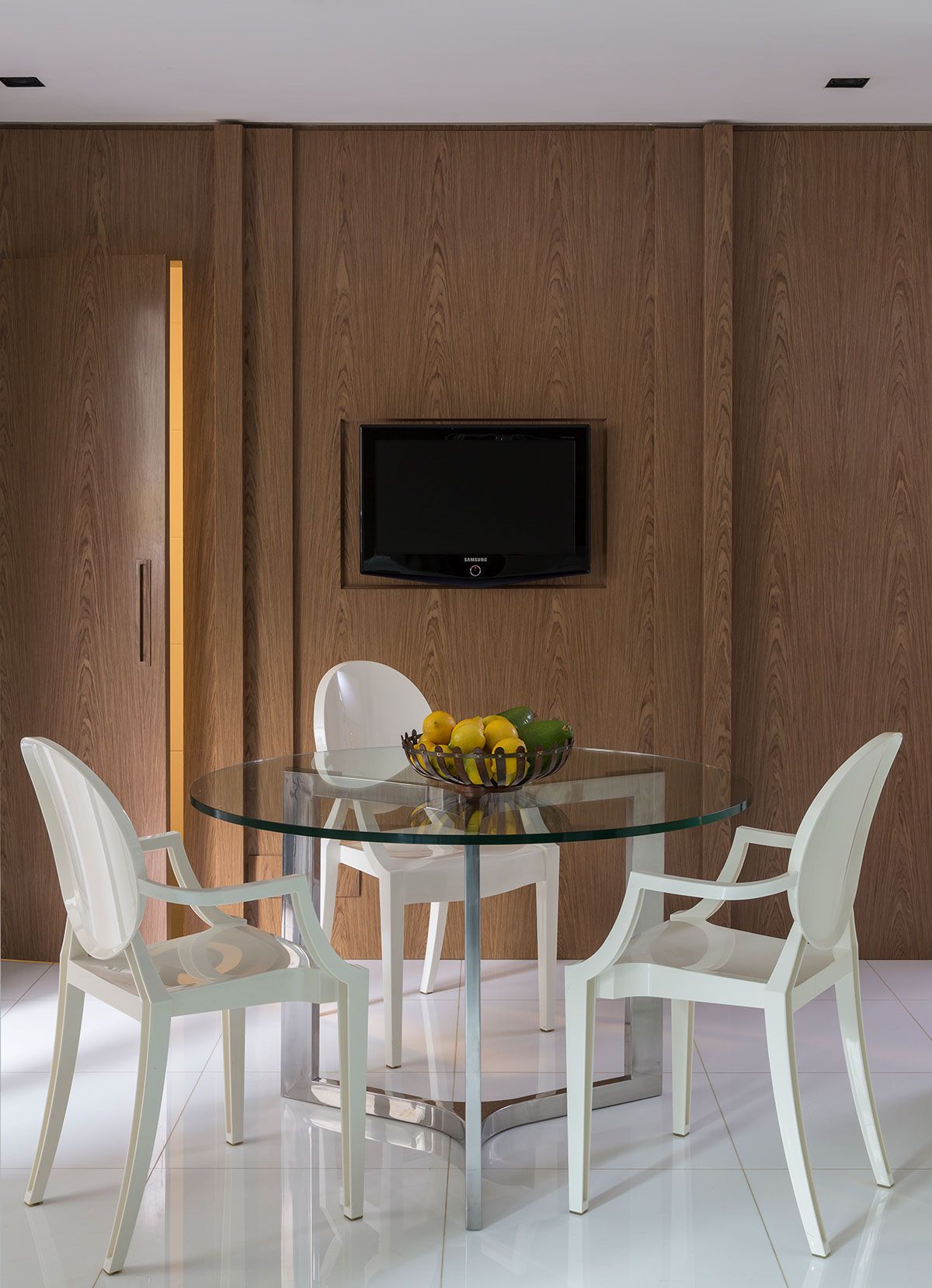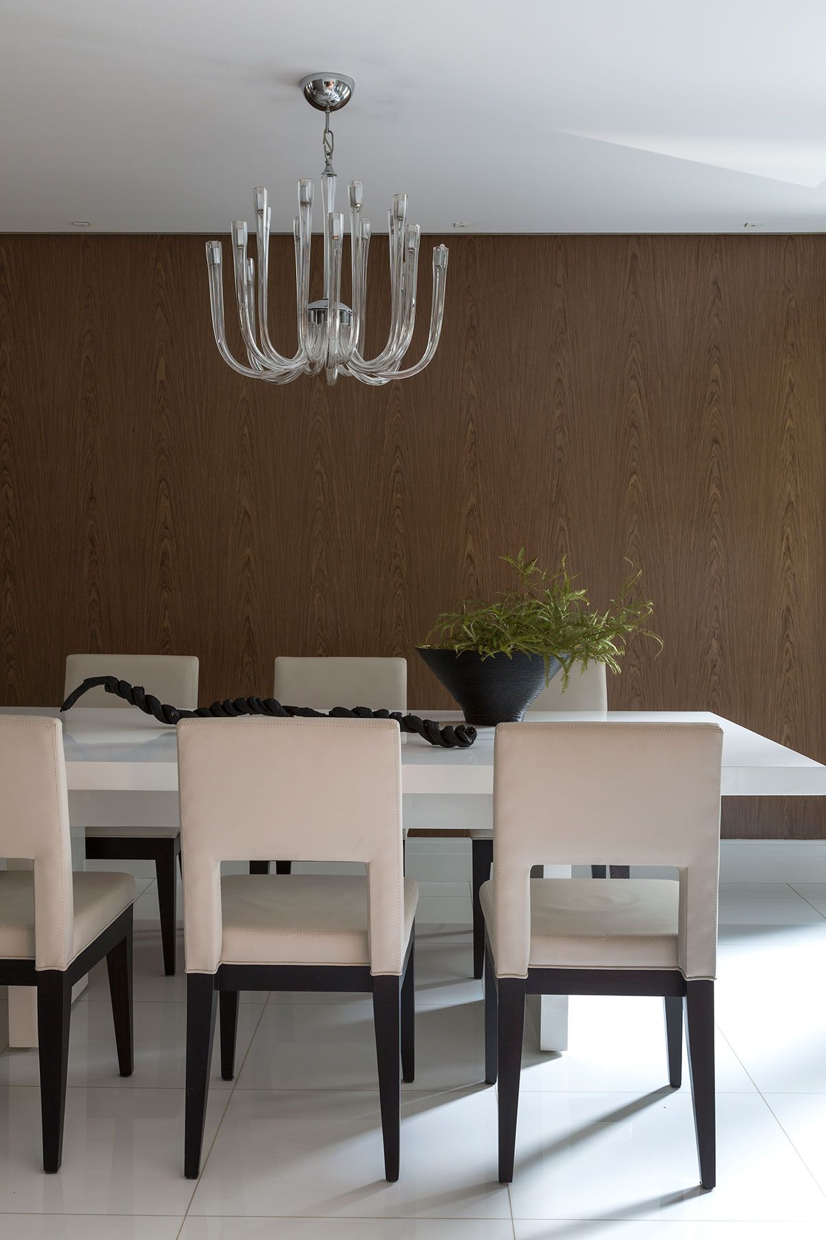 O casal tinha um desejo especial: que a sala de almoço fosse integrada a sala de jantar. O escritório fez um painel na parede de fundo da sala de almoço, também revestido em madeira nogueira, que disfarça a porta da cozinha, e ao mesmo tempo conversa com a parede da sala de jantar.