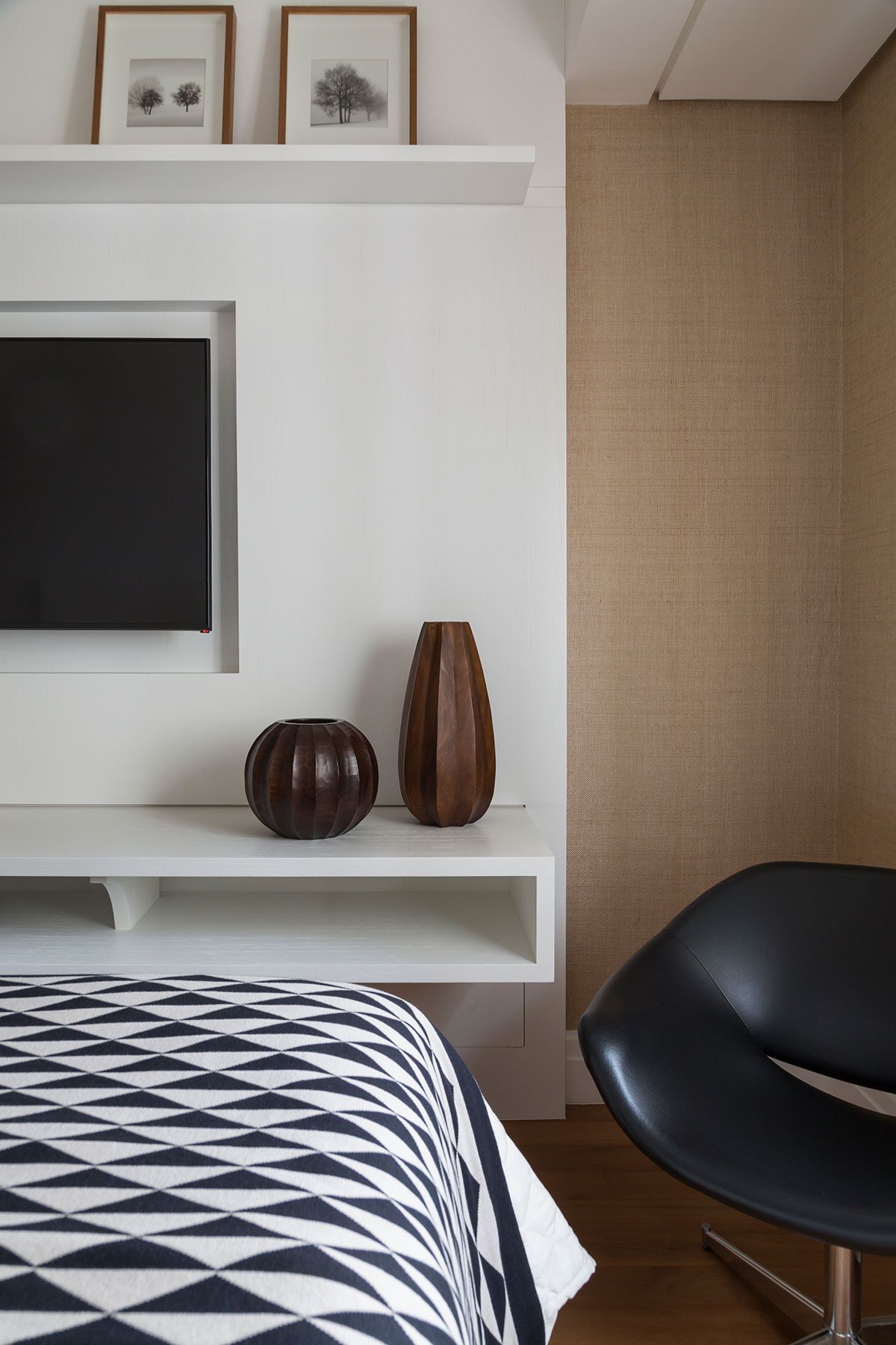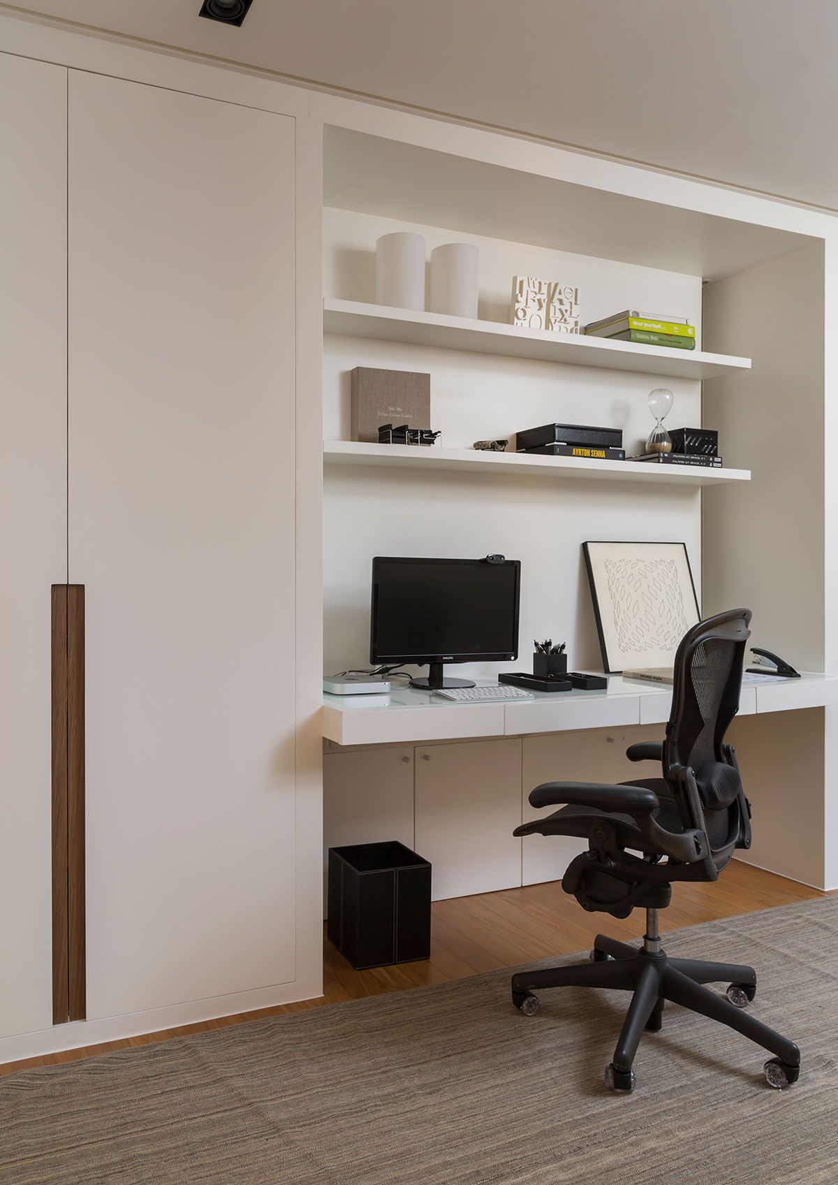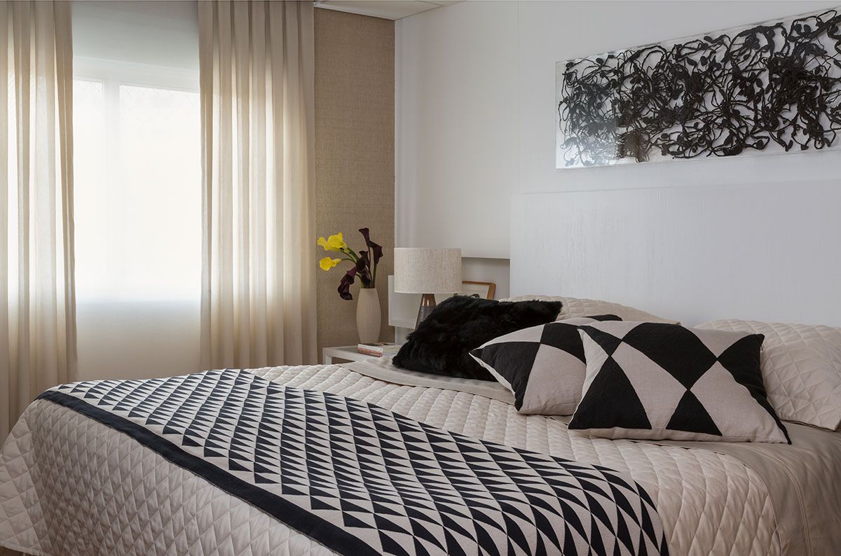 Ainda nas salas, as janelas existentes eram em ângulos, e apesar da boa iluminação, a forma era estranha. Por isso, o escritório criou um painel com um tecido de tela, transparente e encorpado, no mesmo tom da pintura da parede, assim, manteve a luz dando leveza ao espaço.