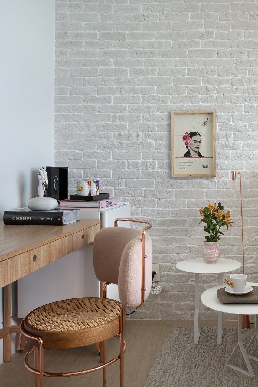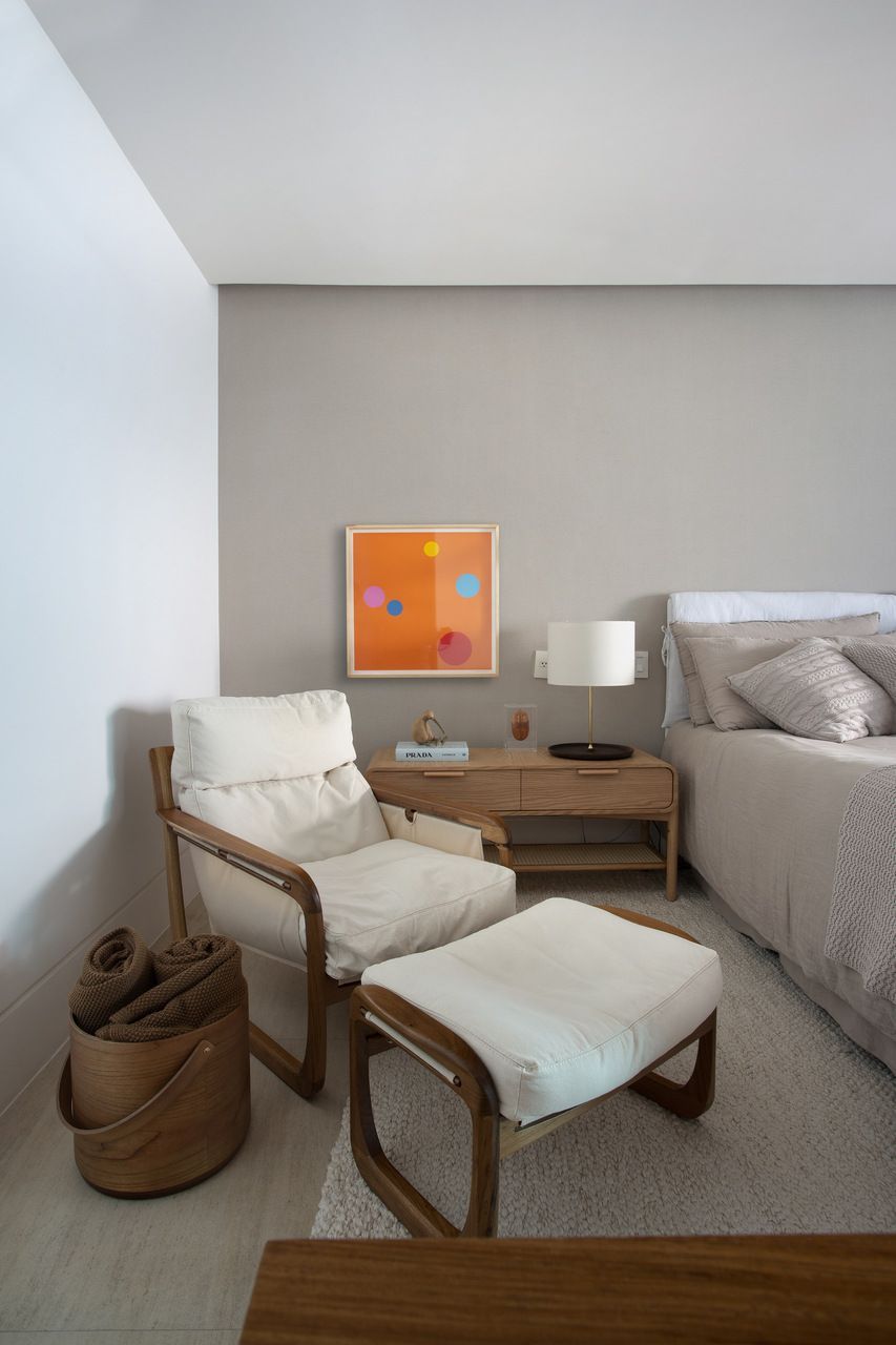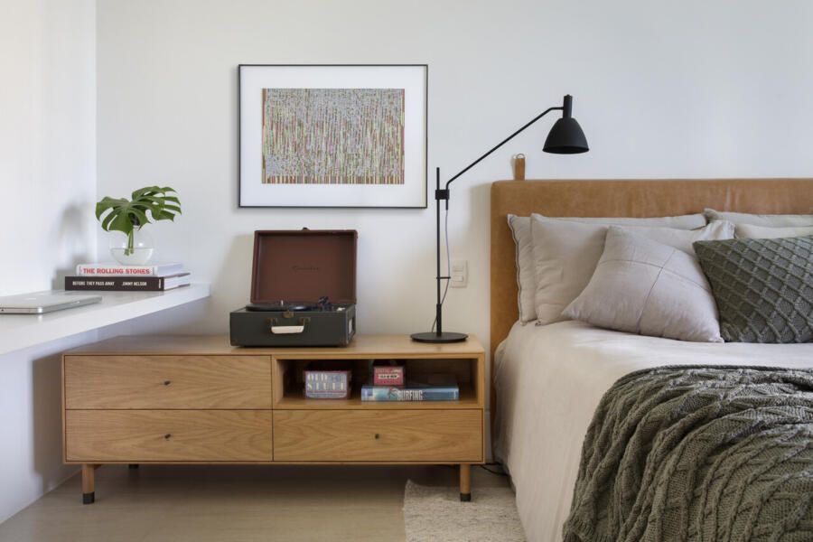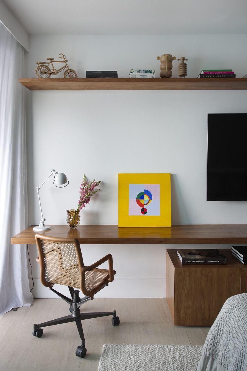 Na suíte do casal, a bancada abaixo da TV foi ampliada e adaptada para funcionar como um pequeno escritório. A escolha por móveis confortáveis e de design limpo ajuda a manter a harmonia visual do ambiente.