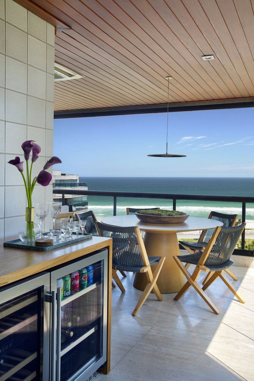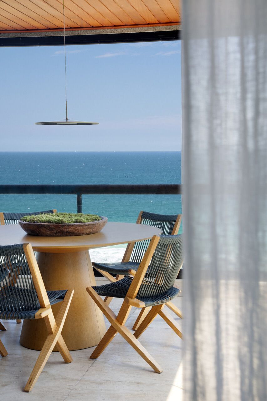 A varanda é um dos pontos altos do apartamento. Ali, os móveis de madeira e corda náutica ajudam a criar um clima descontraído. Poltronas giratórias tornam o espaço ainda mais versátil, permitindo a integração com a sala e com a vista externa.
