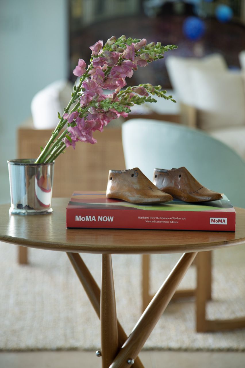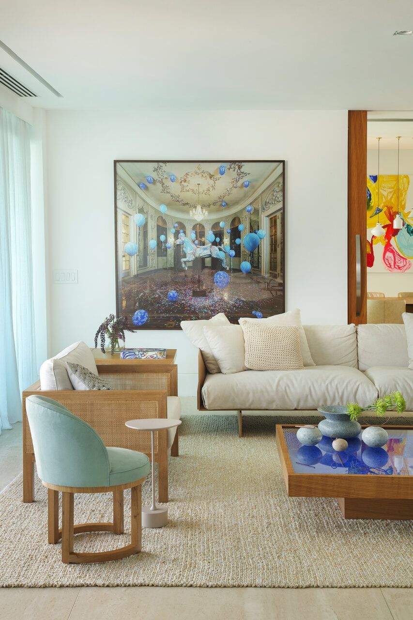 Móveis soltos e obras de arte transformam apartamento alugado com vista para o mar