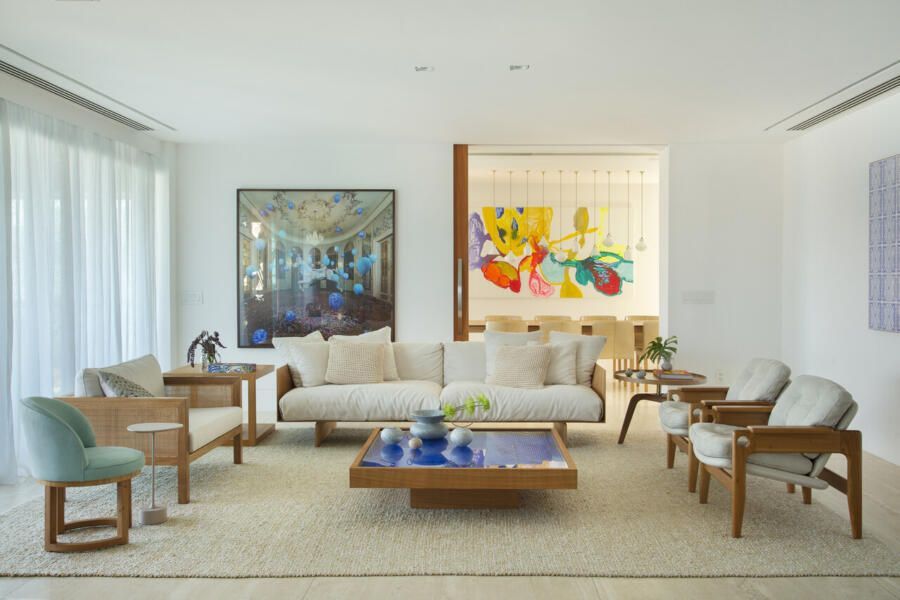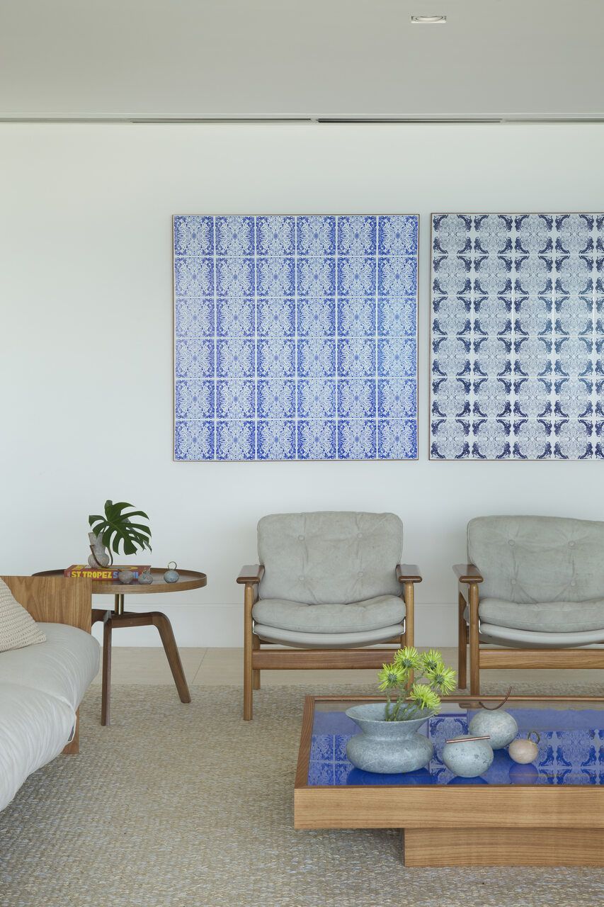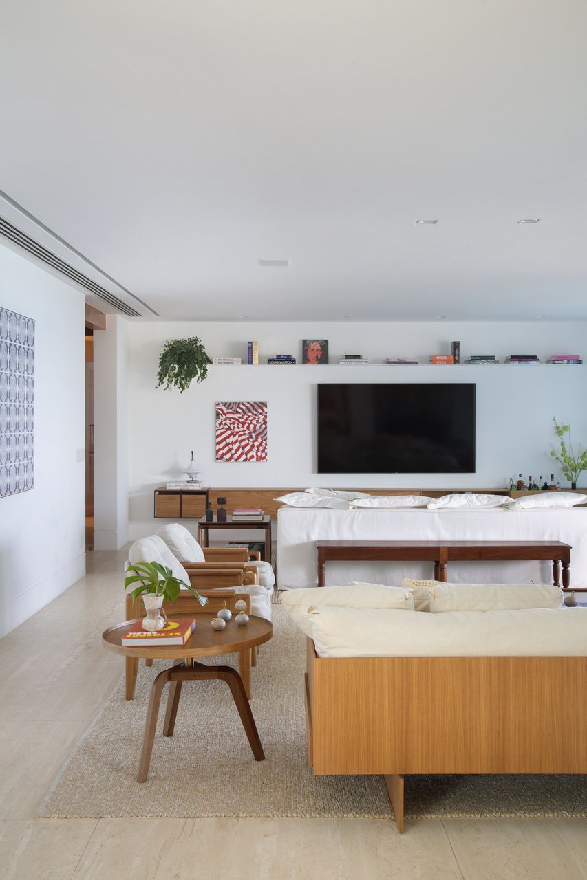 Home  /  Projetos  / Móveis soltos e obras de arte transformam apartamento alugado com vista para o mar
