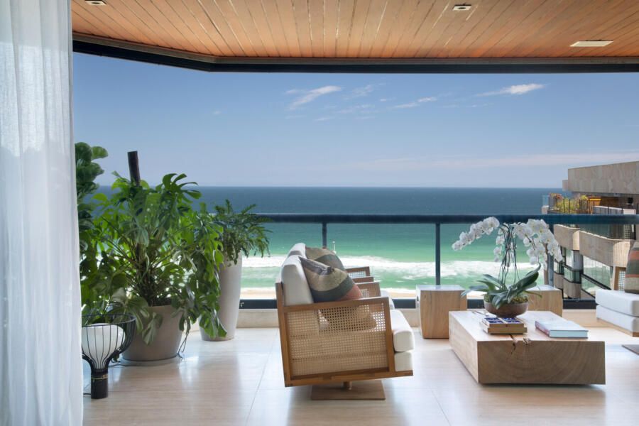 A decoração segue uma linha contemporânea com base em tons neutros. As cores aparecem em detalhes como obras de arte, objetos decorativos e até no tampo da mesa de centro. O azul do mar, logo à frente, também entra na composição, criando uma harmonia com o exterior.