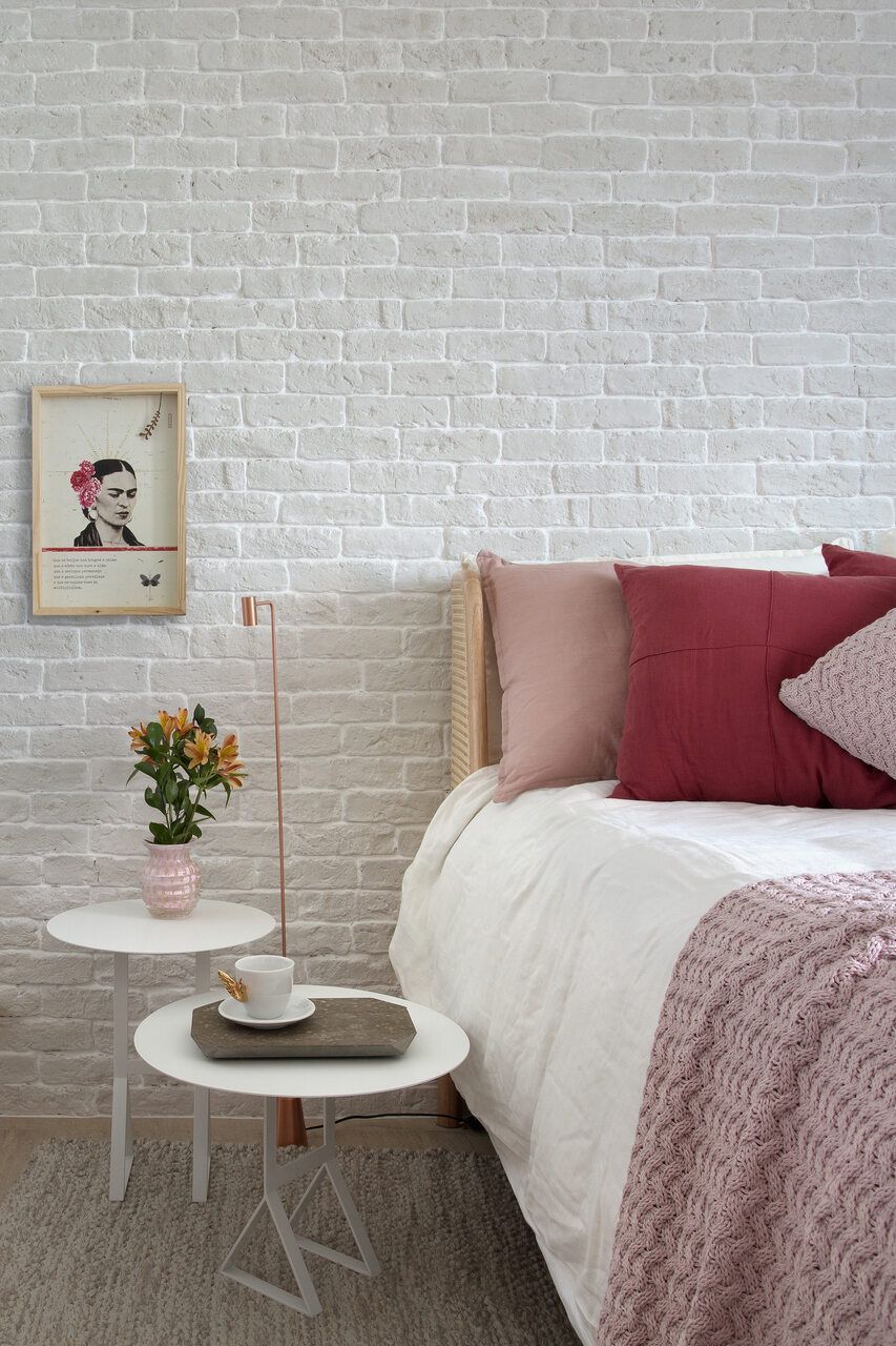 Cada dormitório foi pensado para refletir a personalidade de quem o usa. O quarto da filha, com cabeceira de tijolinhos brancos e cama de palhinha, mistura um toque rústico com leveza e feminilidade.