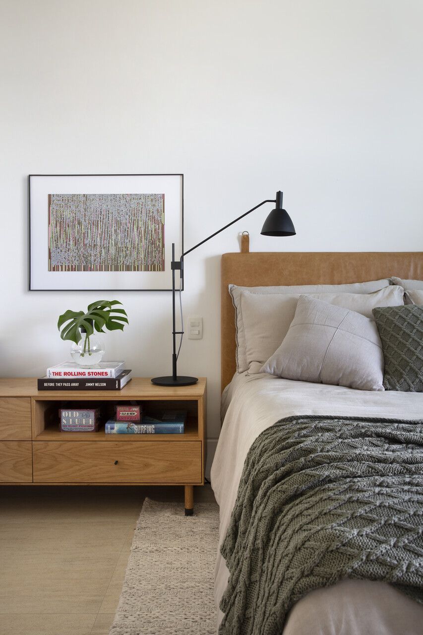 O filho mais velho ganhou um ambiente sóbrio, com tons neutros e pequenos pontos de cor. A escolha dos móveis permite que o quarto seja facilmente transformado em um espaço para hóspedes no futuro.