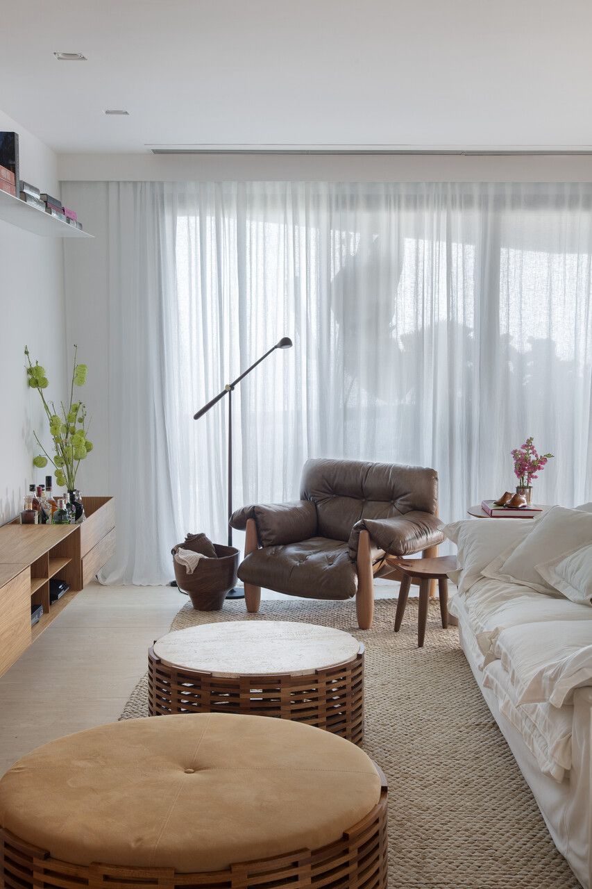 Os tecidos utilizados – linho, couro, palha e chenille – trazem textura e conforto ao toque, reforçando o clima aconchegante. O mix entre peças mais robustas e outras leves garante o equilíbrio visual do ambiente.