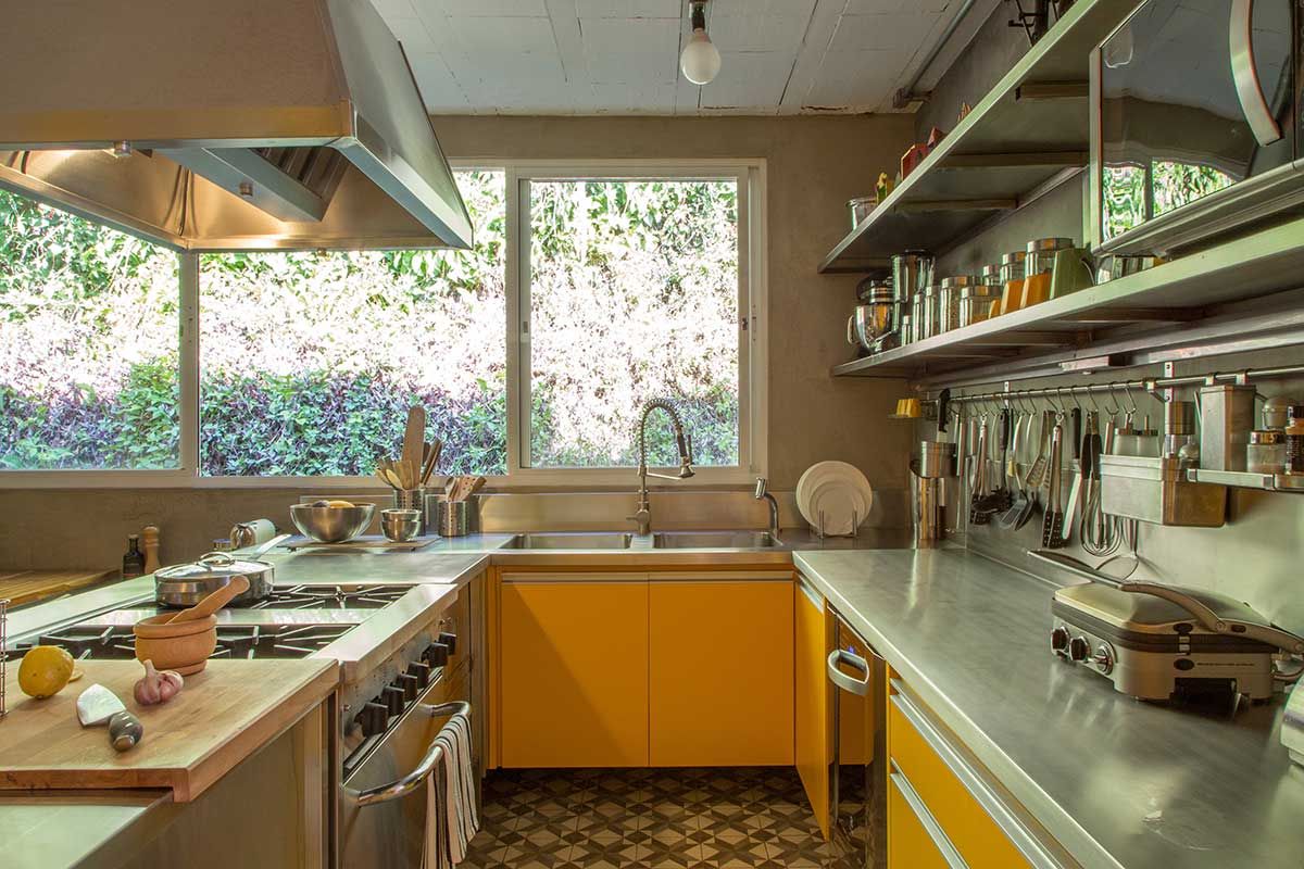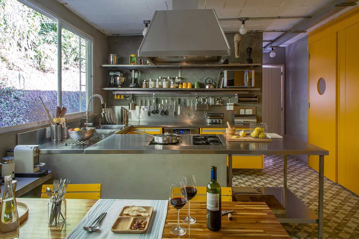 Em contraponto a essa estética mais bruta, nos quartos a profissional optou por um piso de ladrilho hidráulico que deu um toque mais pessoal aos ambientes. Na cozinha, a marcenaria amarela se mistura com o muro verde exterior e cria um ambiente bem aconchegante.