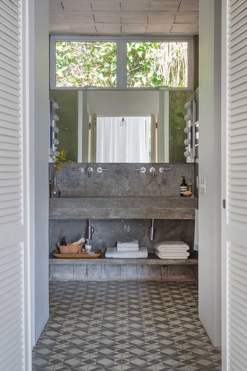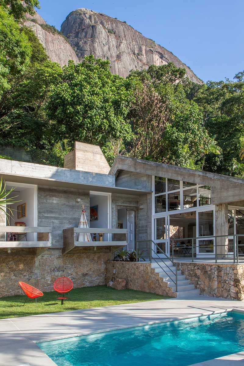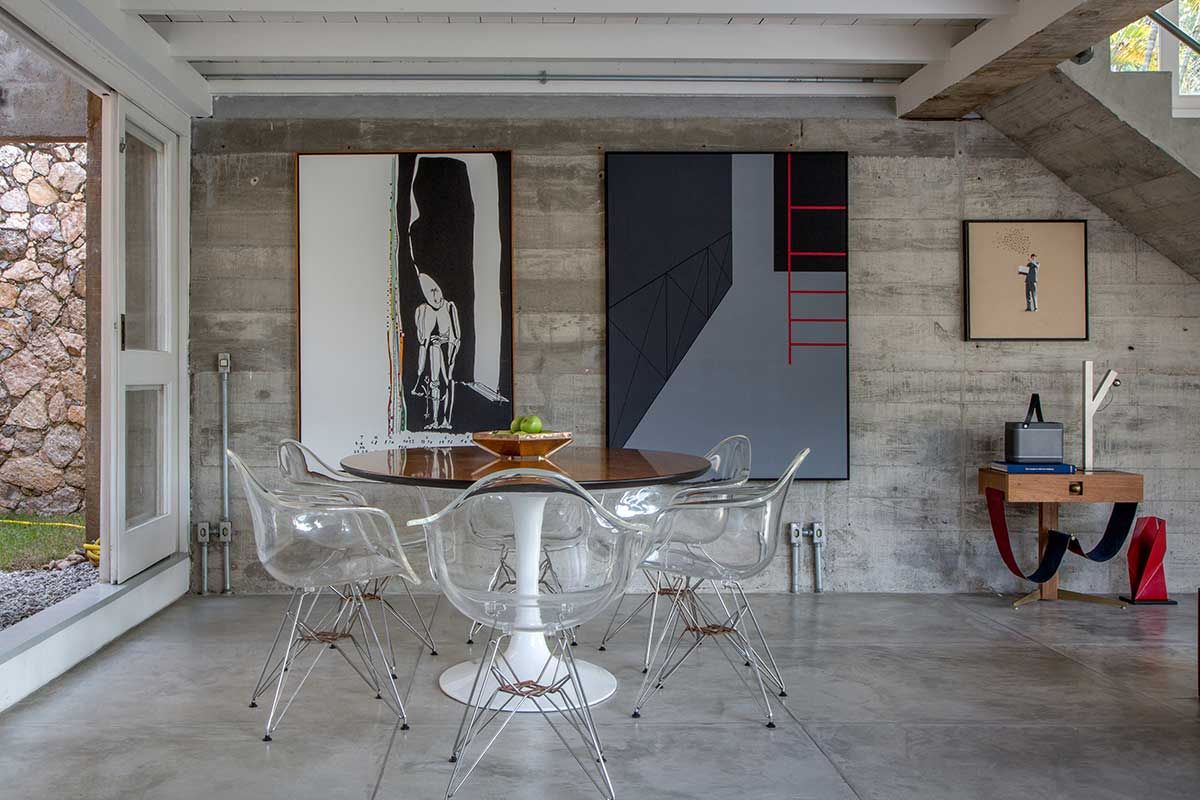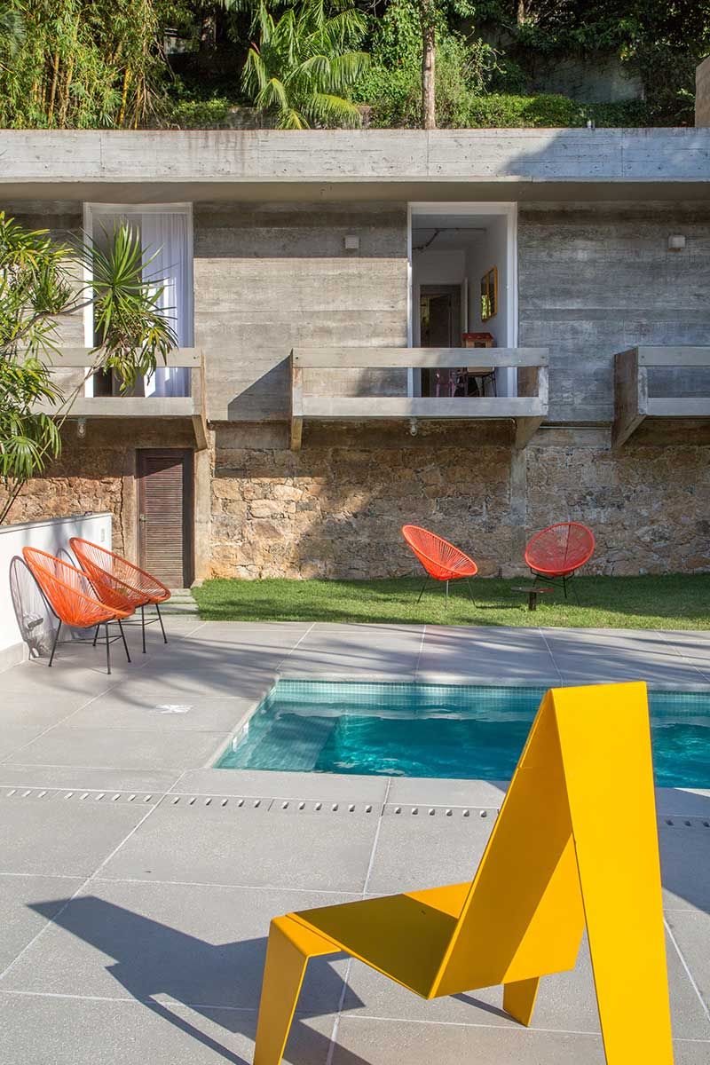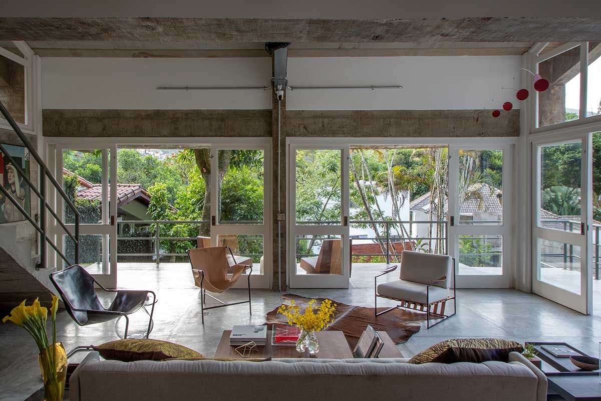 As paredes e tetos ficaram aparentes e os pisos cimentados, graças ao pé direito alto a iluminação e ventilação natural foram favorecidas, evitando assim problemas de umidade, que são comuns na região onde fica a casa no Rio de Janeiro.
