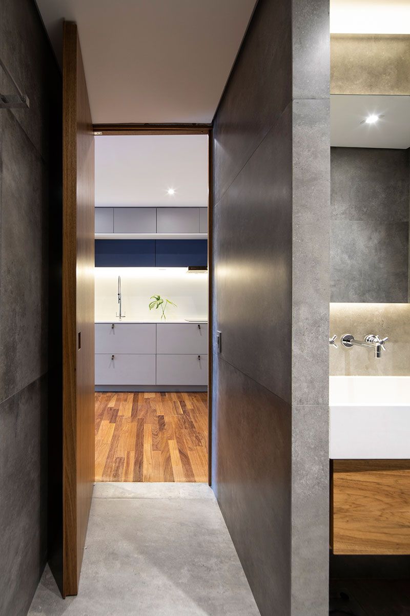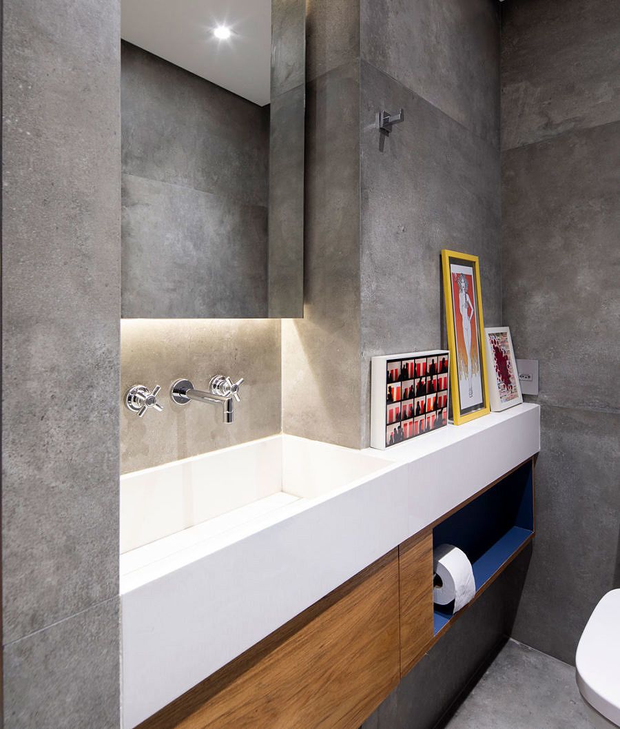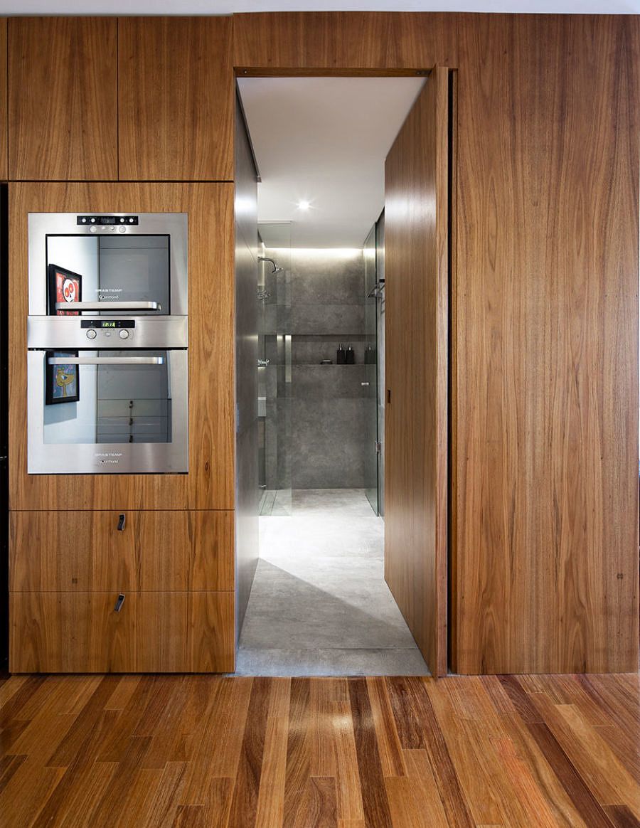 Para ganhar mais espaço os profissionais utilizaram a marcenaria, sintetizando as áreas de trabalho em um único elemento. O banheiro e demais armários e equipamentos resultam no segundo grande elemento do projeto de madeira.