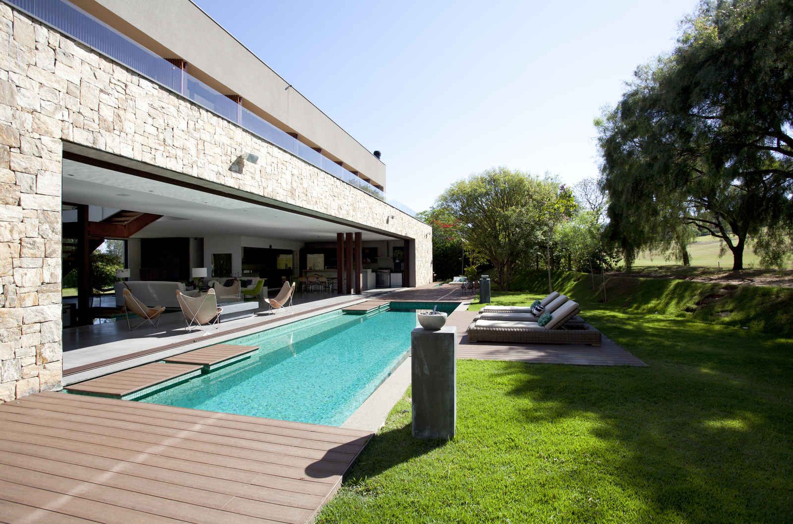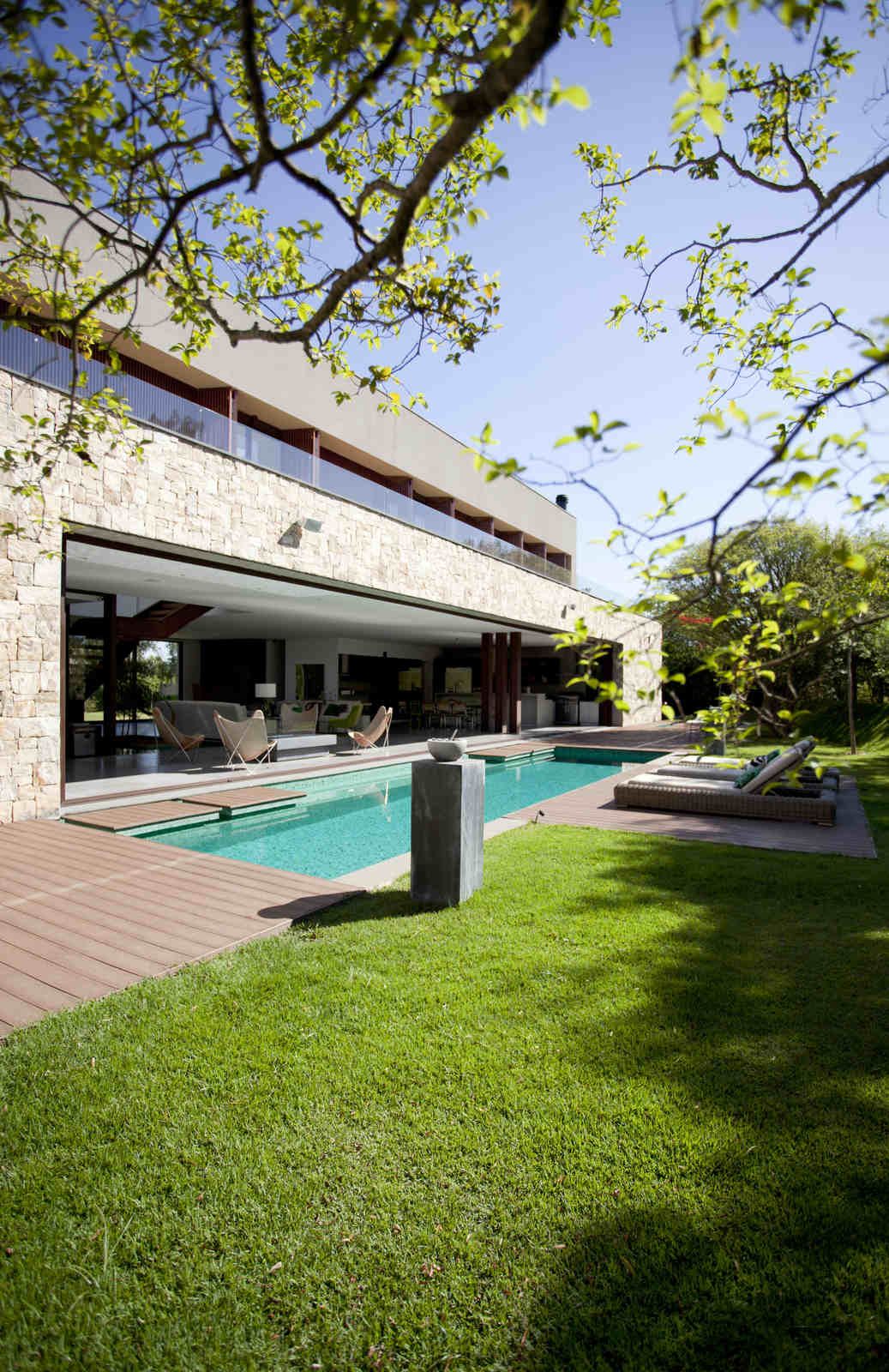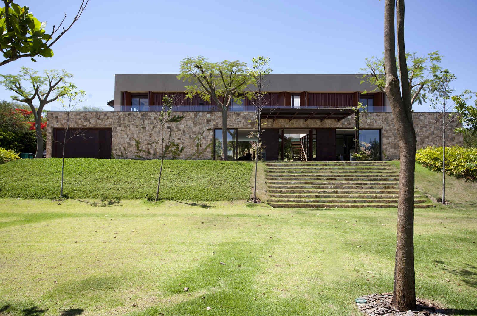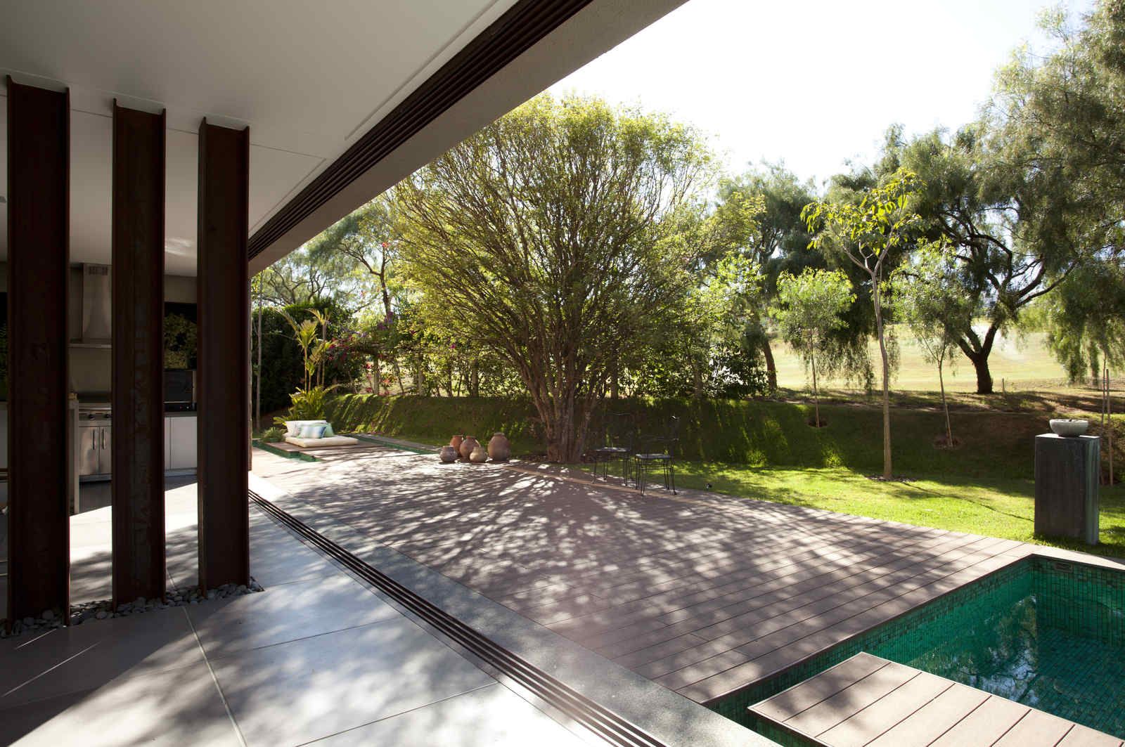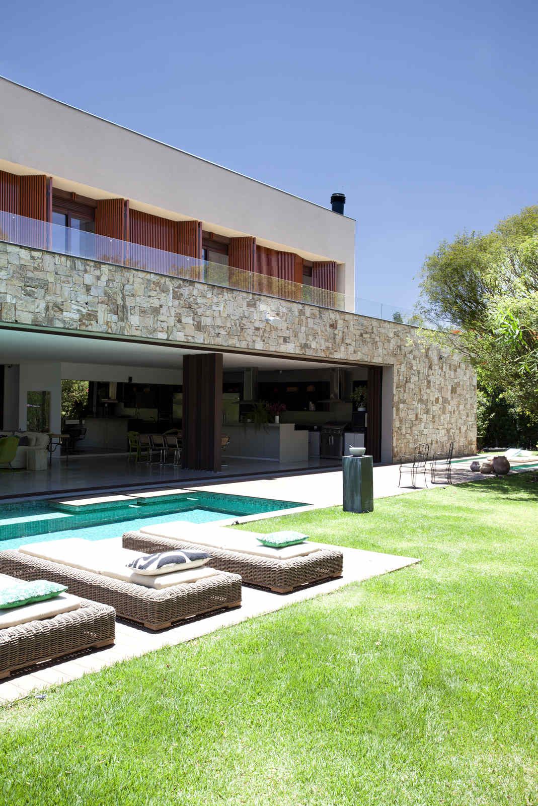 “A casa ficou afastada das construções vizinhas e não há bloqueios laterais. Sendo assim, a vista privilegiada foi amplamente explorada nos vãos abertos dos dois pavimentos; o inferior, com as áreas sociais, e o superior, com as íntimas. O desenho é o de uma casa-varanda, com aberturas de mais de 20 metros de comprimento no térreo, pelo qual se enxerga toda a propriedade.”