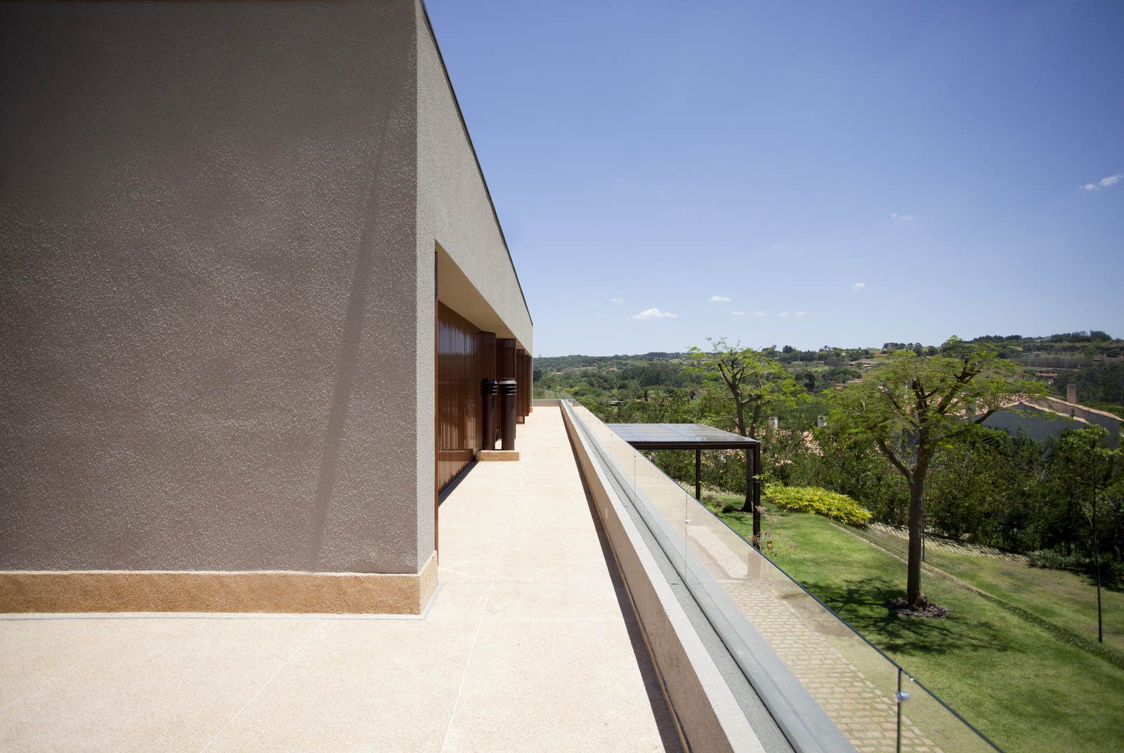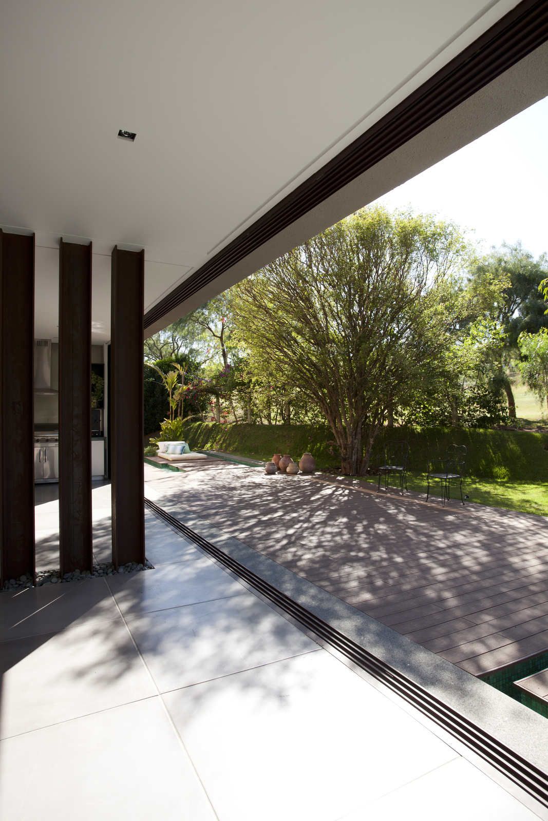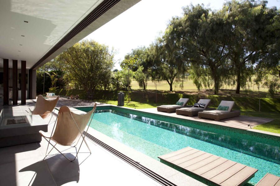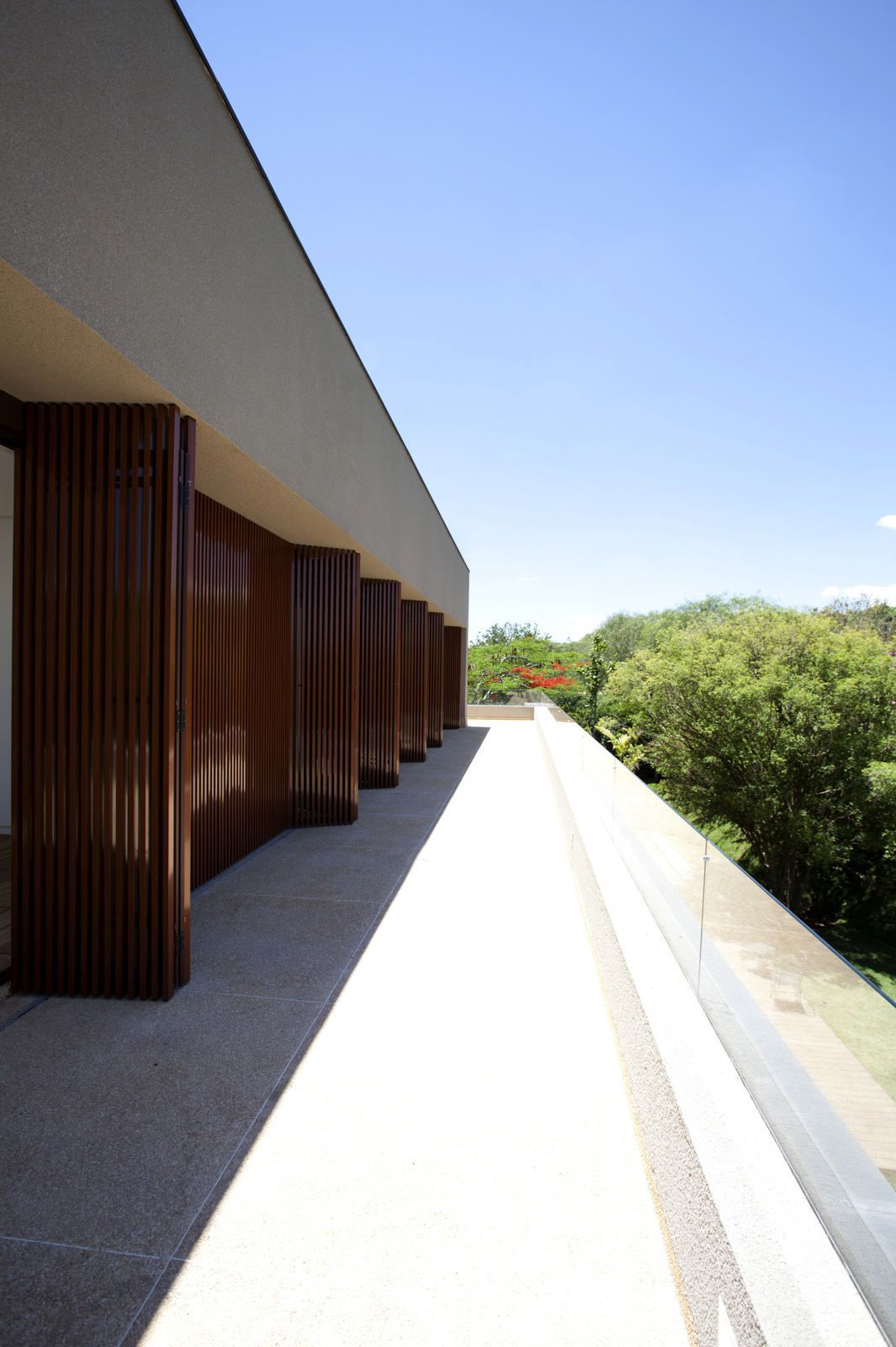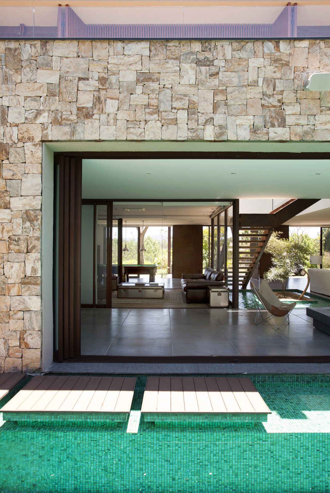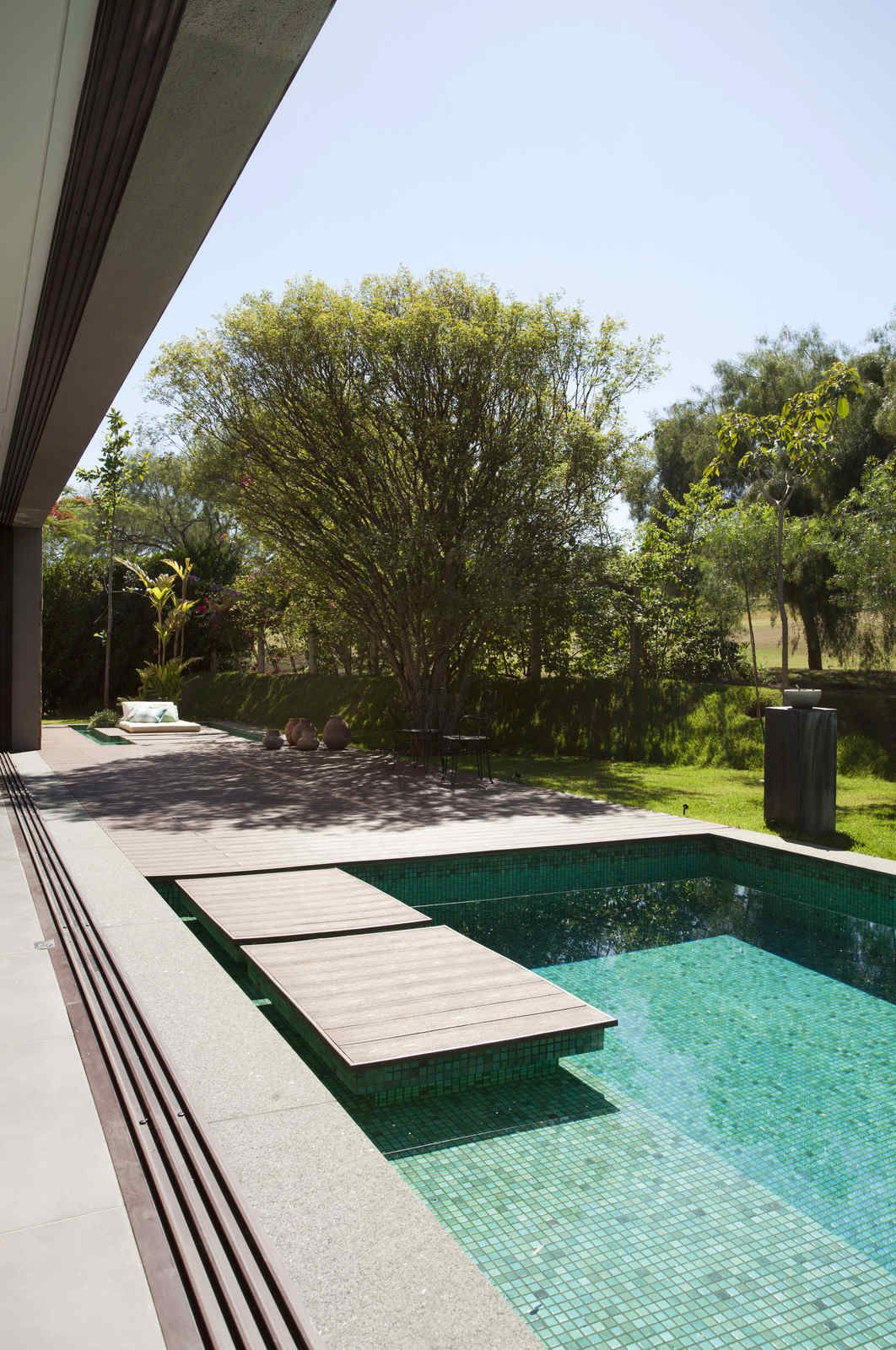 “A casa ficou afastada das construções vizinhas e não há bloqueios laterais. Sendo assim, a vista privilegiada foi amplamente explorada nos vãos abertos dos dois pavimentos; o inferior, com as áreas sociais, e o superior, com as íntimas. O desenho é o de uma casa-varanda, com aberturas de mais de 20 metros de comprimento no térreo, pelo qual se enxerga toda a propriedade.”