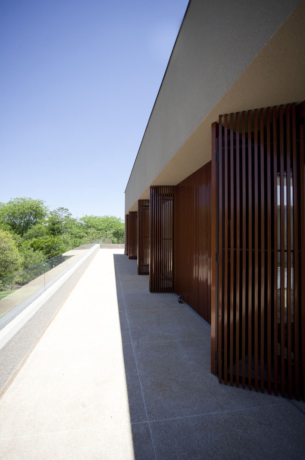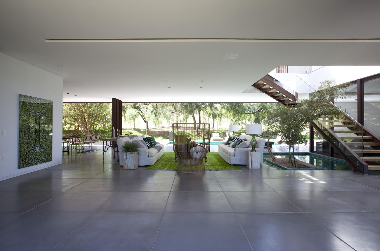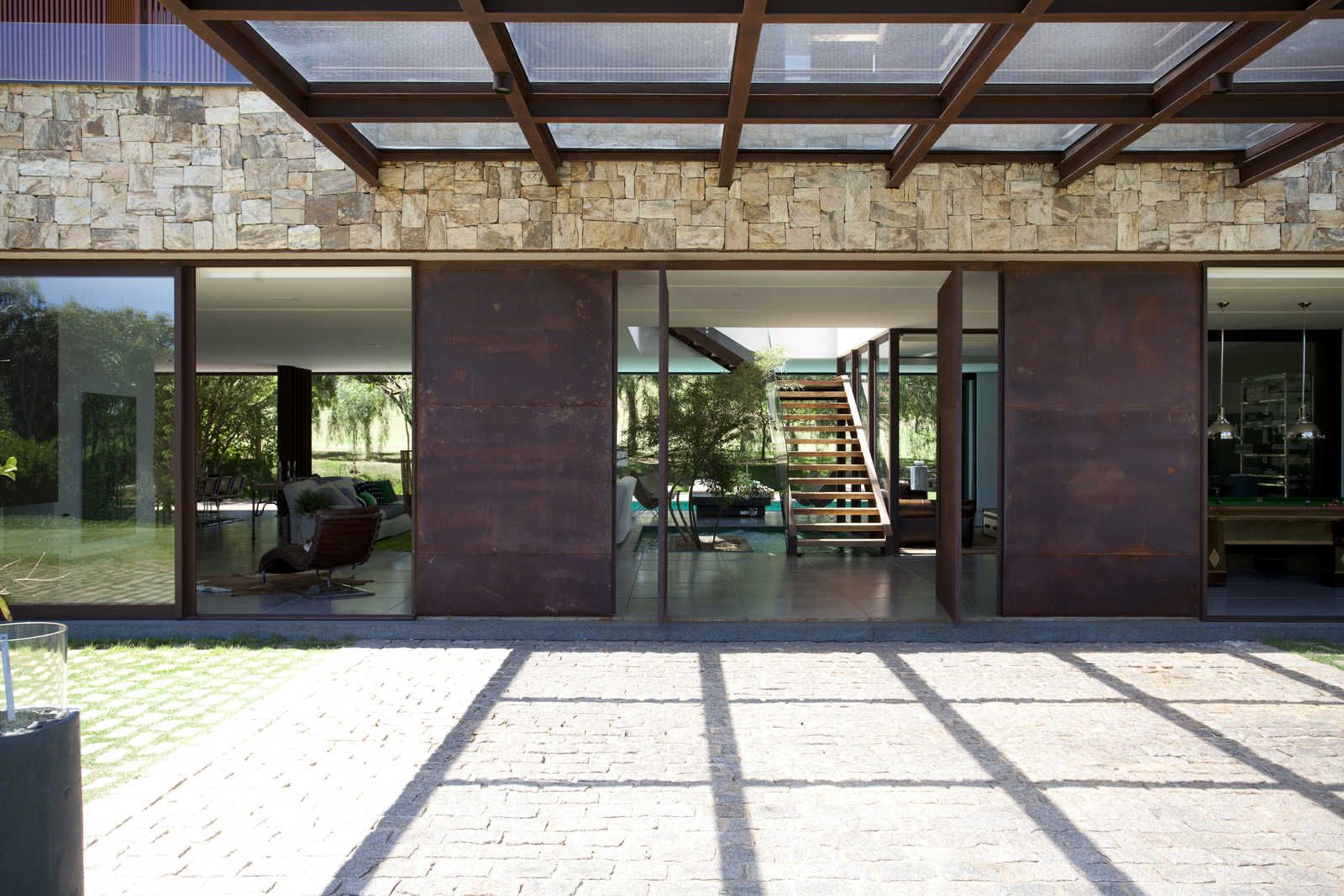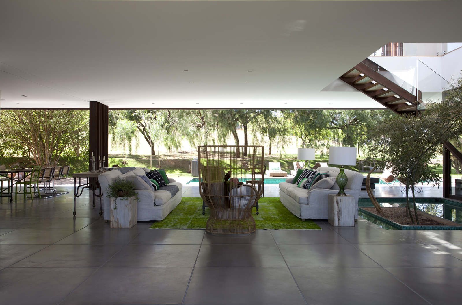 “A casa ficou afastada das construções vizinhas e não há bloqueios laterais. Sendo assim, a vista privilegiada foi amplamente explorada nos vãos abertos dos dois pavimentos; o inferior, com as áreas sociais, e o superior, com as íntimas. O desenho é o de uma casa-varanda, com aberturas de mais de 20 metros de comprimento no térreo, pelo qual se enxerga toda a propriedade.”