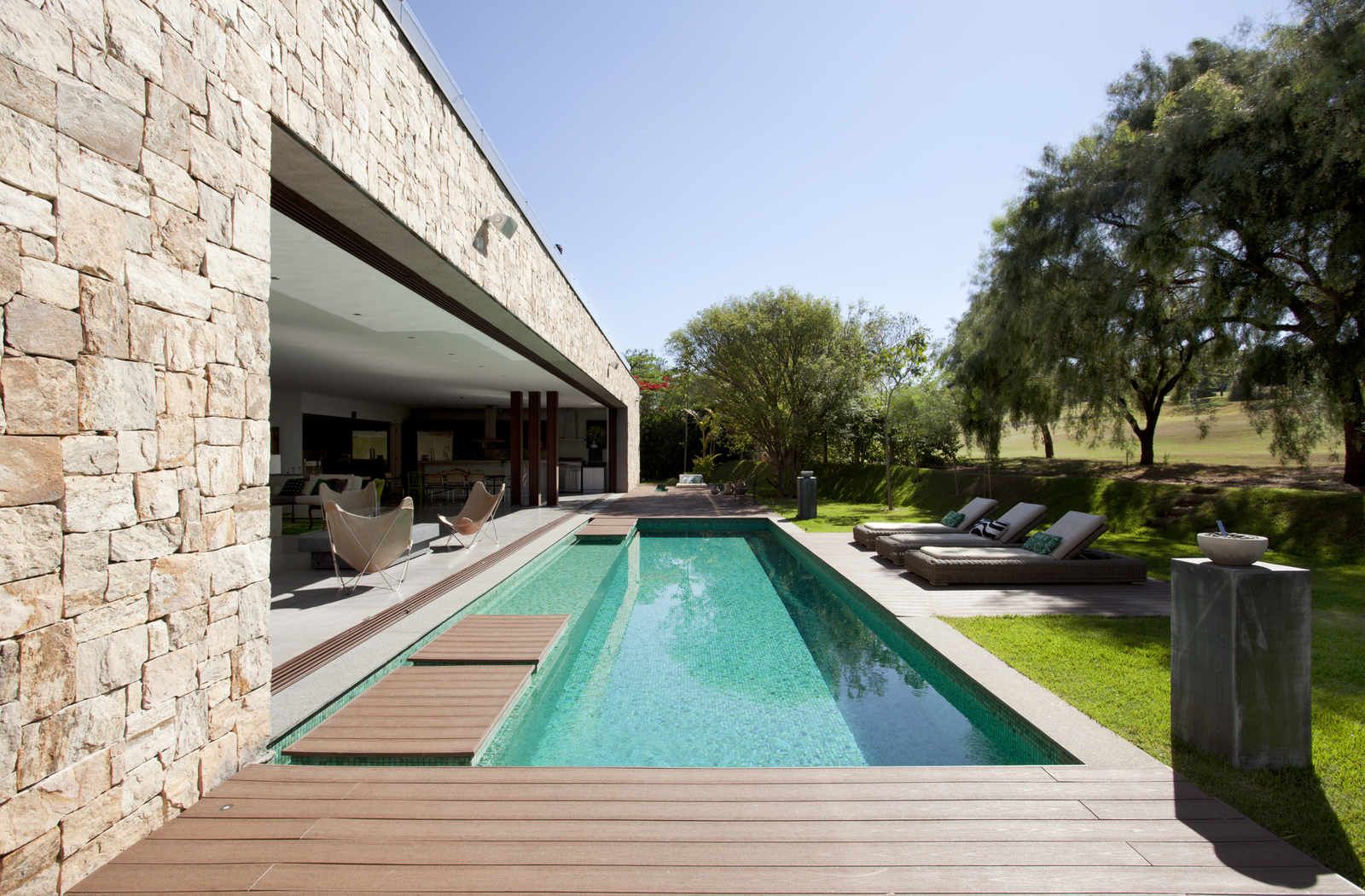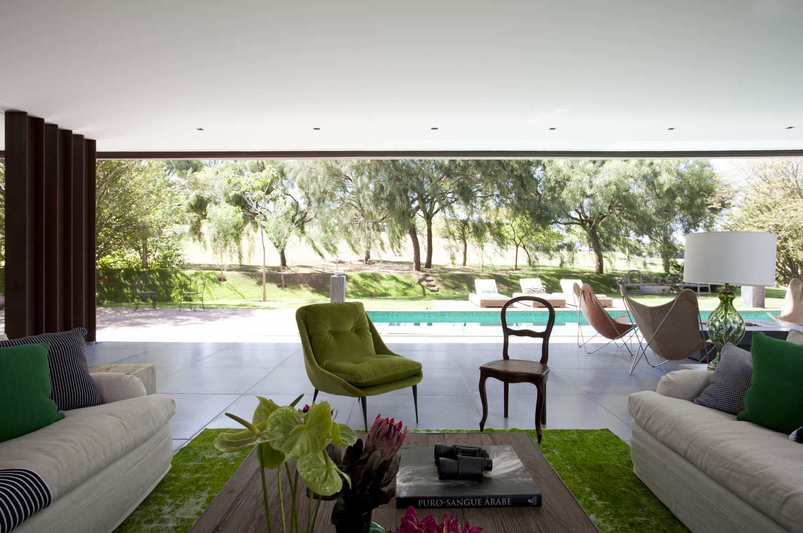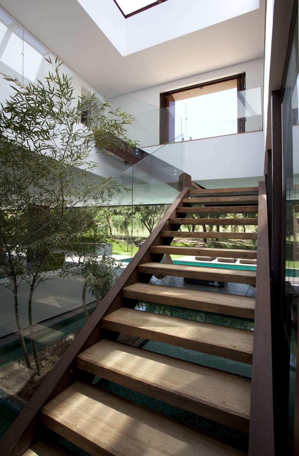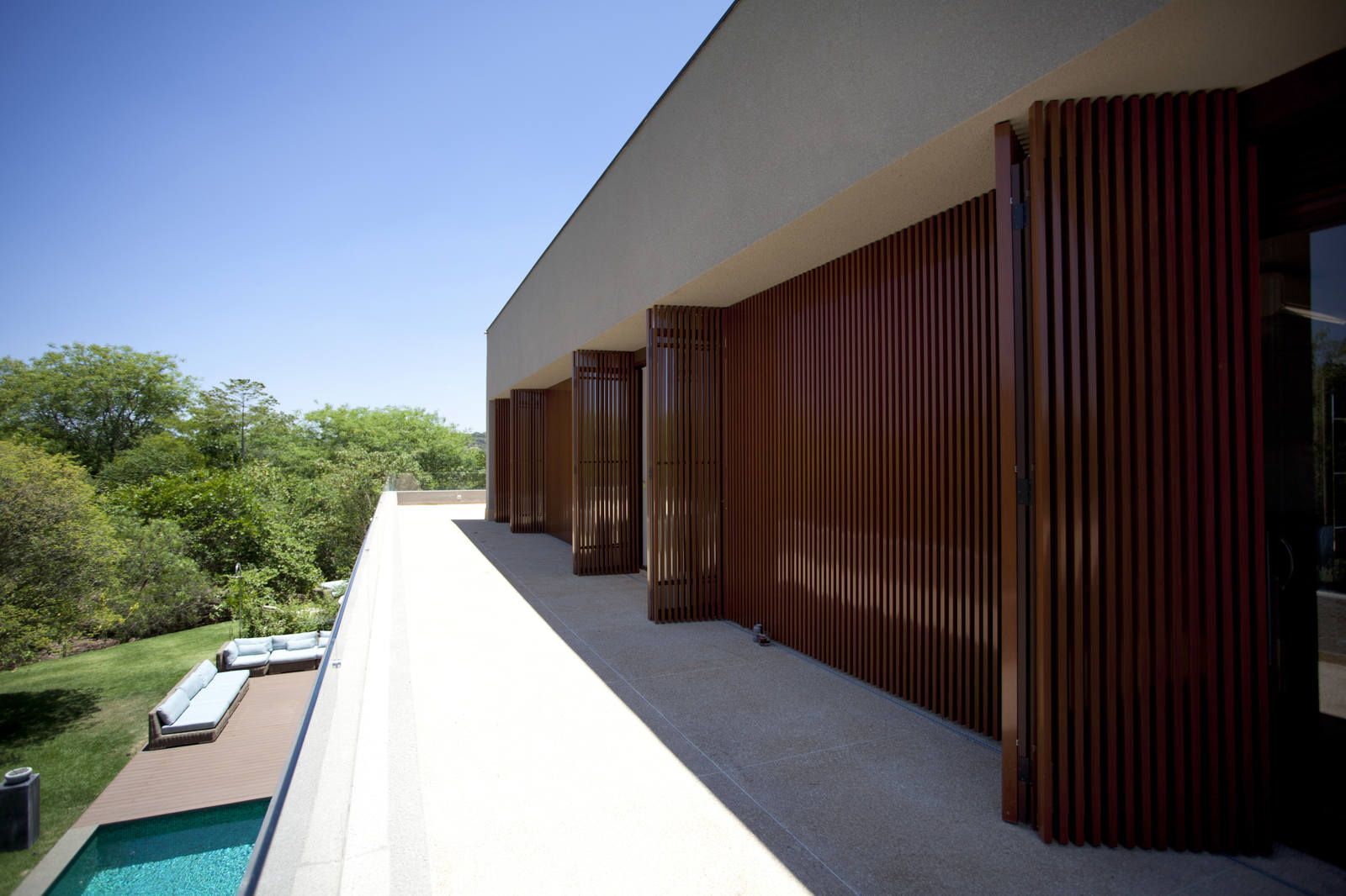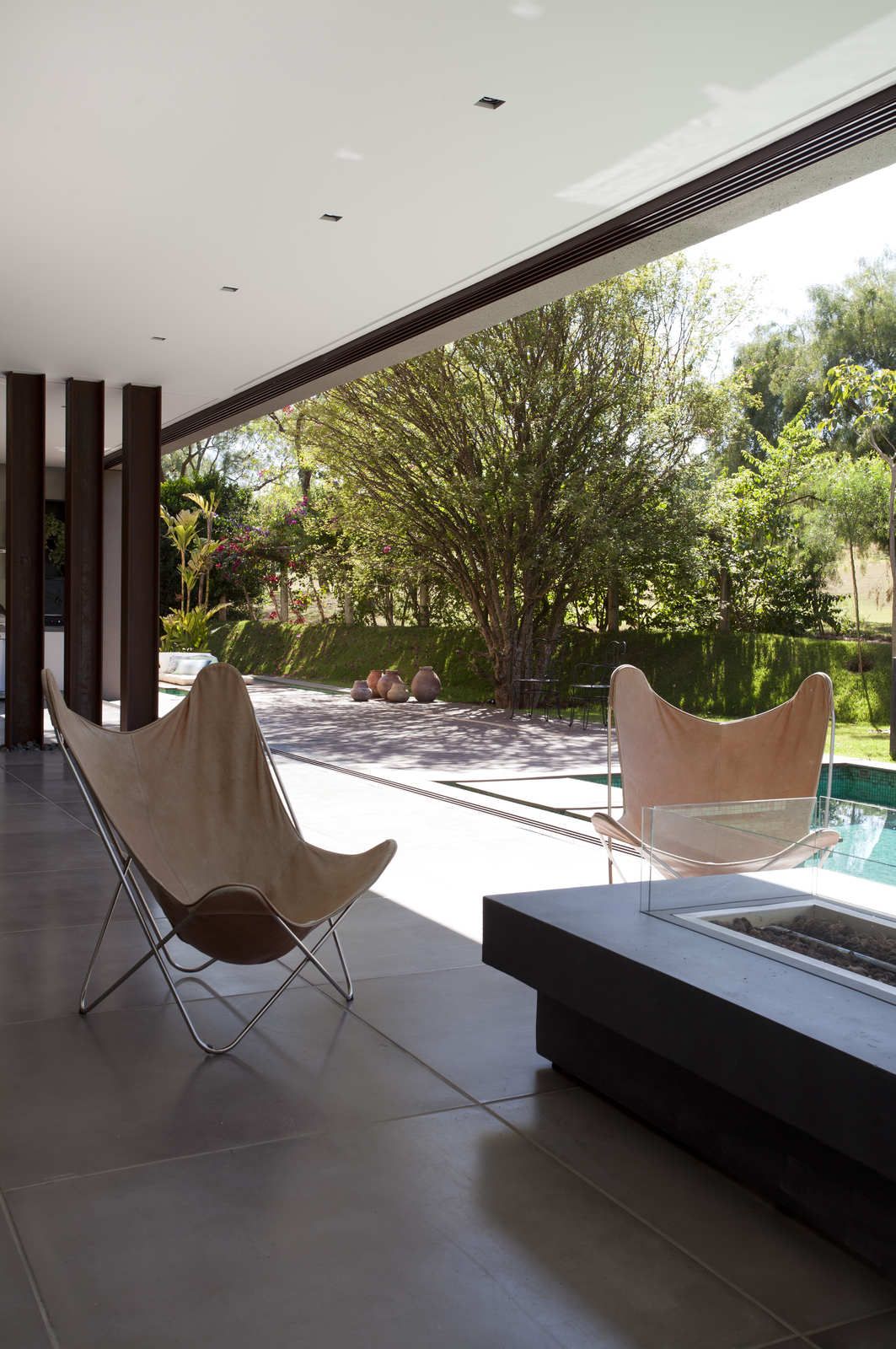 “A casa ficou afastada das construções vizinhas e não há bloqueios laterais. Sendo assim, a vista privilegiada foi amplamente explorada nos vãos abertos dos dois pavimentos; o inferior, com as áreas sociais, e o superior, com as íntimas. O desenho é o de uma casa-varanda, com aberturas de mais de 20 metros de comprimento no térreo, pelo qual se enxerga toda a propriedade.”