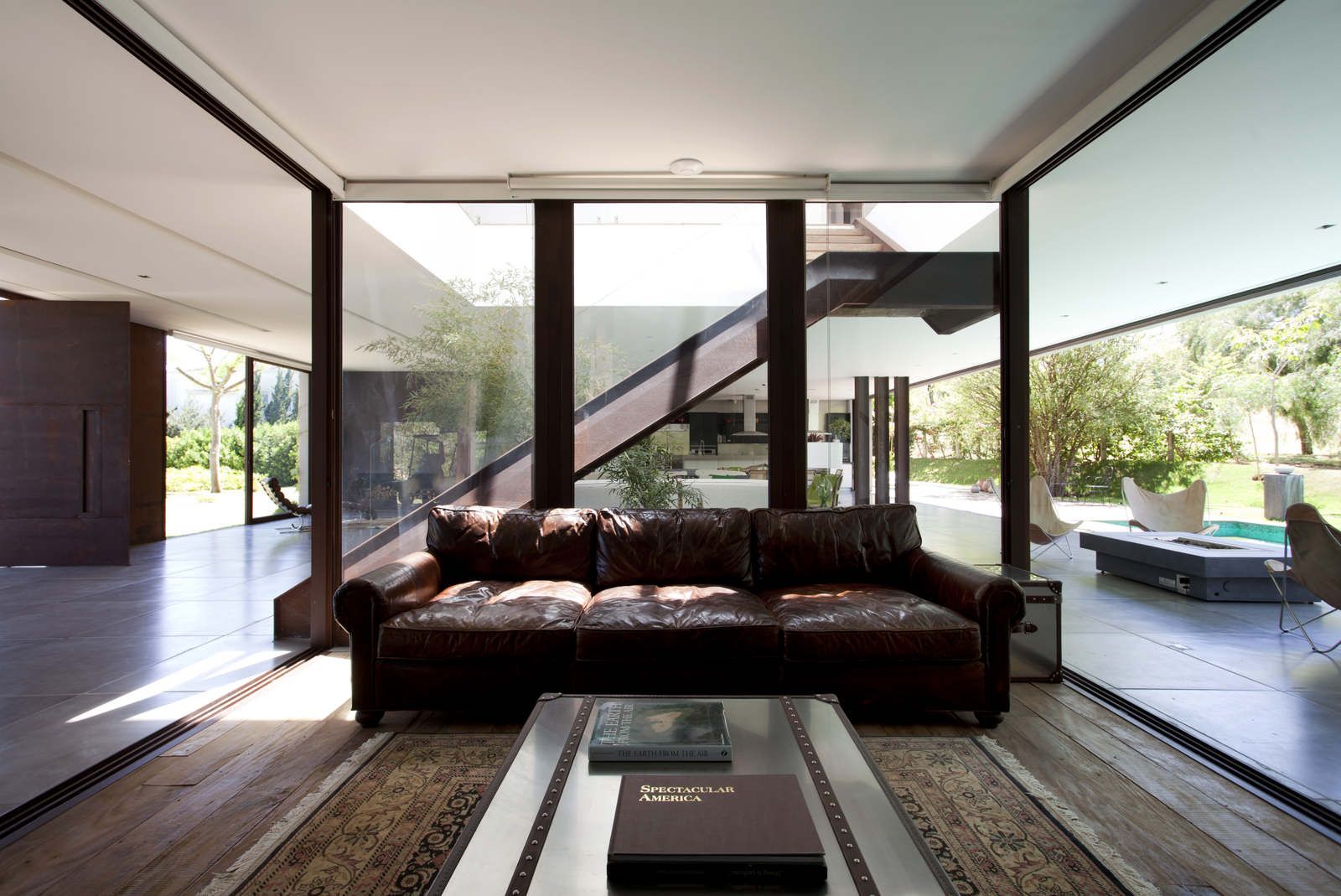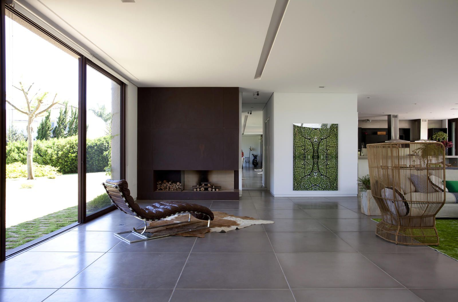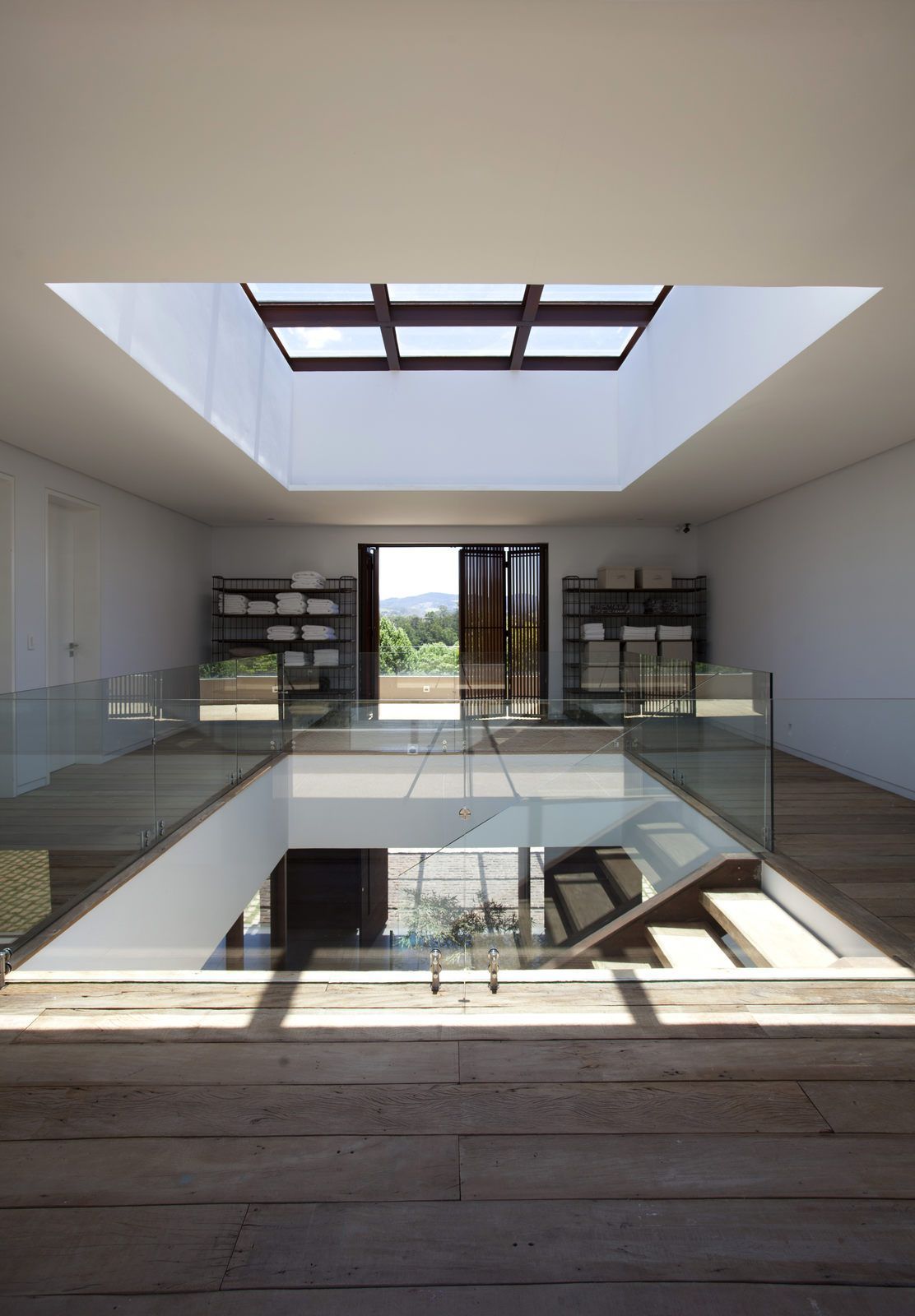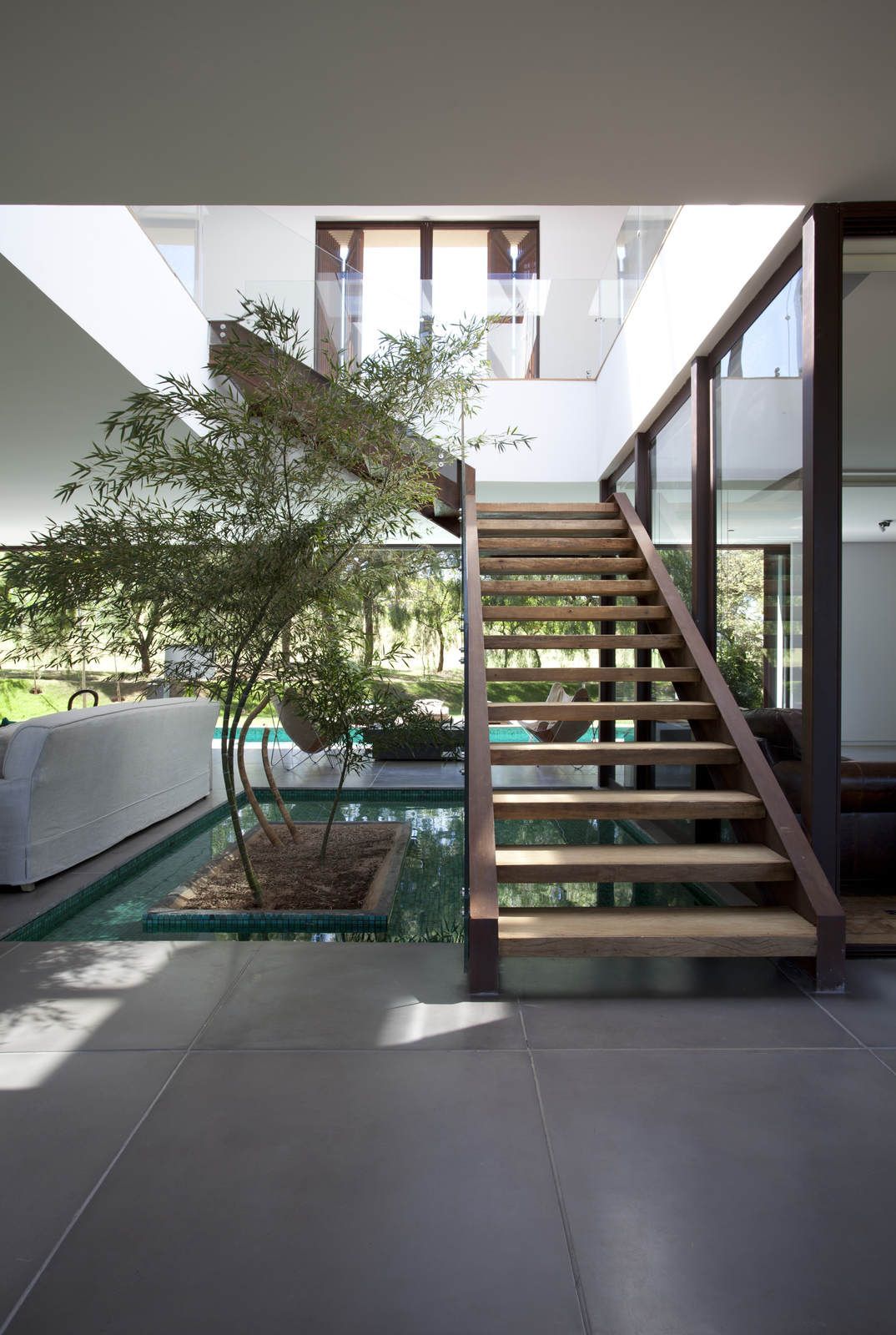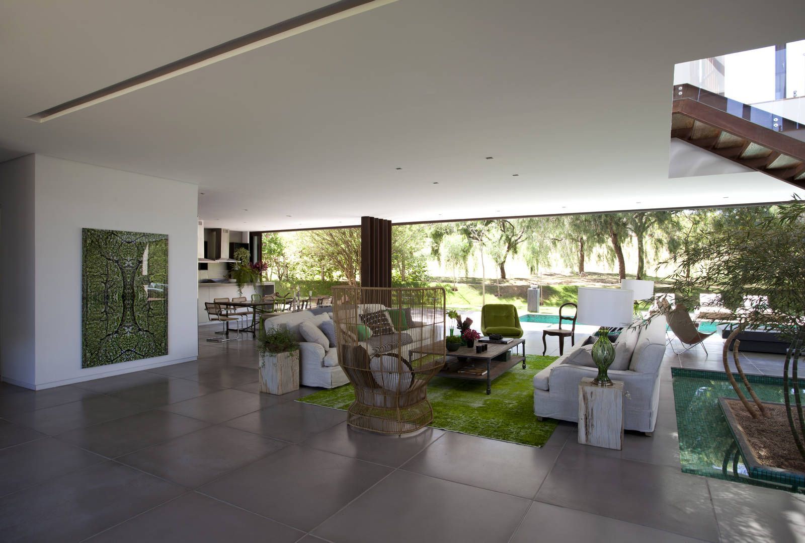 “A casa ficou afastada das construções vizinhas e não há bloqueios laterais. Sendo assim, a vista privilegiada foi amplamente explorada nos vãos abertos dos dois pavimentos; o inferior, com as áreas sociais, e o superior, com as íntimas. O desenho é o de uma casa-varanda, com aberturas de mais de 20 metros de comprimento no térreo, pelo qual se enxerga toda a propriedade.”