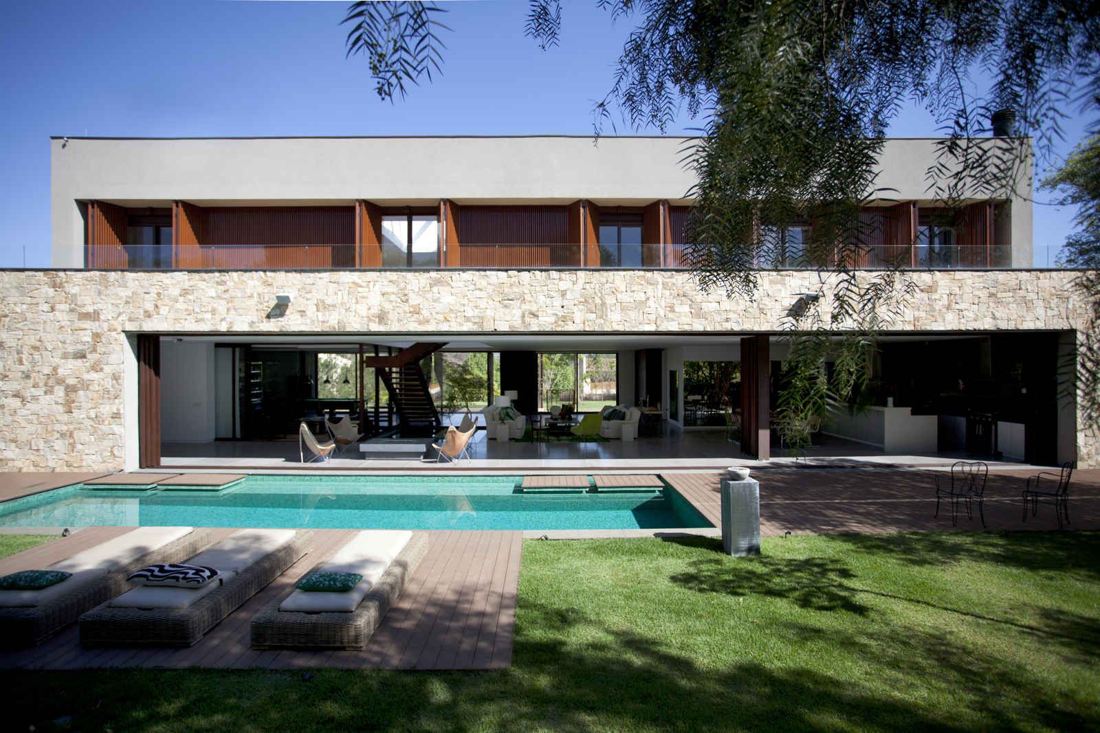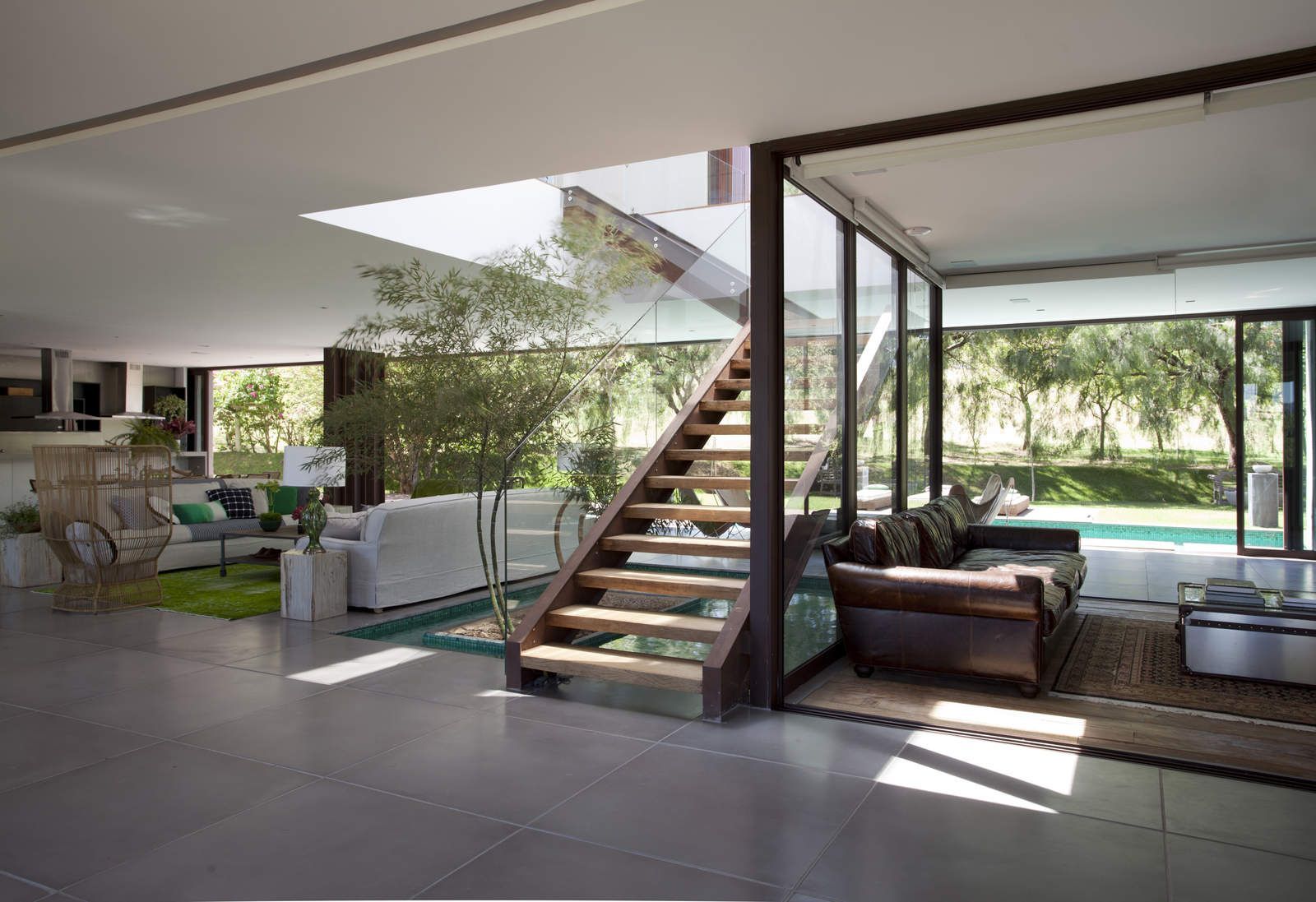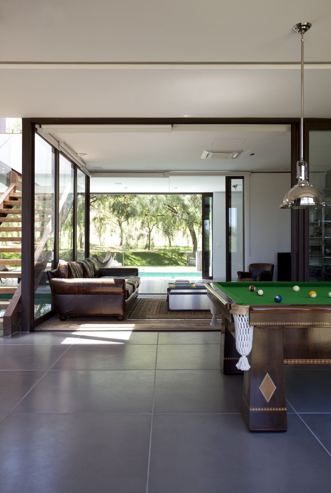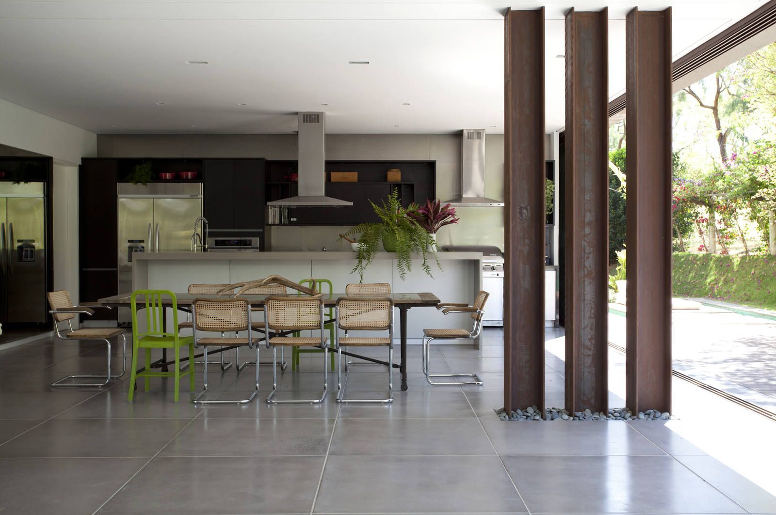 “A casa ficou afastada das construções vizinhas e não há bloqueios laterais. Sendo assim, a vista privilegiada foi amplamente explorada nos vãos abertos dos dois pavimentos; o inferior, com as áreas sociais, e o superior, com as íntimas. O desenho é o de uma casa-varanda, com aberturas de mais de 20 metros de comprimento no térreo, pelo qual se enxerga toda a propriedade.”
