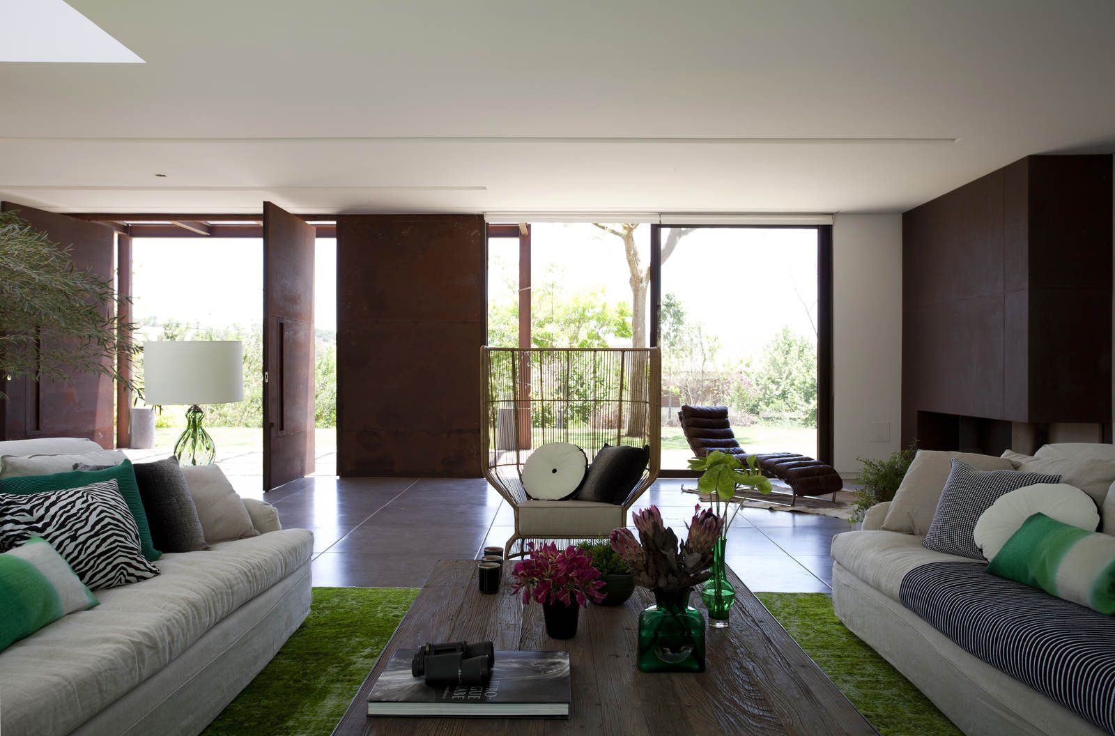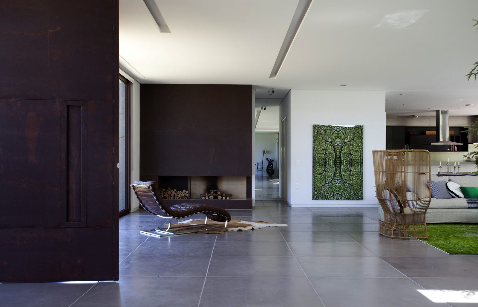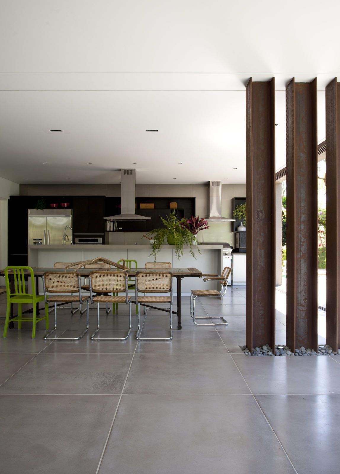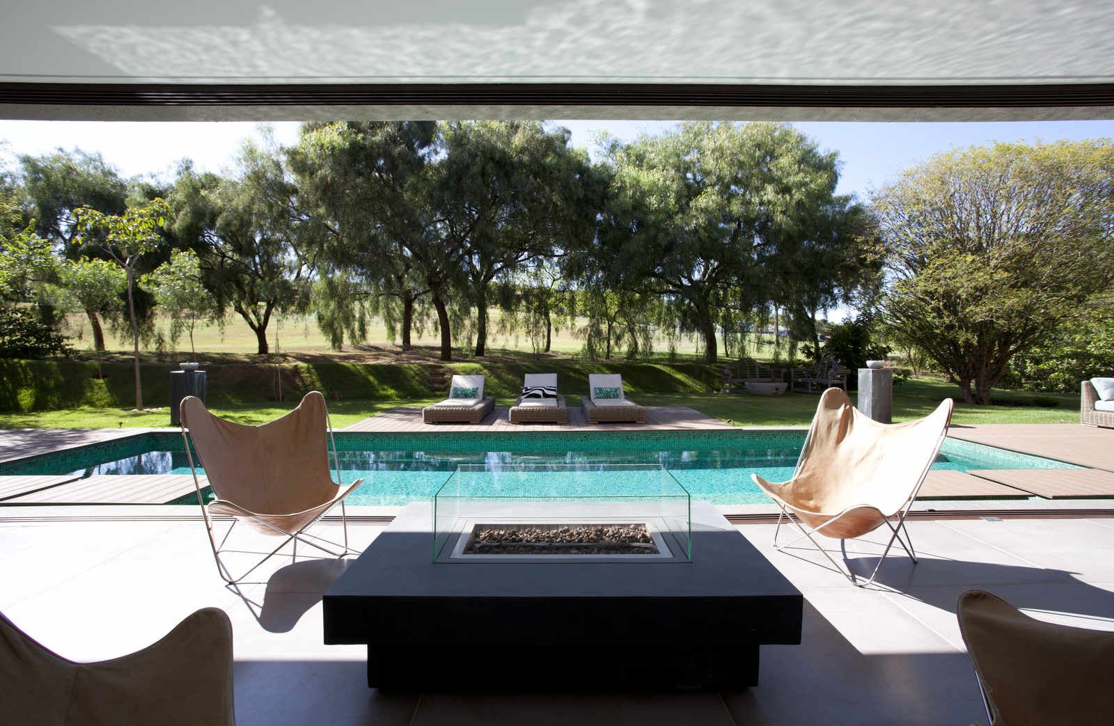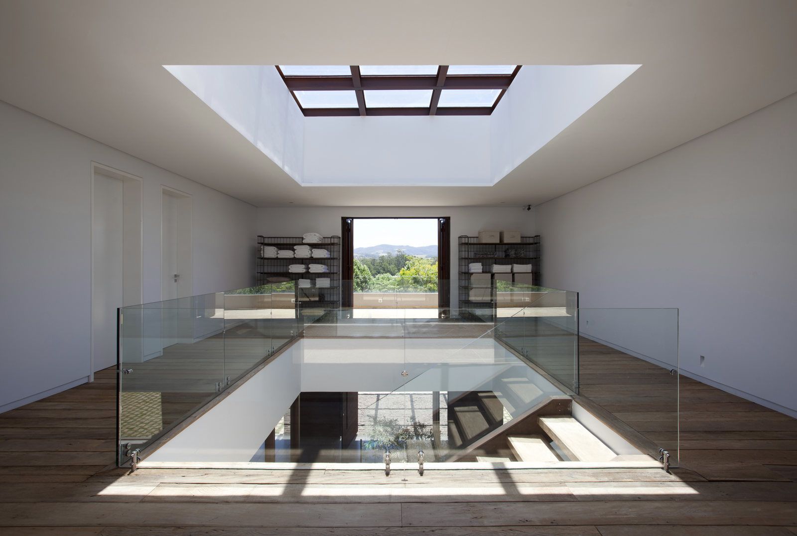 “A casa ficou afastada das construções vizinhas e não há bloqueios laterais. Sendo assim, a vista privilegiada foi amplamente explorada nos vãos abertos dos dois pavimentos; o inferior, com as áreas sociais, e o superior, com as íntimas. O desenho é o de uma casa-varanda, com aberturas de mais de 20 metros de comprimento no térreo, pelo qual se enxerga toda a propriedade.”